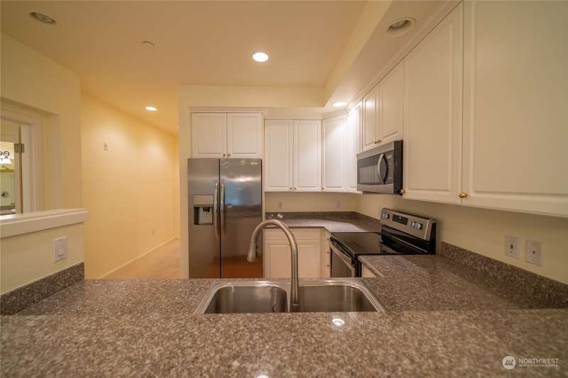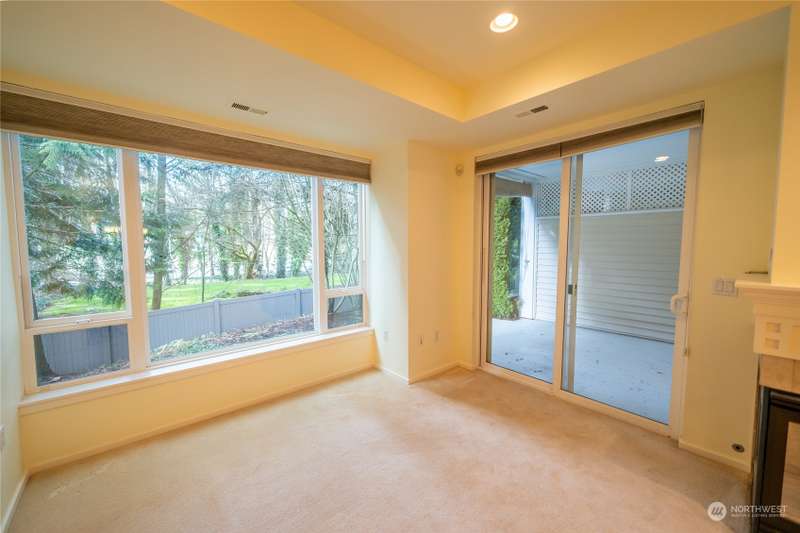 Lightly lived-in ground floor unit at The Arbors in Bellevue in the Kelsey Creek neighborhood. This quiet and secluded Condo features 2 bedrooms and 1.75 baths. Primary Bedroom is spacious with a walk-in closet and slider to back patio. The second bedroom is located in the front of the unit next to a full hallway bath. An office/den could be used as a 3rd bedroom. Kitchen has granite countertops and stainless appliances. Living room features a gas fireplace and large windows and sliding door that allows for some wonderful natural light. 2 deeded parking spots include underground parking and single care detached garage that could be used for additional storage.