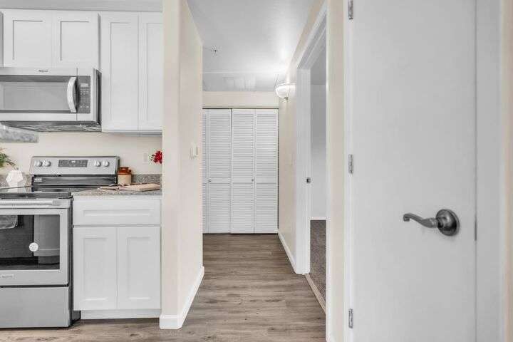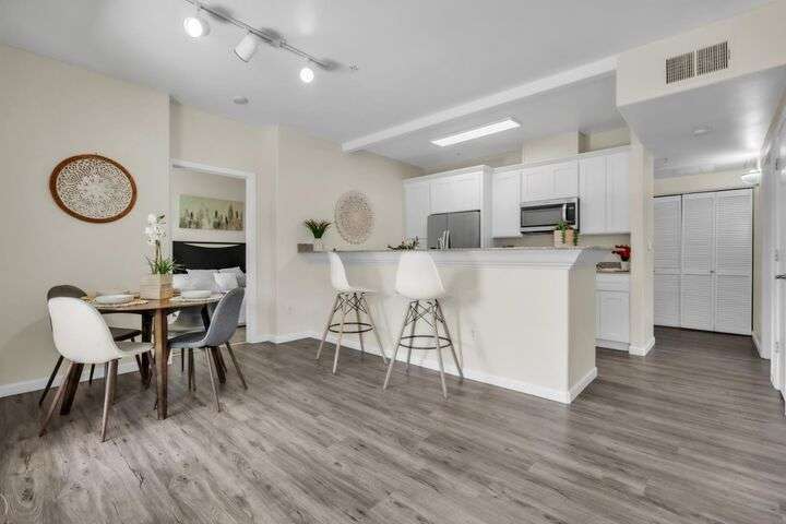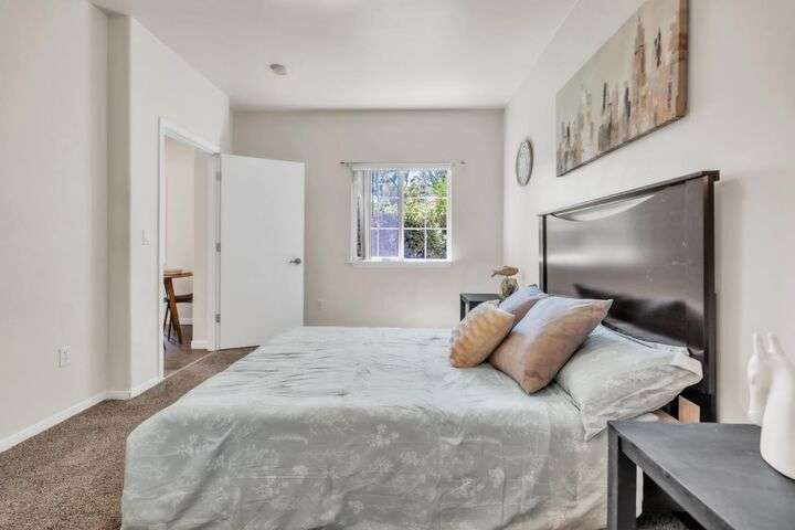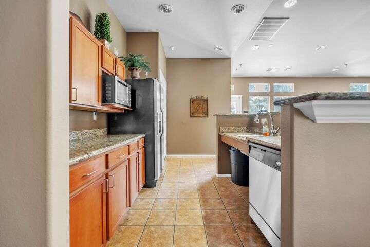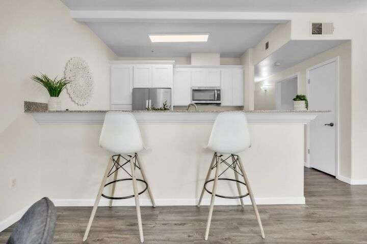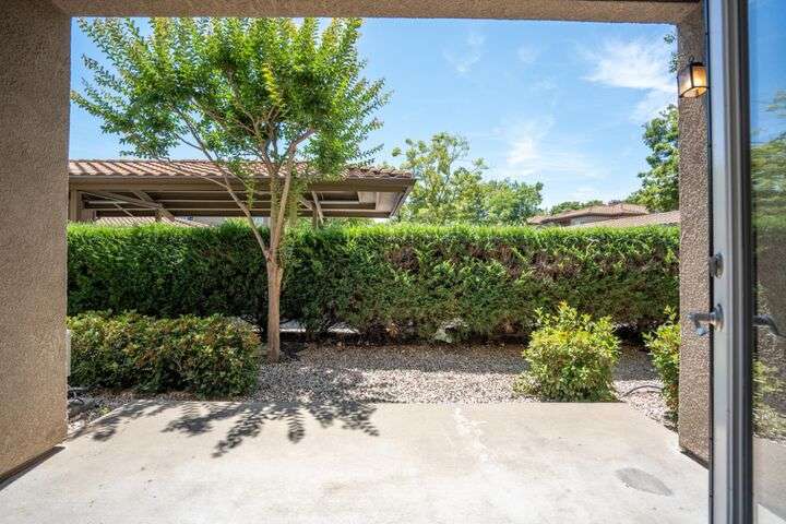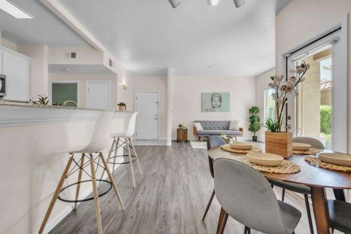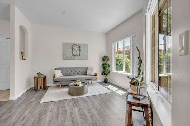 Welcome to resort-style living in the highly sought-after Bella Rose gated community. This beautifully updated 2-bedroom, 2-bathroom ground-level condo offers 958 sq ft of thoughtfully designed living space, combining comfort, style, and convenience. The open-concept layout is filled with natural light and features luxury vinyl plank flooring, neutral two-tone paint, and elegant window coverings throughout. The recently updated kitchen includes stainless steel appliances and a refrigerator, making this home completely move-in ready. Step outside to your private patio and enjoy tranquil views of the community pool and lush landscaping. Additional features include two assigned parking spaces and a detached private storage unit. Residents benefit from a secure gated entry, pool, spa, clubhouse, and fitness center. Ideally located just minutes from the new Costco, top-rated schools, shopping, restaurants, and with easy freeway access, this home offers exceptional value for anyone seeking low-maintenance living in a connected and peaceful setting. Don't miss the chance to make this charming condo your own.