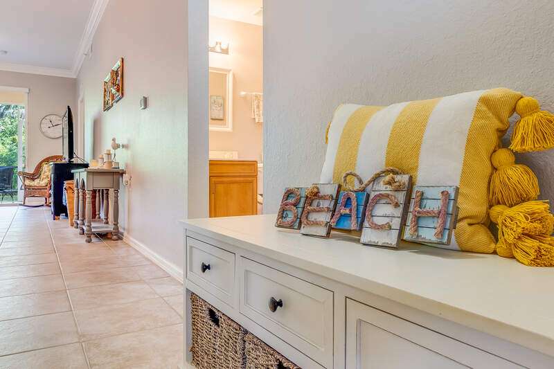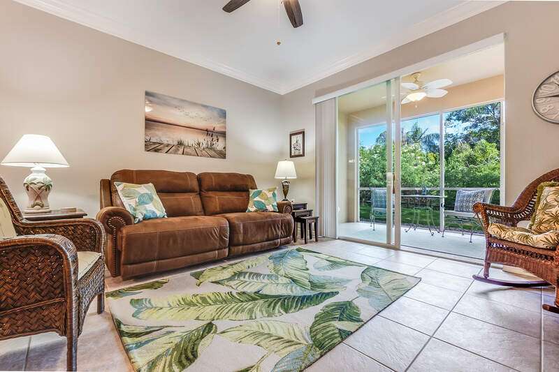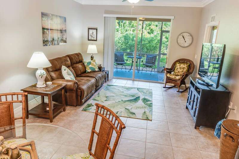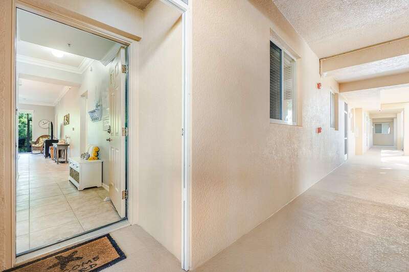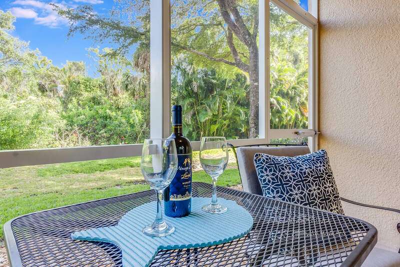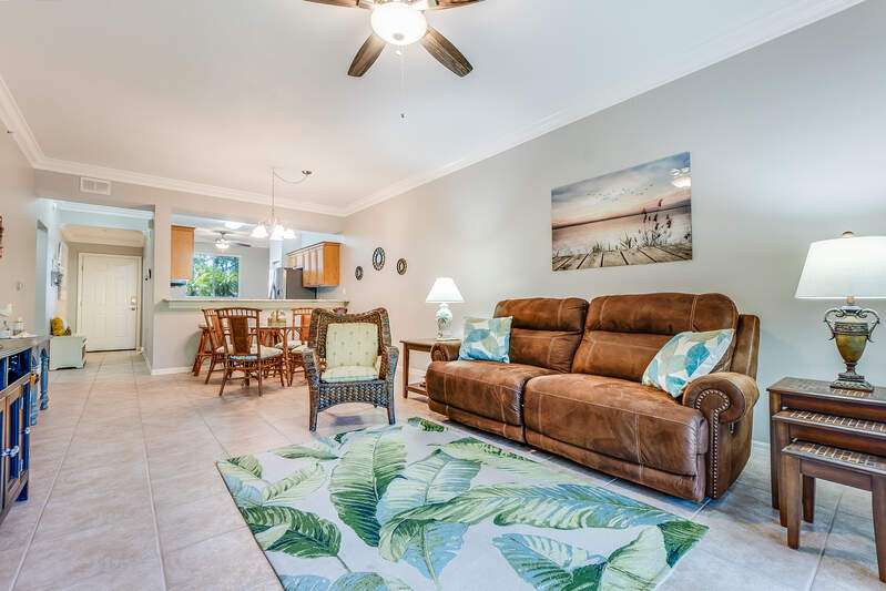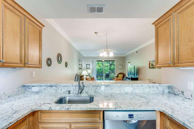 Turnkey First-Floor in Terraces at Riverwalk - Move-In Ready! Welcome to effortless Florida living in this beautifully maintained first-floor condo in the highly sought-after Terraces at Riverwalk community. Ideally located just minutes from stunning beaches, fantastic dining, shopping, and entertainment, this home is perfect for full-time residents, seasonal visitors, or investors looking for a prime rental opportunity. Step inside to a bright and open layout featuring a completely stocked kitchen with elegant marble countertops, rich wood cabinetry, and stainless-steel appliances, including a brand-new stove and a Bosch dishwasher. The refrigerator, microwave, and dishwasher were all replaced in 2019. Luxury vinyl flooring in the bedrooms ensures easy maintenance-no carpet anywhere! The spacious master suite offers a king-size bed and a custom vanity in the ensuite bath, while the guest room includes a queen bed-perfect for family and friends. Extra shelving in all closets and the laundry room adds great storage options, plus there's an oversized exterior storage closet with built-in organization conveniently located right across from your front door. Step out onto your reimagined lanai and take in the peaceful preserve view, offering a serene retreat to relax and unwind. Enjoy peace of mind with impact windows throughout and knowing that all major systems have been updated, including a new hot water heater (2019) and a new AC unit (January 2022). Even better, this property is located in a NO FLOOD ZONE! Previous owner also had installed a radon system located in the primary closet. The community has undergone recent upgrades, including a new roof, fresh exterior paint, brand-new carports, and beautifully maintained landscaping. The assigned covered carport (#052) ensures convenient parking, with plenty of additional guest parking available. The resort-style amenities include a freshly updated clubhouse, a heated pool, and a welcoming community with plenty of activities. Sewer and water are included, making this home even more affordable and hassle-free. Plus, with 12 leases allowed per year (30-day minimum), this condo is also a fantastic investment opportunity-whether for seasonal or annual rental income! Move-in ready, pet-friendly, and packed with upgrades-this is the perfect place to call home!