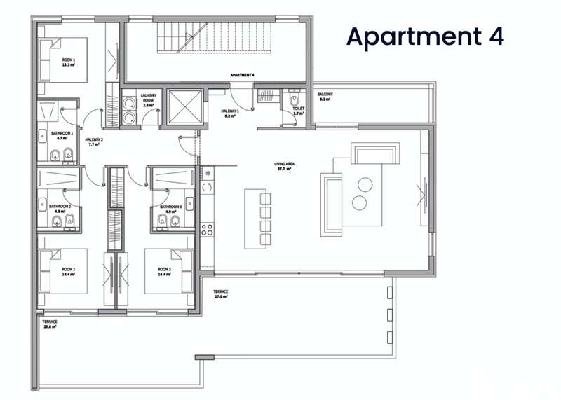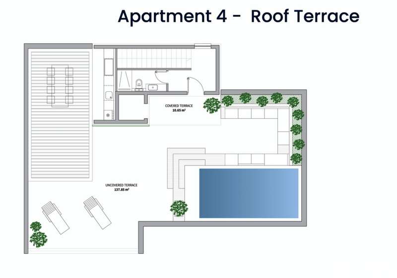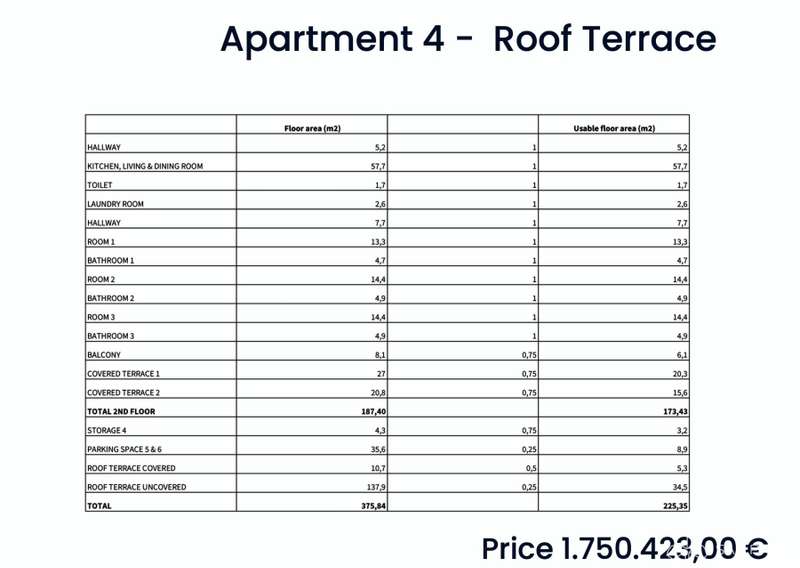 Apartment S-4B - 2nd floor + rooftop terrace - living area 131.43 m2 (3 bedrooms + 3 bathrooms + WC) + balcony (8 m2) + covered terraces (47 m2) + storage (4 m2) + rooftop terrace with swimming pool (147 m2) + two outdoor parking spaces no. 5 and 6; net calculated area 225.35 m2 = 1,750,423.00 EUR
