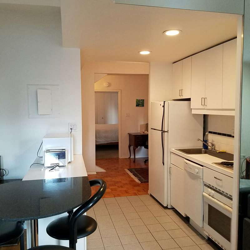 THIS VERY SPACIOUS AND BRIGHT FURNISHED ONE BEDROOM IS ON THE 15TH FLOOR WITH SOUTH AND WEST EXPOSURES. THE APARTMENT IS FURNISHED WITH A KING SIZE BED AND TV, DESK, BREAKFAST BAR WITH TWO CHAIRS AND LIVING ROOM WITH COUCH, TWO CHAIRS, COFFEE TABLE, SIDE TABLE AND TV.