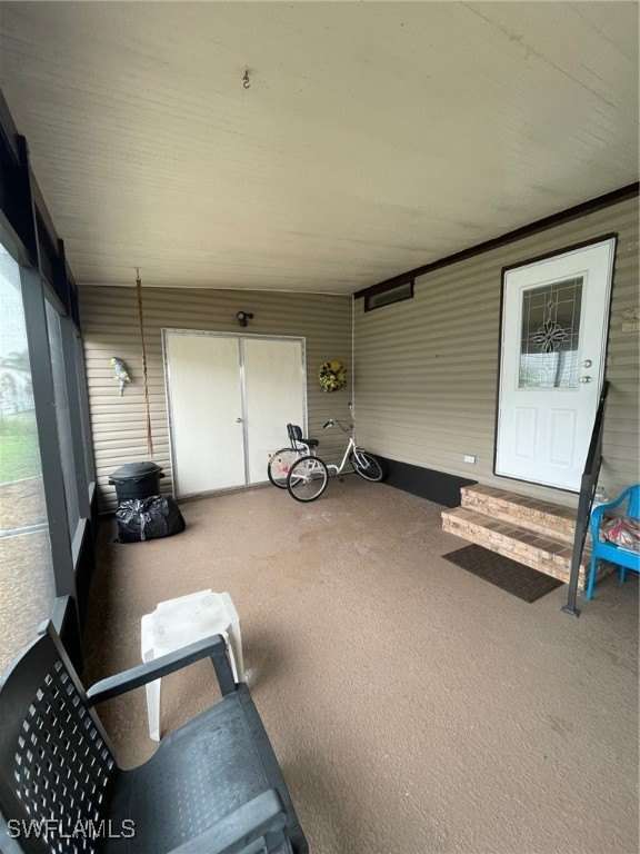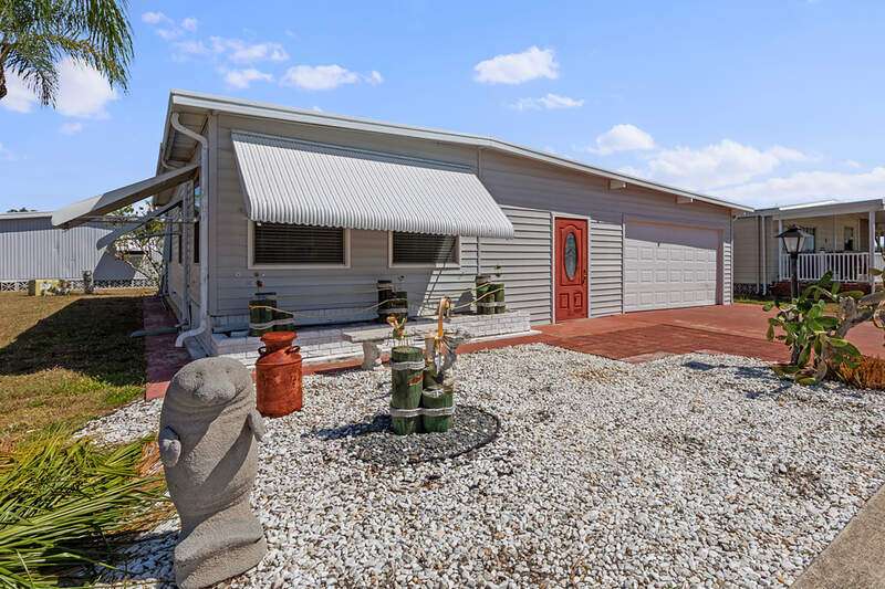 Carefree living at its finest! Beautifully maintained Great room unit with cathedral ceilings. New Sunroom for you to enjoy coffee or a great game of cards with friends. Prefer to hang outside? Enjoy the wonderfully inviting screened room or the open front porch to enjoy watching your neighbors bike by. LOTS of extra cabinets and smooth top counters in this kitchen - perfect for a buffet meal or those extra appliances for special occasions. Then of course you can eat inside at the kitchen nook or take your meal out to enjoy the weather. Main suite has cathedral ceilings and the main bath has a LOT of light (skylights NEW 1/26/25) and tall updated counters with 2 sinks. For the handy man/woman, let them know that there is a workshop just for them! There is electric, available storage and an in wall a/c unit to use. Know that your car is shaded from the elements with the carport and decorative brick siding. Vinyl and tile flooring, plant shelves. LOTS of updates! 2023 - New tie downs in front and rear. A/C - 2019 (with an annual service contract in place) They have pest service in place with a yearly contract as well (transferable) Kitchen & laundry redone in 2018. 2019 Screen room installed, 2020 - Main bedroom remodeled. 2021 New wood blinds in all windows, 2023 New shingle roof installed - 2024 new sun room, new siding on 3 sides and 13 NEW WINDOWS. Partially furnished. This is a 55+ community with an active group of people. Three pools and fantastic access to all that the area has to offer! Such a quaint community and close to shopping, restaurants, entertainment and main roads. Flood insurance not required (at this time) in this area of the park.