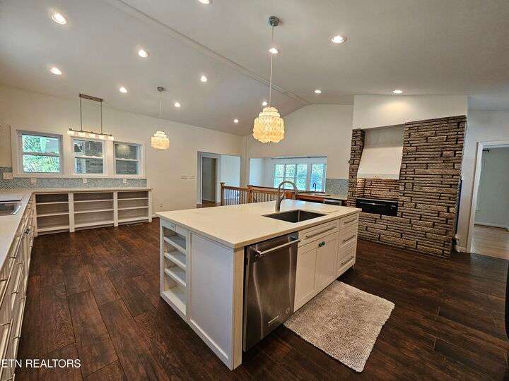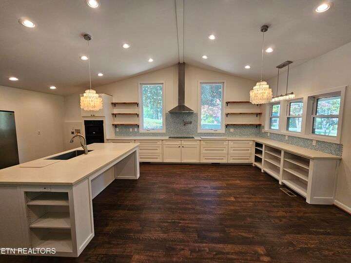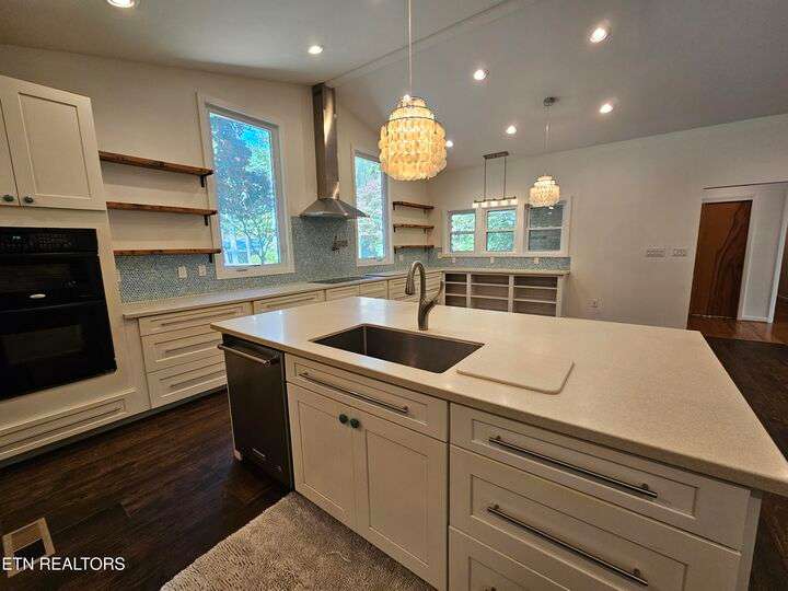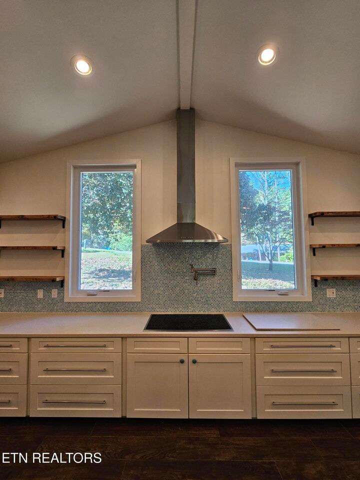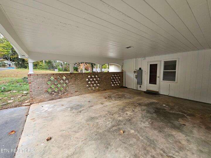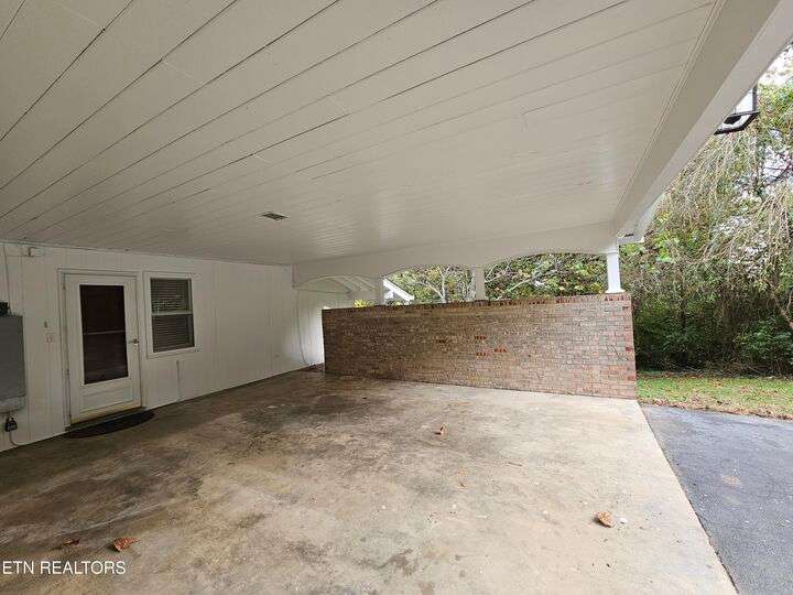 Spacious Mid-Century Modern Rancher on the west end of Oak Ridge. Welcome to this spacious and stylish Mid-Century Modern 4-bedroom, 2-bath Rancher with a finished walkout basement, located in the desirable west end of Oak Ridge. This home blends classic charm with unique character and modern convenience. Step inside to find beautiful original hardwood floors, kitchen area with soaring cathedral ceiling, and large casement windows that flood the home with natural light. The massive custom kitchen is a true showpiece—featuring stainless steel dishwasher & refrigerator, a unique vintage indoor grill, a huge island perfect for casual dining or meal prep, and an abundance of solid-surface countertops and cabinet space. The oversized eat-in kitchen is ideal for entertaining and flows seamlessly into the formal dining room and living area. The main level hosts three bedrooms, all with hardwood flooring, and a full bathroom, large linen closet with laundry chute. The walkout basement offers a fourth bedroom or office, a second full bath, wood-burning fireplace, utility room, and separate storage room—plus access to the outdoor patio and two additional entry/exit doors for added convenience. Outside, enjoy the privacy of a partially wooded backyard, a large front yard allows the home to be situated back from the road to lend a peaceful, serene setting all around. Large side entry- two car carport could easily be enclosed and converted into a garage if you desire. This home has great bones and is practically move-in ready, while still allowing plenty of opportunity to personalize and add a few changes if needed to make it your own. Don't miss out on an opportunity to own a spacious home at an affordable price in a city that continues to thrive and is recognized for its great school system and convenience to shopping/outdoor activities.