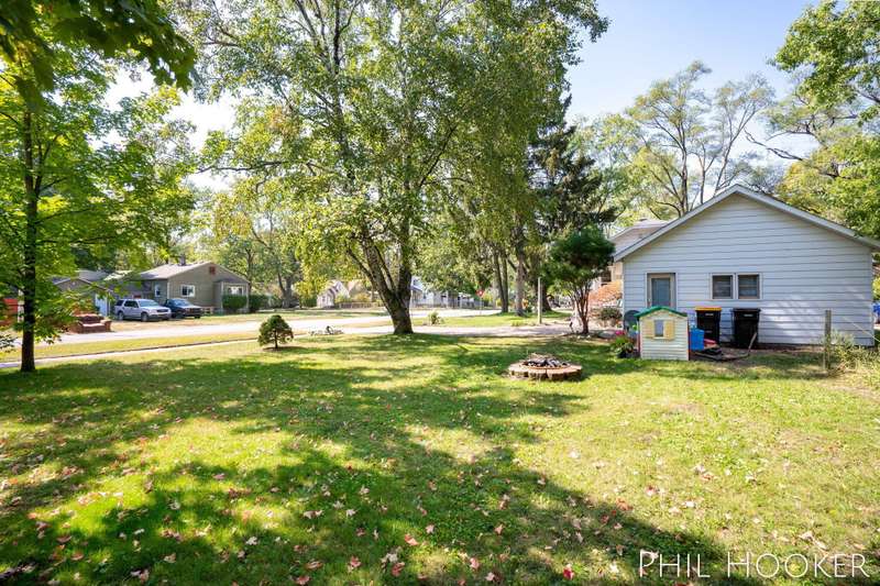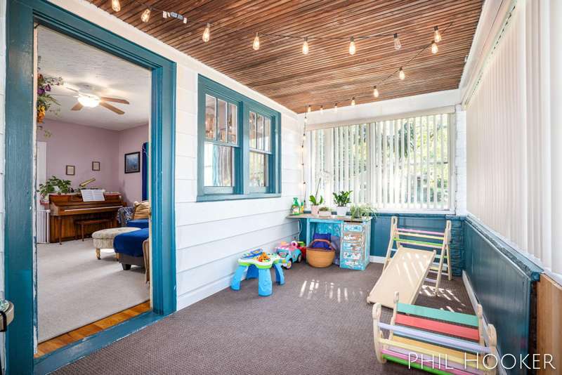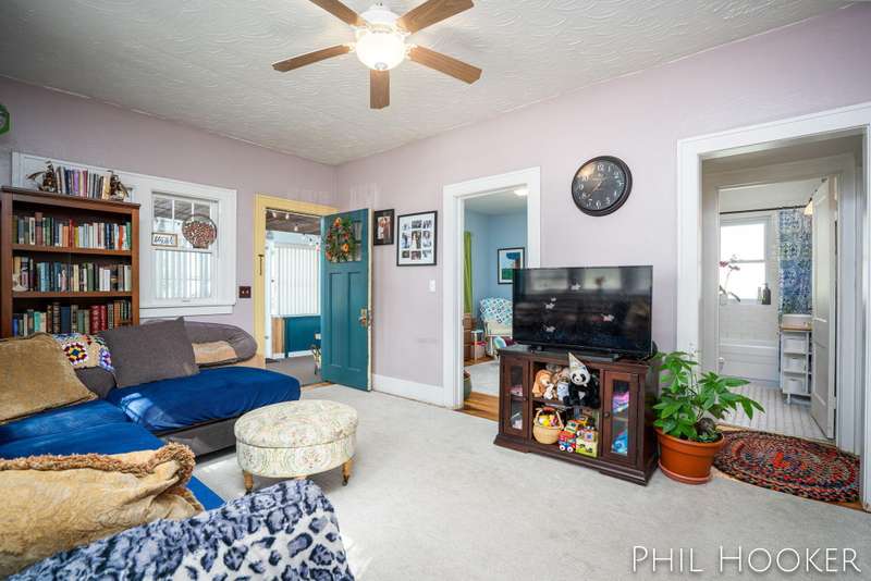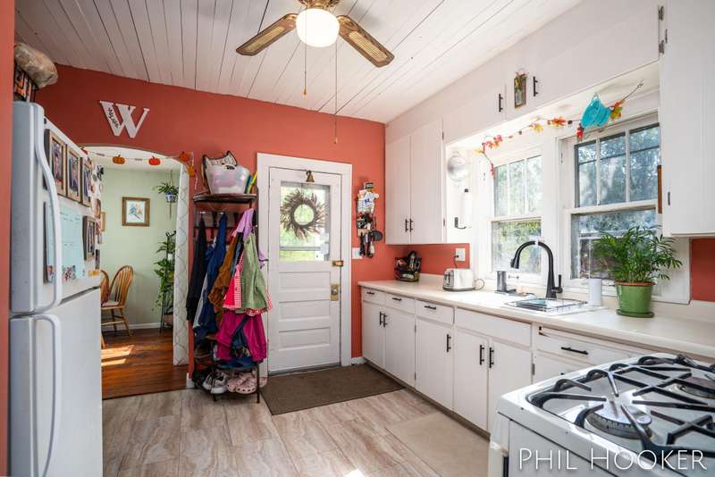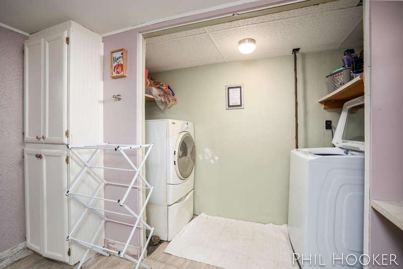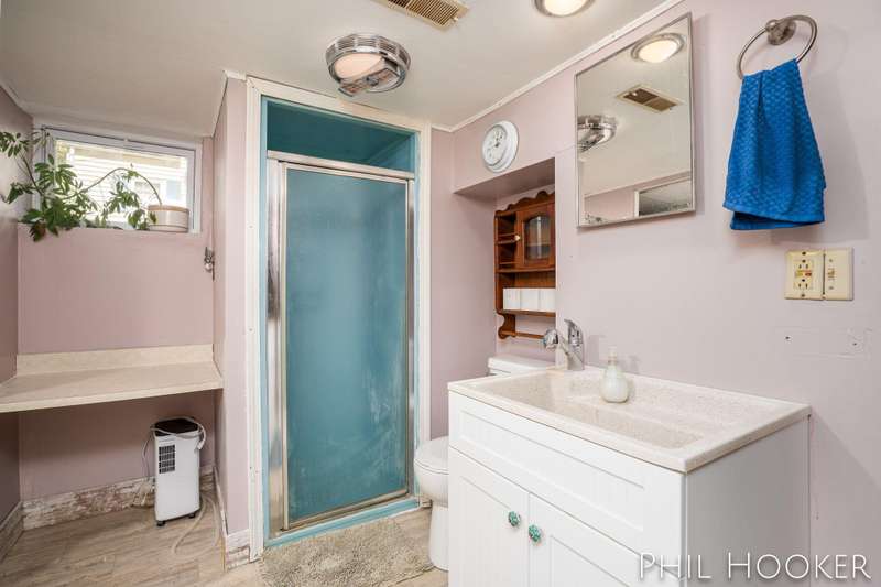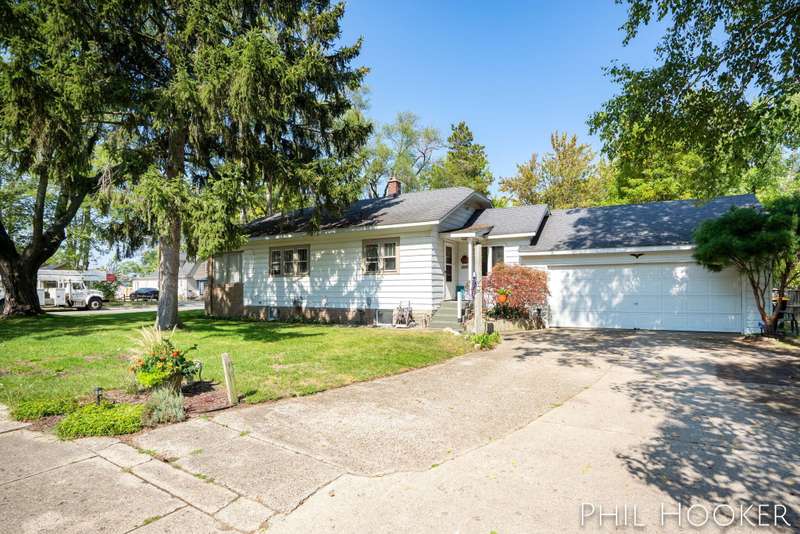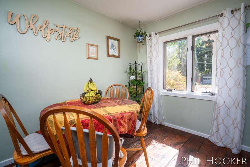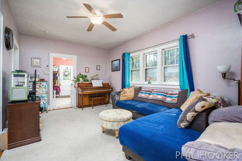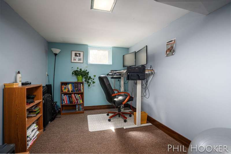 Cute Bungalow refreshed with a primary bedroom, second bedroom, living room - all with hardwood flooring under the rugs/remnants; then also a full bathroom with a new window, a dining room with wide plank wood flooring and a nice 3 season covered front porch. Basement has a comfortable family room, full bathroom, laundry closet and a reasonable size office; 4 new windows in basement that are 27.5' x 20'. 2 stall attached garage (use opener) with larger side yard and small red barn for storage. Updated Home Acres Park is just minutes away - huge set of play equipment, patio with free wifi, skate board park and open space!