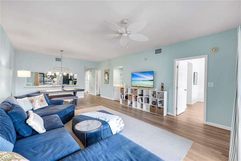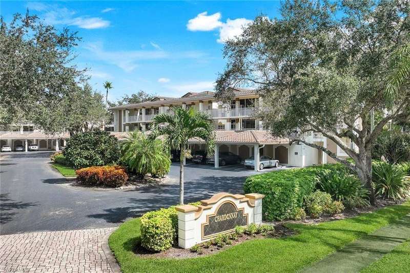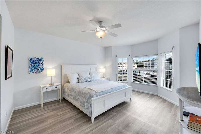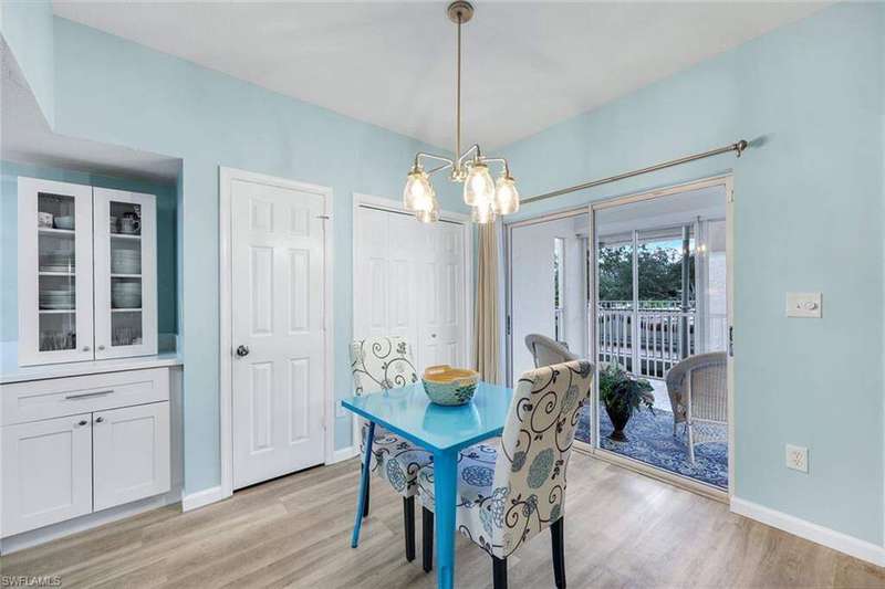 This unit has tons of updates and upgrades. Most furniture can be included if buyer chooses. Wonderful spacious residence with serene coastal decor that creates a calm retreat with sparkling lake views. There are 2 screened lanais allowing coastal breezes to flow through. The beautiful luxury vinyl wood plank flooring has warm tones. The new kitchen has white shaker cabinetry, quartz counters, stainless steel appliances and a tray ceiling with accent lighting and crown molding. This modern design has the popular open shelving concept and glass cabinetry. A large pantry closet has enough extra space for storing your small appliances too. The owner's suite has lovely lake views, large walk-in closet and vanity with dual sinks, quartz counters and a separate shower and soaking tub. The guest bedroom has ample closet space and a refreshed bathroom with new cabinetry and quartz counters. The main lanai has storm shutters and gorgeous lake views. The second lanai off the kitchen has colorful skies at sunset and has storm shutters too. It is an easy walk to the community pool and hot tub. Chardonnay is nestled in the highly sought after neighborhood of the Vineyards. Close to a large variety of shopping, dining, Naples' white sandy beaches, medical facilities and I-75 for traveling. This one checks all the boxes.