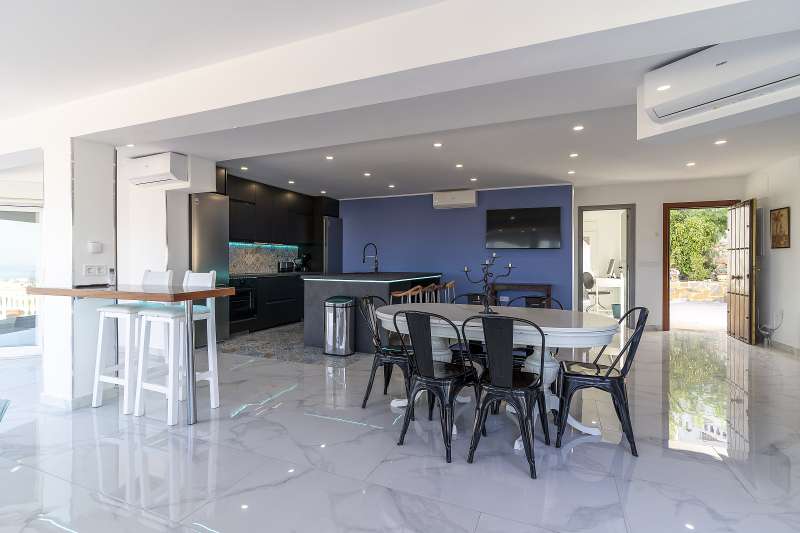 The villa has two levels and includes a main villa, a separate apartment, and a studio. There are seven bedrooms in total, each with its own bathroom. The interiors are bright and spacious, with open layouts and large windows that let in plenty of natural light. The design connects indoor and outdoor spaces smoothly, with terraces where you can enjoy the views and the Mediterranean climate all year. High-quality finishes and careful details create a comfortable and elegant atmosphere throughout the villa.