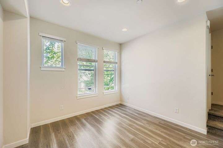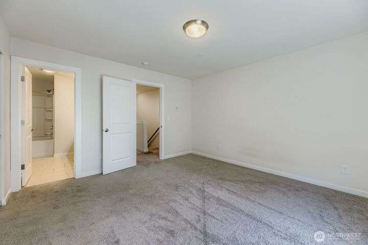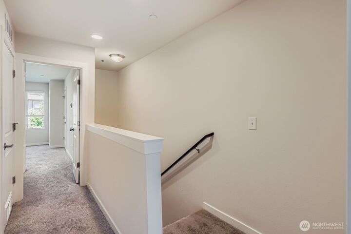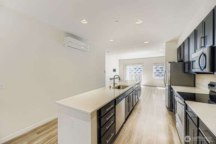Tucked in the neighborhood, away from the noise, but close to accommodations. This 3 story bright townhome boasts 2 primary bedrooms with baths en-suite! Classy finishes on the main, plenty of kitchen counter space, powder room, and deck off the living area. Open concept with large spaces to accommodate a formal dining table. Mini-split providing AC! Upper level bedrooms both have full bathrooms and plenty of closet space. Washer and dryer in upstairs hall. Very spacious 2 car tandem garage, with door in the back that leads to partially fenced patio. Possible to fully fence. Community includes a playground, no rental cap.