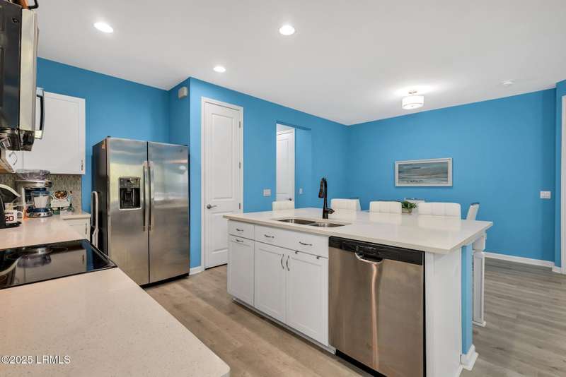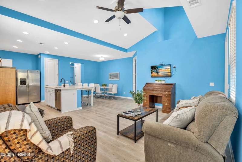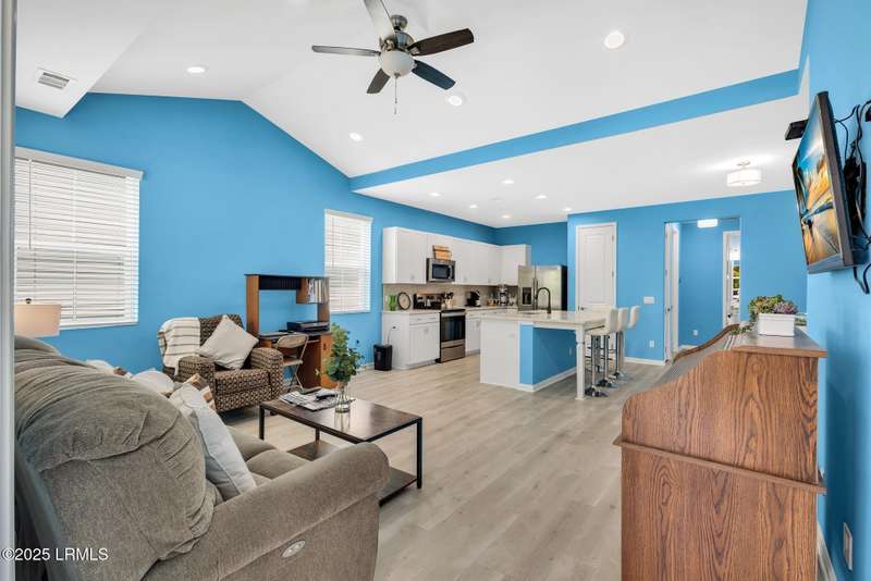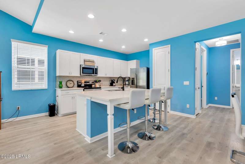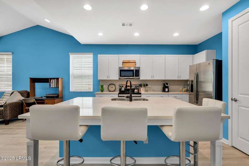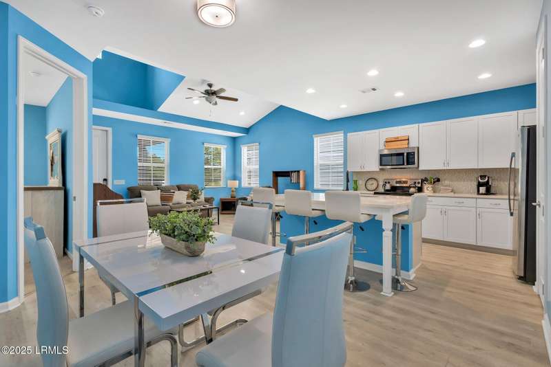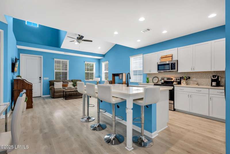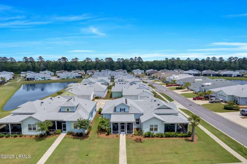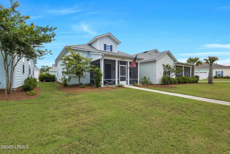 Well maintained Bamboo Cottage with a Wooded view in the exciting Margaritaville community! Don't wait for new construction - Move In Ready open plan living in this cute home with 2 Beds, 2 Baths, Screened Porch with epoxy floor overlooking serene, wooded view & 2 car Garage with epoxy floors is waiting for a new owner. Inviting spacious Living Room with fabulous Eat-In Kitchen, white cabinets & huge Quartz Kitchen Island, Stainless Steel stove, Microwave & Dishwasher convey. Perfect size Dining Area, LVP floors in living area, tile in wet area & carpets in bedrooms. Primary Bath with Double Vanities, fully tiled Shower and large Closet.