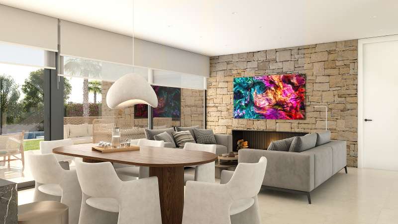 The interiors of the villas reflect a seamless blend of form and function. The ground floor features a bright open-plan living and dining area with direct access to expansive terraces, ideal for alfresco dining and entertaining. A fully fitted kitchen crafted from high-end materials enhances both style and usability. One spacious en suite bedroom on this level offers privacy and its own terrace. The upper floor houses the luxurious master suite with its private bathroom and access to an extensive sun terrace, along with additional bedrooms that can accommodate family or guests with ease.