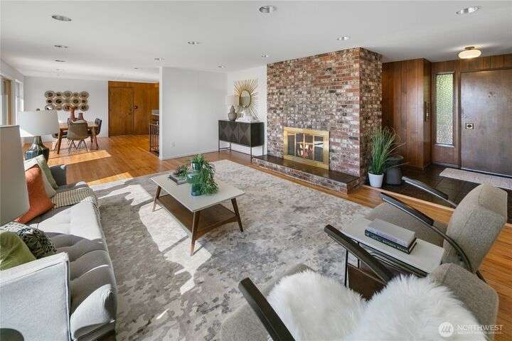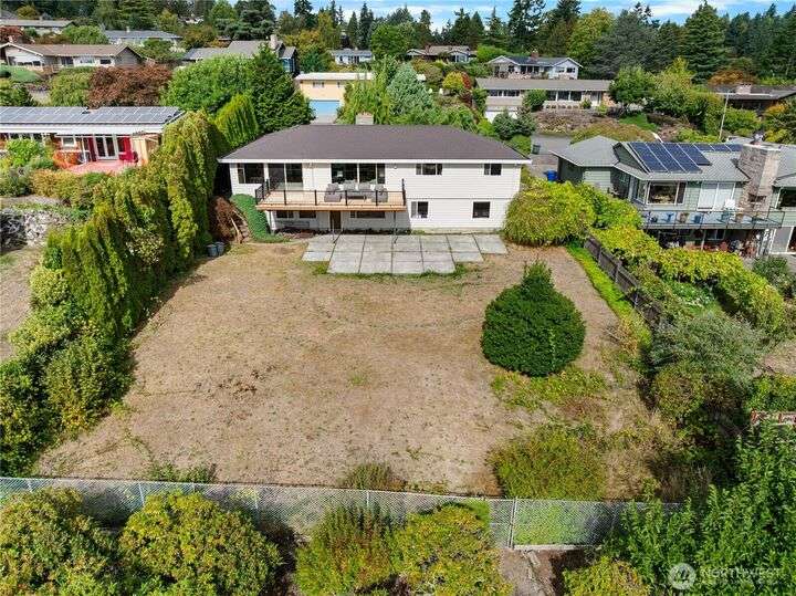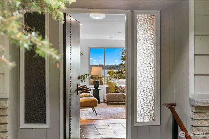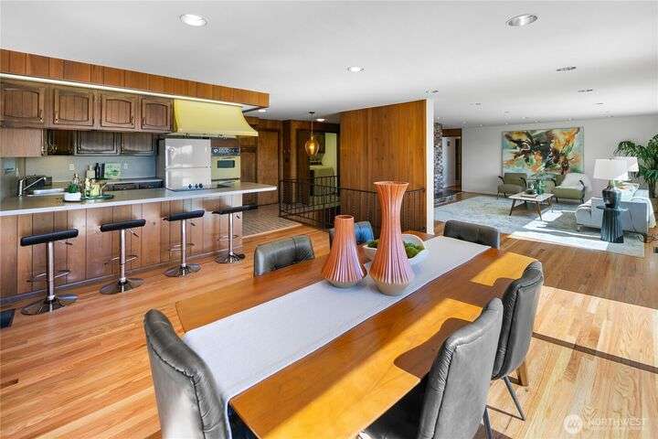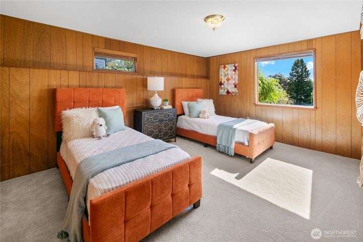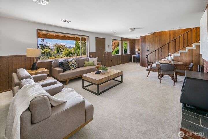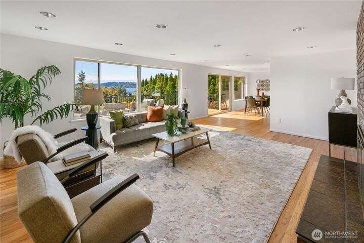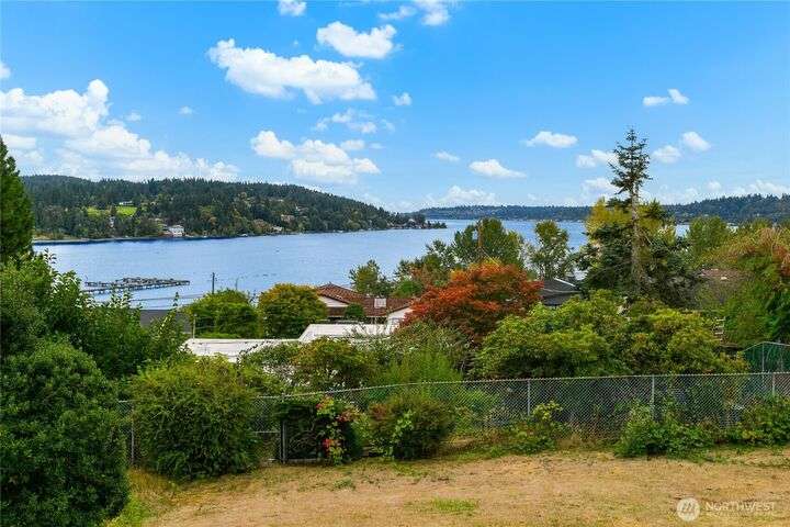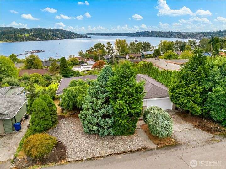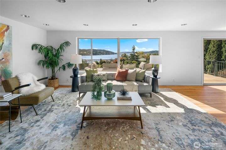 3440 sq ft, mid-century modern, 5+ brdm/2.5 bath home on 11,800 sq ft, nearly-level, fenced lot perched on a quiet street w/ breathtaking 180 degree views of Lake Washington. Freshly painted inside & out, new carpeting downstairs, main floor original hardwoods just refinished, and a beautifully refurbished 360 sq ft, water view deck. Lower level offers a separate den/library area, a kitchenette with pass-through for snacks and bonus/flex room for potential non-conforming 6th bedroom. Desirable Northshore School District. A very rare combination of an incredible location on a lovely, peaceful street, a nice, large home with amazing personal and shared spaces, a huge, fenced yard, and sweeping lake and teritorial views. Truly one-of-a-kind.