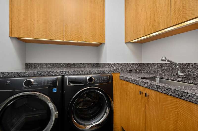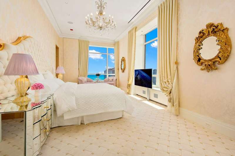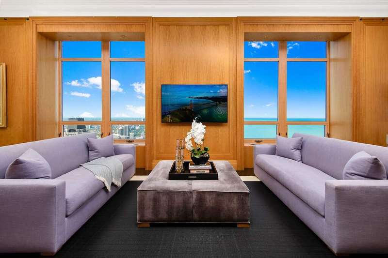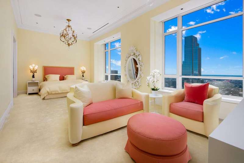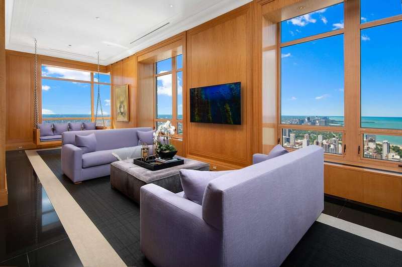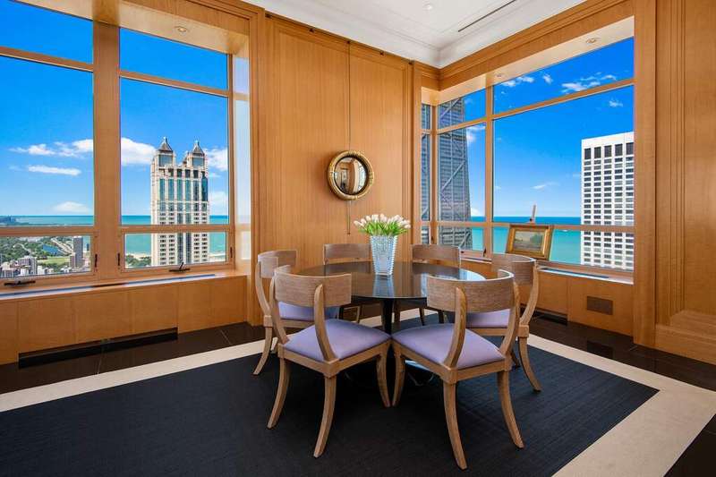 An oasis above the clouds, this one-of-a-kind penthouse comprises the entire 64th floor at the prestigious Park Tower on North Michigan Avenue. Spanning 8,500 SQFT, this 15-room apartment was meticulously crafted by the renowned architectural firm Marvin Herman & Associates and Interior Designer, Mitchell Turnbough. With a 360-degree view of the city, this unique residence is designed to provide an unobstructed panorama of Chicago's skyline. Access this penthouse via one of three elevators and a private elevator foyer, secured with custom designed filigree metal doors and state-of-the-art controls. Herman and Turnbough created a bold sense of exhilaration and drama as you step into the home. The entrance introduces the apartment's 12' ceiling grandeur with an allee of elegant, fluted columns wrapped in cream shagreen. Each space within the home has been purposefully designed to create a sense of majesty without traditional barriers, offering a fluid, uninterrupted walk around the apartment. The living spaces are open and conducive to modern family living, featuring high-level, durable finishes, and bespoke anegre wood paneling. The custom plaster cornice and walls were crafted by hand. Inspired by a vivid Ferragamo scarf, Turnbough enveloped the 2,400 SQFT grand living room and dining room walls in salmon-pink velvet. The space is further enriched with polished black granite floors and lacquered baseboards. The choice of red hues throughout the room enhances the natural light, creating a dynamic interplay of colors that shift with the day's arc, adding a sense of luxury and softness. This ensures the space is equally suited for stately celebrations and intimate gatherings, maintaining a sense of warmth and inclusion regardless of the event size. The dream kitchen features sprawling granite counterspace, top-of-the-line appliances, and is clad in impressive quarter cut figured anegre custom cabinets and wall paneling. A butler's pantry, a unique ovular island, and abundant storage complete the space. The kitchen opens to a great room showcasing spectacular lake and city views with north, east, and west exposures. This gracious space accommodates a breakfast room, a large family room, and a playful 8-person "porch swing," at the west corner of the family room, which floats gracefully from the 12 ft ceilings. The corner primary suite occupies the entire south wing and enjoys abundant sun from southeast exposures and views of the lake and the city down Michigan Avenue. Clad in quarter cut figured English sycamore paneling, no expense was spared in the custom closet & dressing room where you will find copious hanging space, a three-way mirror and a center island. The closet also doubles as a panic room. A luxurious ensuite bathroom, accoutered entirely in a soft golden-green onyx with book matched creamy marbling and gilded gold fittings, enjoys southwest corner views & features heated floors, a steam shower & tub with west-facing views. A sizeable home office paneled in quarter cut figured English sycamore flanks one side of the primary suite while a large exercise room flanks the other side and leads to the west wing of the residence, which is dedicated entirely to four ensuite guest rooms. The owner paid special attention to structural integrity and sound insulation, ensuring a reposeful living environment amidst the bustling city. From an aesthetic perspective, even the door hardware was exclusively designed by Marvin Herman for this penthouse, creating a high level of customization. The home is equipped with automated shades, smart Control 4 integrated surround sound & TV system. This residence offers a rare opportunity to own a significant piece of Chicago's architectural innovation, where every detail has been crafted to ensure unparalleled elegance & comfort. Enjoy Renowned Park Hyatt Hotel amenities at your disposal - 24 hour fitness center, indoor pool, spa, in-room dining, and the acclaimed NoMi restaurant