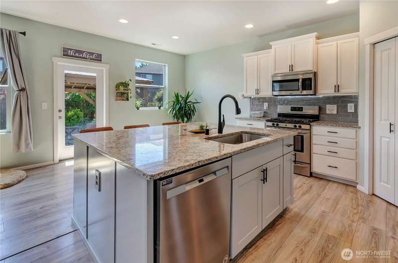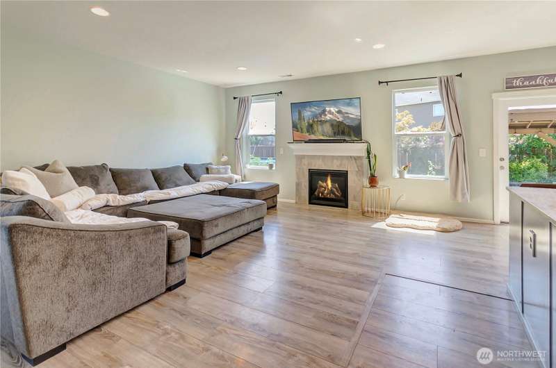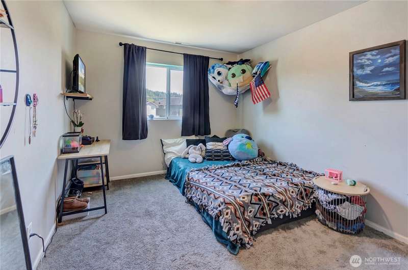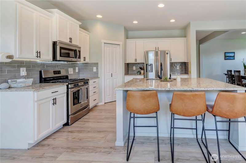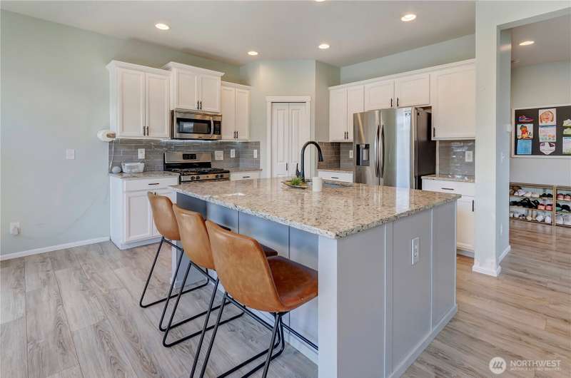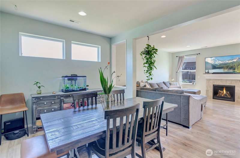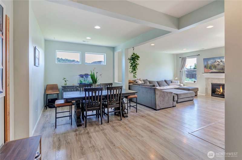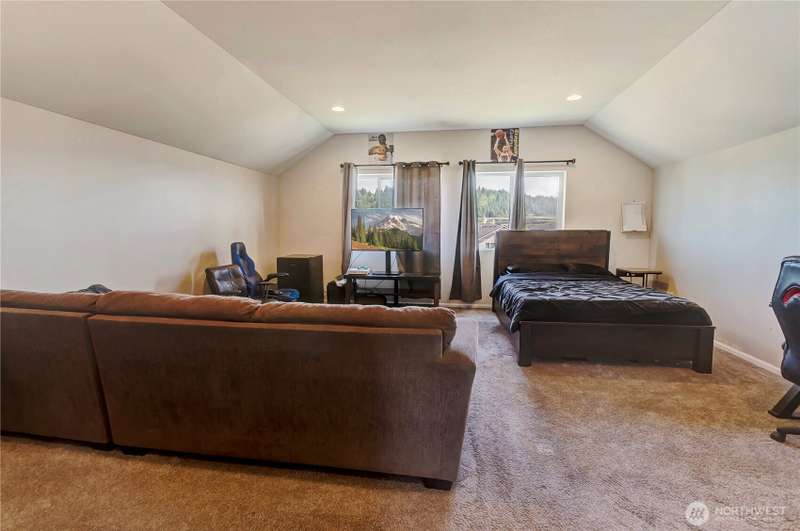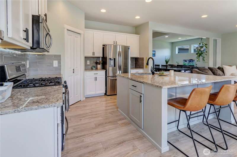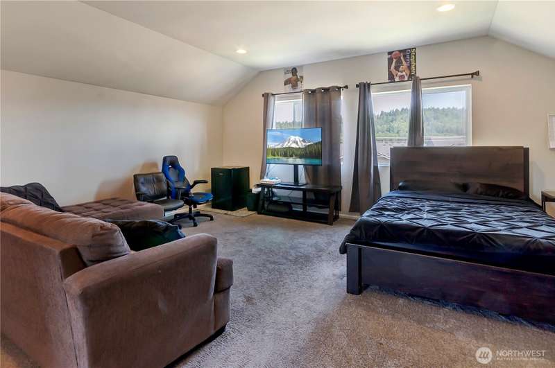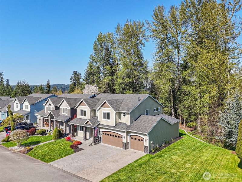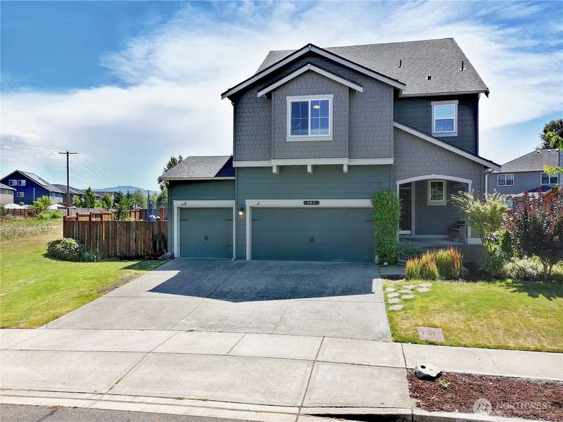 Beautiful modern Craftsman with space, style, and stunning views! This 5-bed home features a bright open-concept layout that connects the kitchen, dining, and living areas, perfect for everyday living. The kitchen offers modern finishes, generous counter space, and excellent functionality. The spacious primary suite boasts a 5-piece bath and walk-in closet. Upstairs you'll find 4 large bedrooms and a full bath. The 5th bedroom is on the 3rd floor, a versatile flex space ideal for guests, work, or play. Enjoy year-round comfort with A/C, a fully fenced yard, covered patio, and breathtaking mountain views. A private gate opens to a path to the river, your own slice of PNW lifestyle. All just moments from the sought-after Orting Trail.