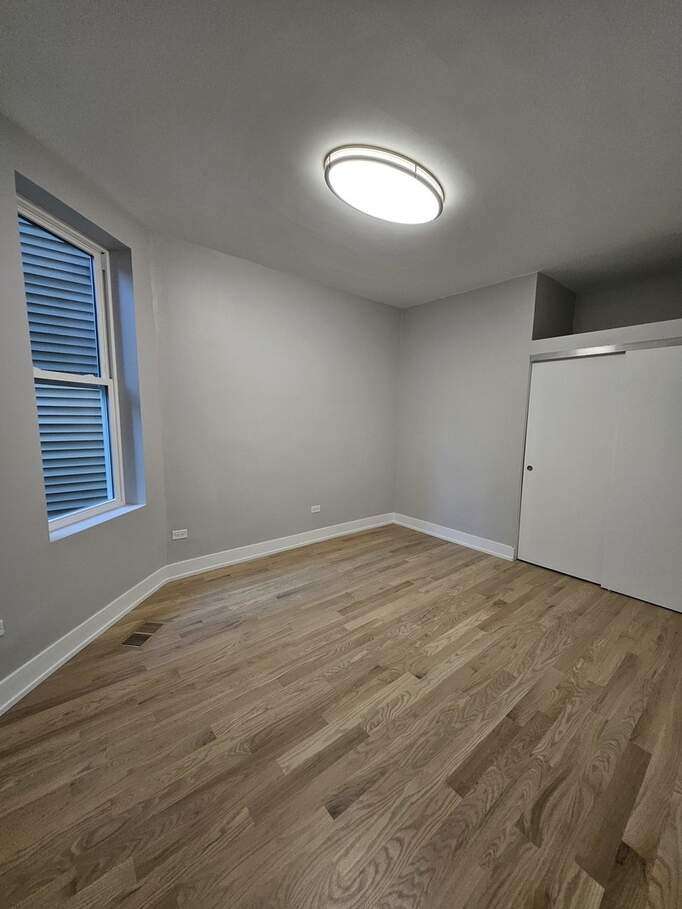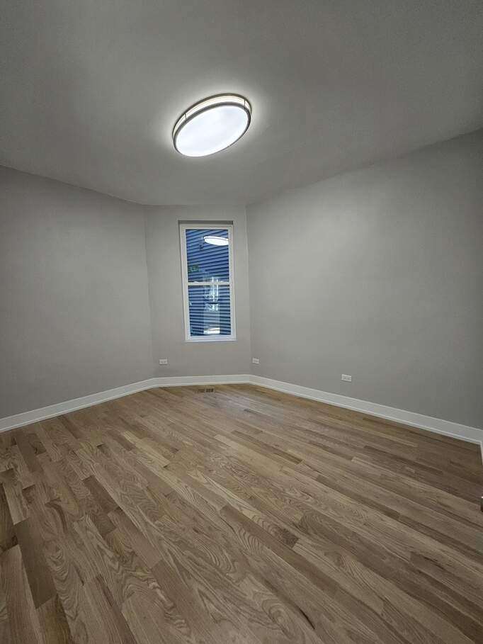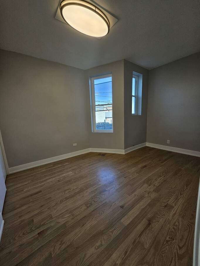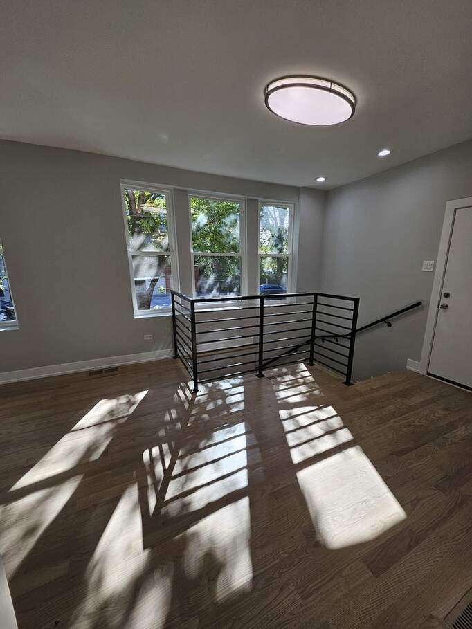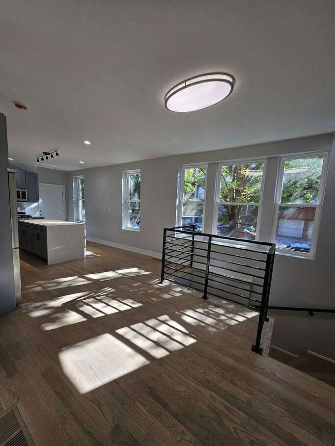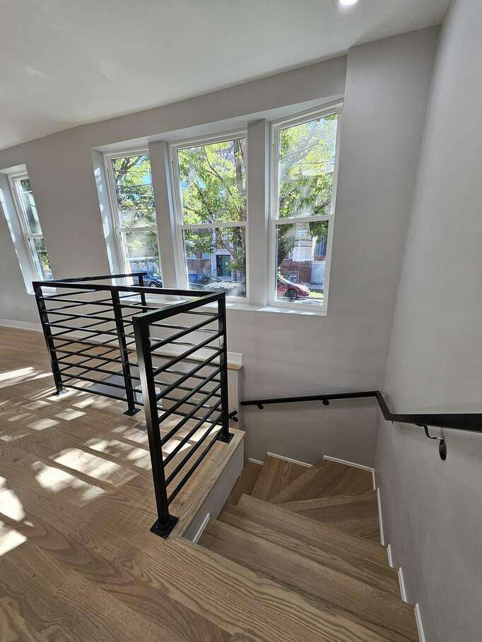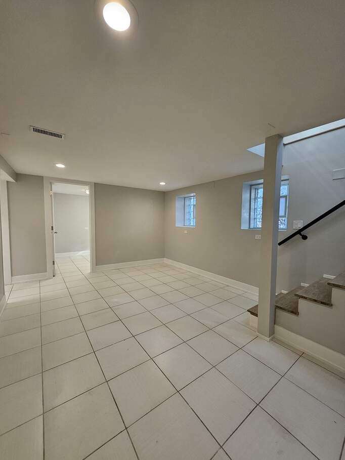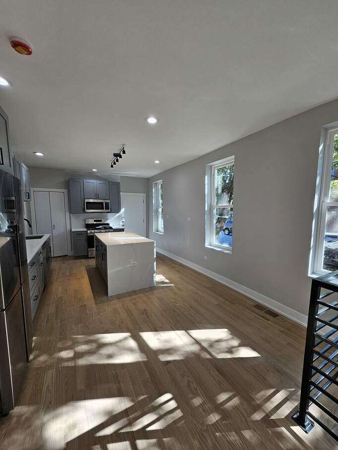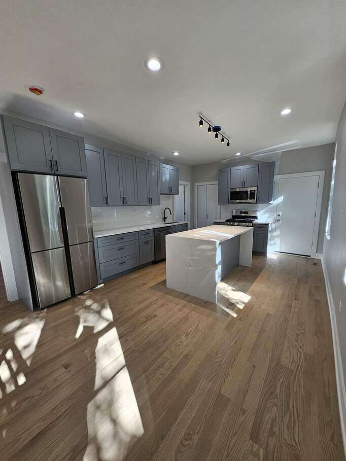 Sun-drenched New Construction 3bed/2bath duplex down. This corner unit was just gut renovated with designer finishes. Main floor features open floor plan w Kitchen opening up to dining. Kitchen features oversized island with waterfall Calcutta quartz counters, gray cabinets with soft close features, tons of storage and pantry area. Full stainless steel appliances including dishwasher. 2 large bedrooms on main floor with ample closet space and sunlight. Main floor has hardwood floors. Lower level features family/living room and large storage closet. Additional 3rd bedroom, full sized bathroom and laundry center with storage also located in lower level. Large fully enclosed metal porch in rear of unit perfect for grilling. Includes Central AC/Heat and in unit side by side Washer/Dryer. 2 parking spots included in rear of building. Available 12.1