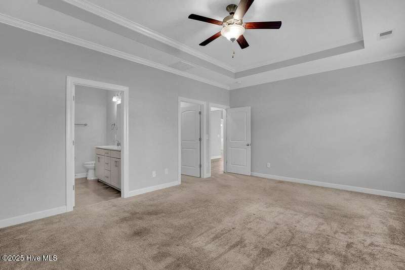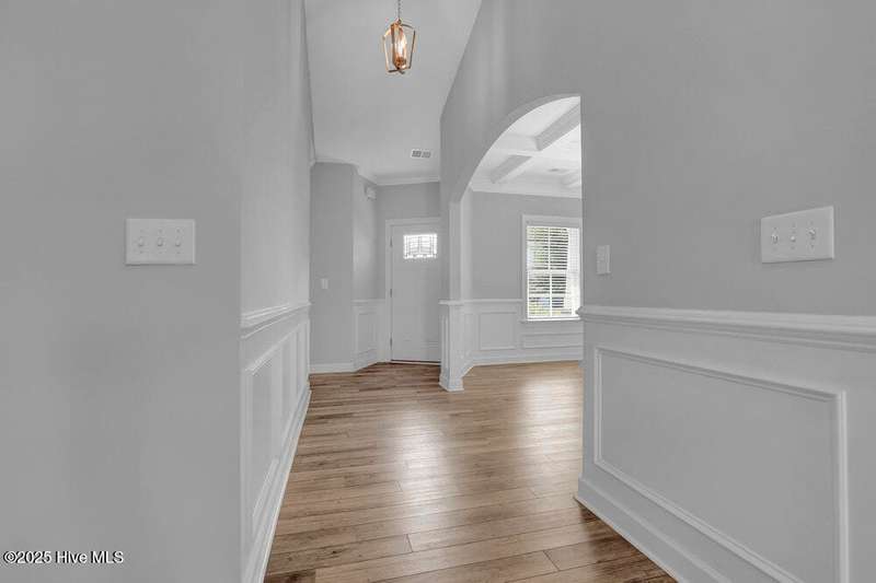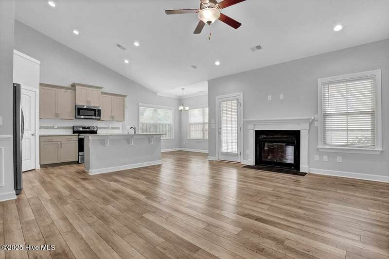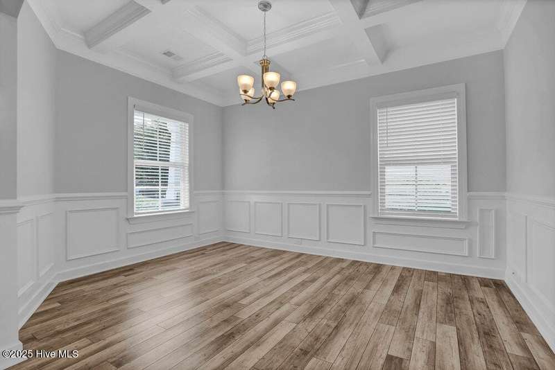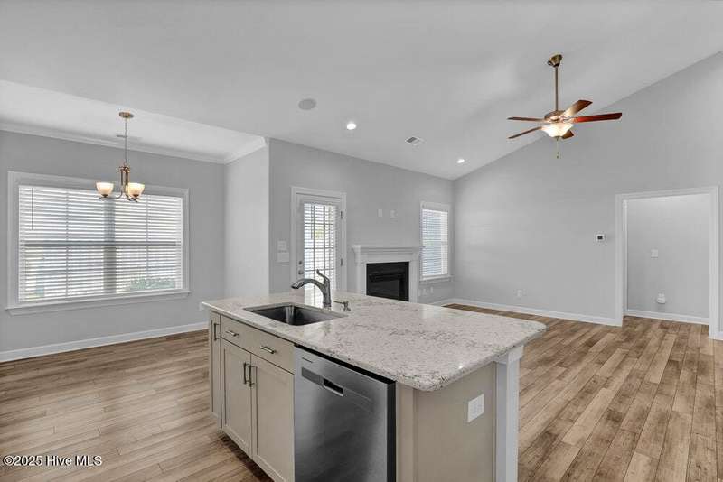 Welcome to this beautifully appointed, mostly first floor living with a bonus suite up! Notice the attention to detailbeautiful hard flooring throughout the main living areas and a formal dining room that impresses with a coffered ceiling and classic judges paneling.The open-concept kitchen features staggered-height cabinetry, granite countertops, tile backsplash, stainless steel appliances, a corner pantry, and a charming breakfast nook. The spacious living area boasts vaulted ceilings and a cozy fireplace, creating the perfect space for entertaining or relaxing.The first-floor primary suite offers tray ceilings, a generous walk-in closet, a large tiled walk-in shower, and a dual vanities. Two additional bedrooms, a full bath, and a large laundry room complete the main level. Upstairs, guests will enjoy their own large, private suite with a walk-in closet and full bath.