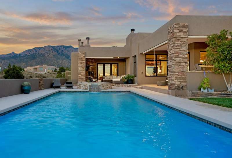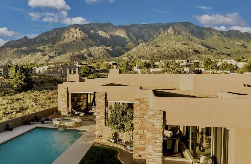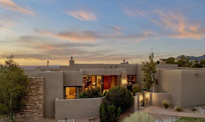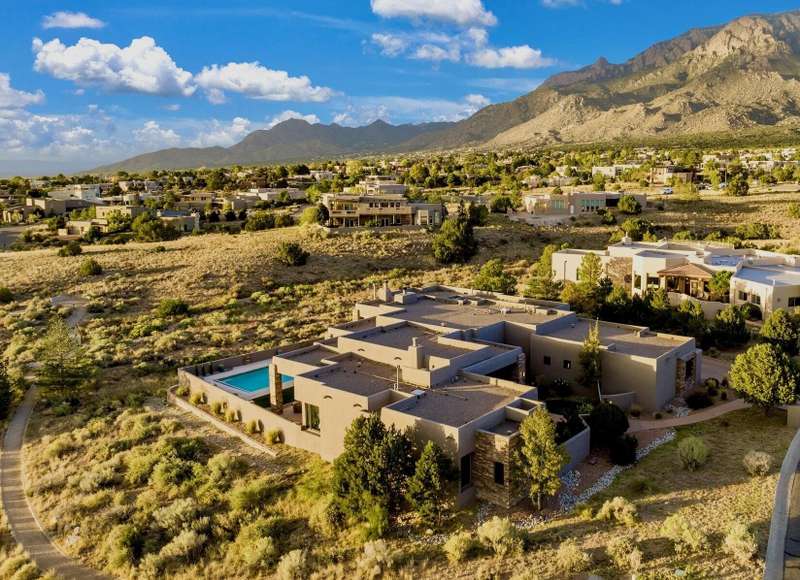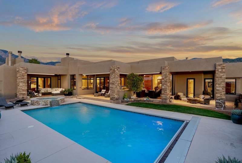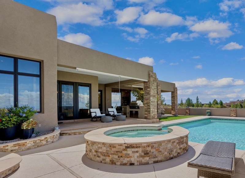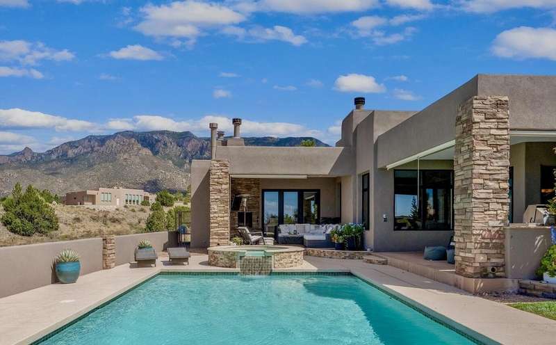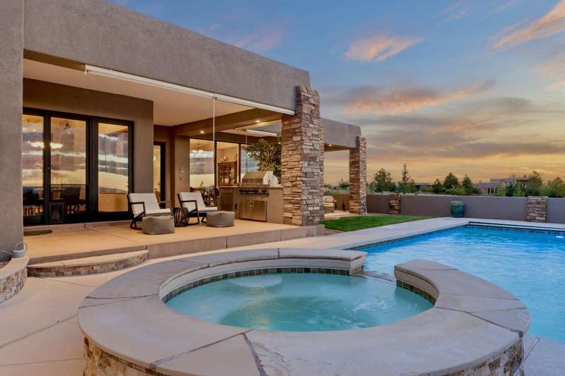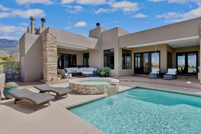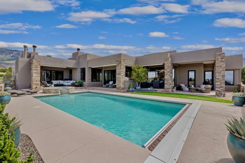 Contemporary and elegant, this stunning home is positioned perfectly to enjoy unobstructed views of the sunsets, city lights, and Sandia Mtns. Courtyard entry invites you into this light-filled home with flowing floor plan and seamless living between indoor & outdoor spaces. Entertainer's dream kitchen! Plenty of workspace, 3 ovens, 2 dishwashers, Wolf range, lrg pantry & Subzero fridge. Stylish living spaces divide the North & South wings. Spectacular primary suite on North wing includes sitting area & fireplace where one enjoys moments of reflection overlooking open space below or city lights beyond. South wing with 2-3 bdrms (1 w/en-suite), generous closets & office w/ amazing views. Media room w/bar & recreation area. Salt water pool, hot-tub, covered patio, outdoor living area!