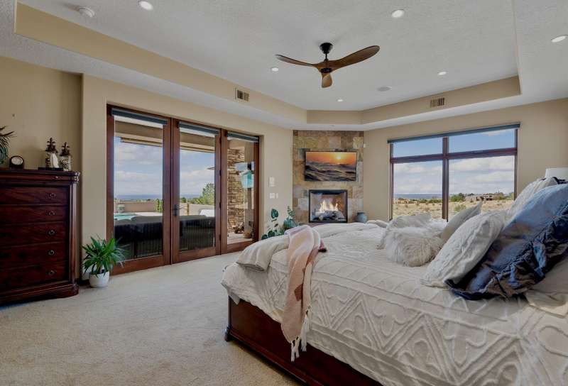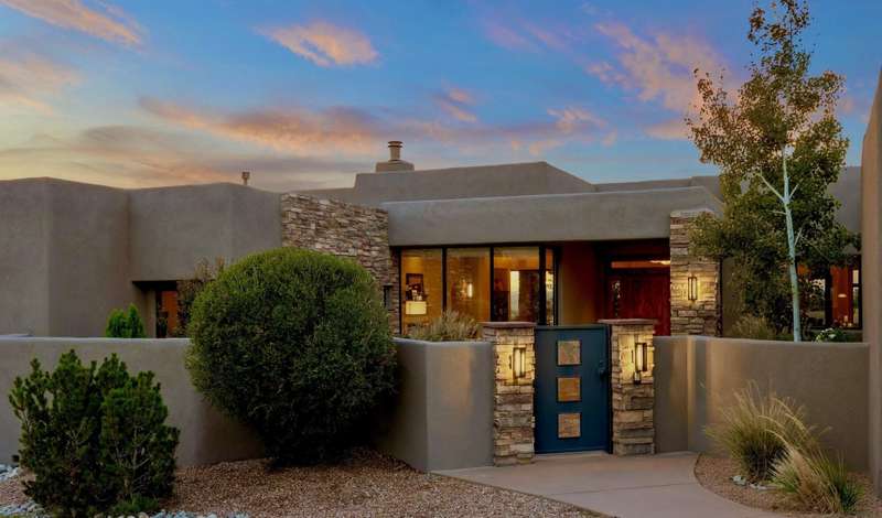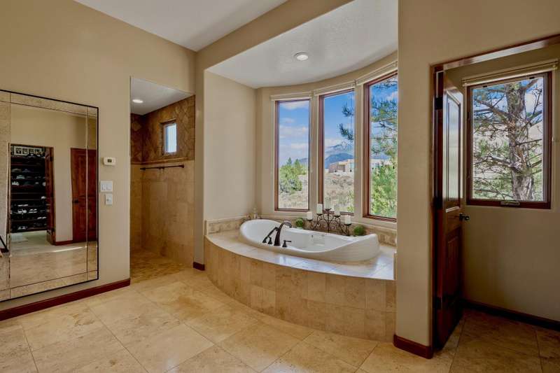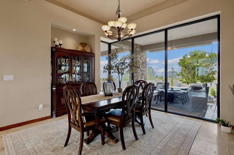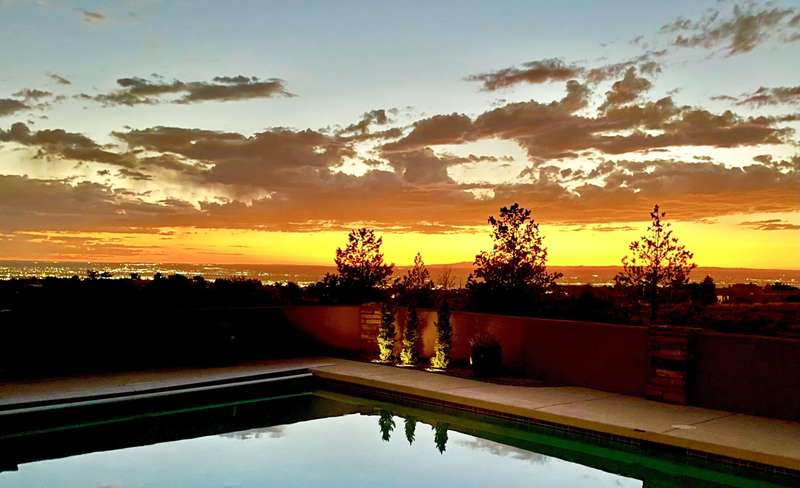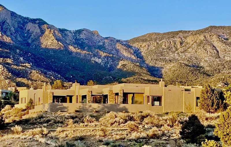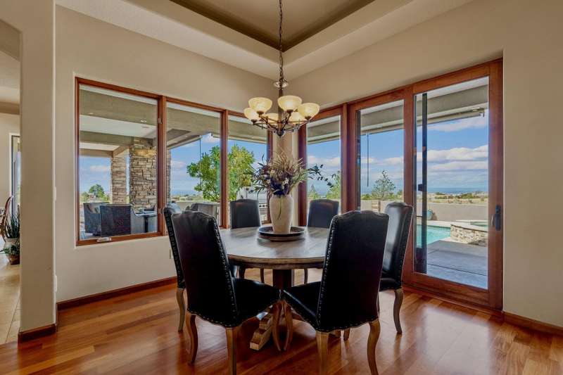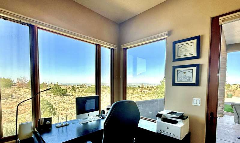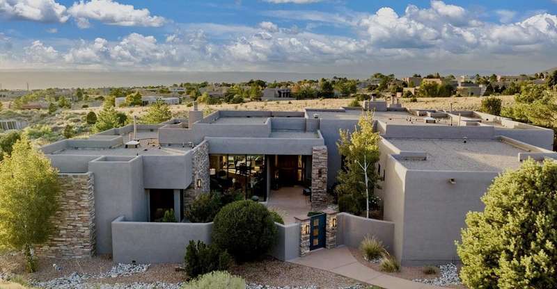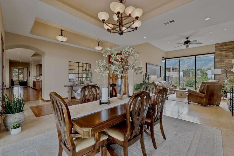 Contemporary and elegant, this stunning home is positioned perfectly to enjoy unobstructed views of the sunsets, city lights, and Sandia Mtns. Courtyard entry invites you into this light-filled home with flowing floor plan and seamless living between indoor & outdoor spaces. Entertainer's dream kitchen! Plenty of workspace, 3 ovens, 2 dishwashers, Wolf range, lrg pantry & Subzero fridge. Stylish living spaces divide the North & South wings. Spectacular primary suite on North wing includes sitting area & fireplace where one enjoys moments of reflection overlooking open space below or city lights beyond. South wing with 2-3 bdrms (1 w/en-suite), generous closets & office w/ amazing views. Media room w/bar & recreation area. Salt water pool, hot-tub, covered patio, outdoor living area!
