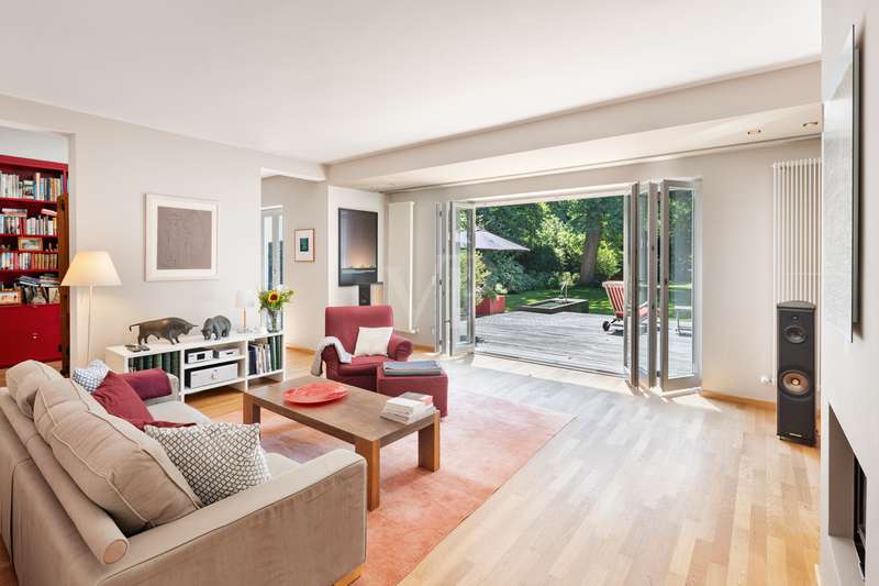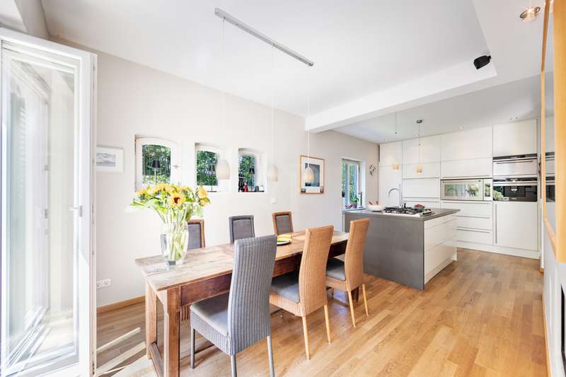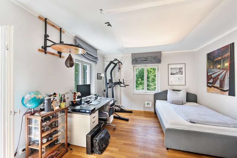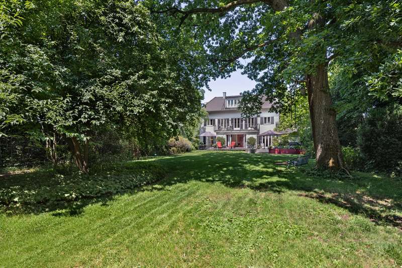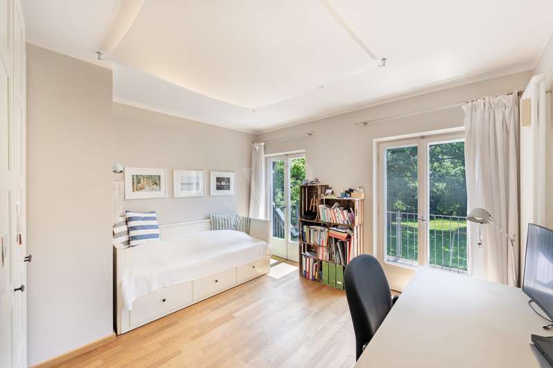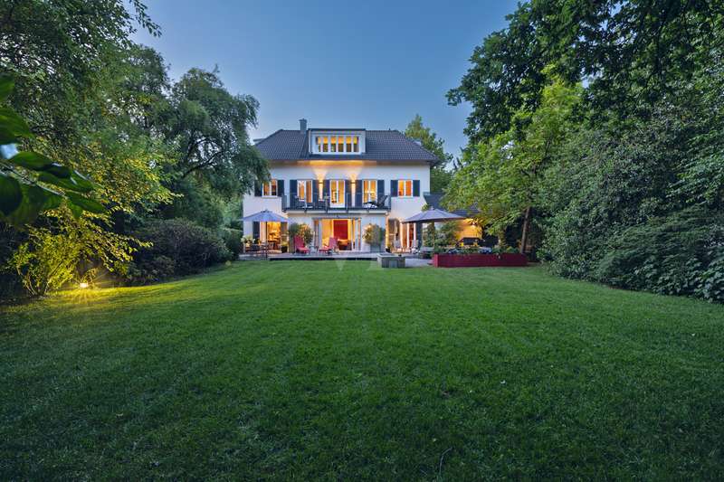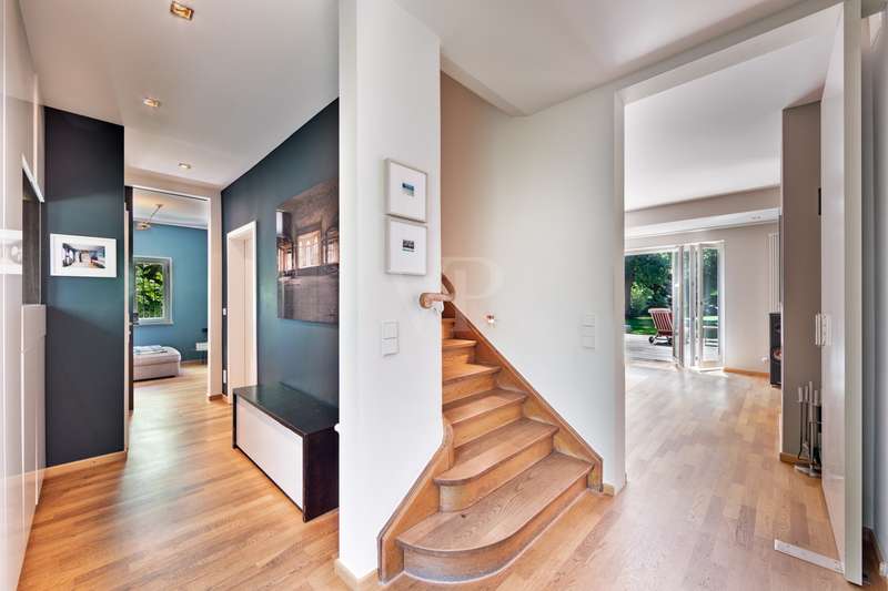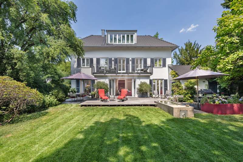 In one of the most sought-after locations in Gräfelfing, this well-kept detached house awaits you on a park-like, secluded plot of approx. 1,207 m² with a sunny south-west orientation. The house was built in 1950 and extensively renovated in 2005 and 2008. It offers around 255 m² of living space and a total living/usable area of around 416 m² - ideal for families and couples who value quality and space to develop. Oiled oak real wood parquet flooring is laid throughout the house, which, together with the double-glazed wooden windows, some of which were replaced in 2005, creates a warm and pleasant living atmosphere. The custom-made carpenter's kitchen impresses with high-quality appliances: a Smeg gas stove, Siemens coffee machine and Miele dishwasher leave nothing to be desired. The spacious living area with fireplace and integrated Bose sound system invites you to spend relaxing evenings with family and friends. Modern LED spotlights and Occio lamps provide an atmospheric lighting concept, while an intercom system and a laundry chute from the upper floor and attic offer additional convenience. The well thought-out room layout with a total of five well-designed bedrooms is particularly attractive. This means that the house also offers versatile usage options for large families or people with a need for work and guest rooms. The top floor was converted in 2005 and now serves as a parental suite with dressing room, en-suite bathroom and steam bath - a private retreat that guarantees relaxation at a high level. The entire roof truss was rebuilt during this process. As part of the core renovation, not only were all the water and electrical pipes renewed, but the basement was also excavated, insulated and a new gas pipe installed, providing additional, versatile space. A particular highlight is the spacious plot with its mature planting and old trees. Three terraces - a high-quality wooden terrace and two stone terraces - create a variety of opportunities to enjoy life outdoors. Whether enjoying breakfast in the morning sun, a barbecue in the afternoon or relaxing reading in the evening sun - thanks to the optimal south-west orientation, you can enjoy sunlight from dawn to dusk and absolute privacy in the sheltered garden. The quiet, family-friendly neighborhood, the excellent connections to Munich city center and the proximity to schools, shopping facilities and leisure activities make this house an ideal place to live. Here, timeless architecture is combined with high-quality furnishings and a garden paradise that is rarely found.