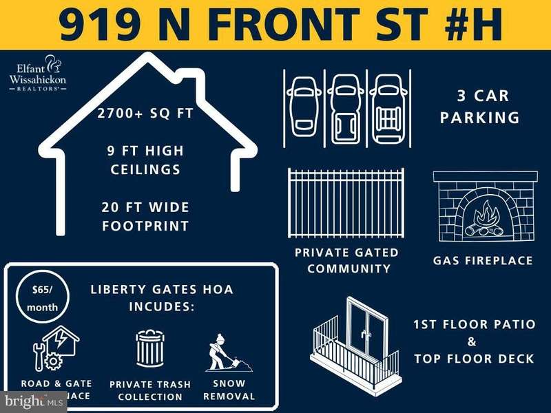 Looking for a house with an impressive floor plan, dedicated parking and outdoor space with low taxes in the highly desirable Alexander Adaire Elementary School catchment? Look no further, 919 N Front St #H has all that within a small, gated community. This 3-bedroom, 2.5 bathroom townhome spans over 2,700 square feet. Enjoy all the benefits of being the end townhome - extra parking and windows (Low-E double pane to be exact) to let in an abundance of natural light. Your future home is tucked away from the bustling city and gated access ensures you will come home to your own parking spaces every day (1 car garage + 2 driveway spaces). You also get the benefit from two outdoor spaces - a spacious deck with partial skyline views, and a private 1st-floor patio with a dedicated gas line for your grill. Your home also features an open first floor that can be converted into an office, 4th bedroom, or even a workout room. The second floor is an open concept that features the kitchen, family and dining room, perfect for entertaining guests. The 3rd features two bedrooms, full bathroom and laundry. The home is rounded out with a primary suite featuring a full walk-in closet, en-suite bathroom and direct access to your private deck. Situated in a highly coveted location, this home is just a short stroll away from the vibrant Piazza, Brooklyn Bowl, The Fillmore, Brooklyn Brewing Company, an array of great restaurants and bars, shopping destinations including a brand-new Sprout Market around the corner, and convenient transit options including multiple Indego Bike Stations. Its central proximity grants swift access to I-95, Delaware Avenue, 76, and the Ben Franklin Bridge, ensuring effortless commuting and exploration of the region. Upgrades include updated roof (2024), new private patio (2021), added 3rd floor bedroom and den (2020), and full stucco remediation (2019). The current owners love this home and they are excited for the next fortunate buyers to create their own memories within this extraordinary space.