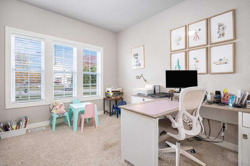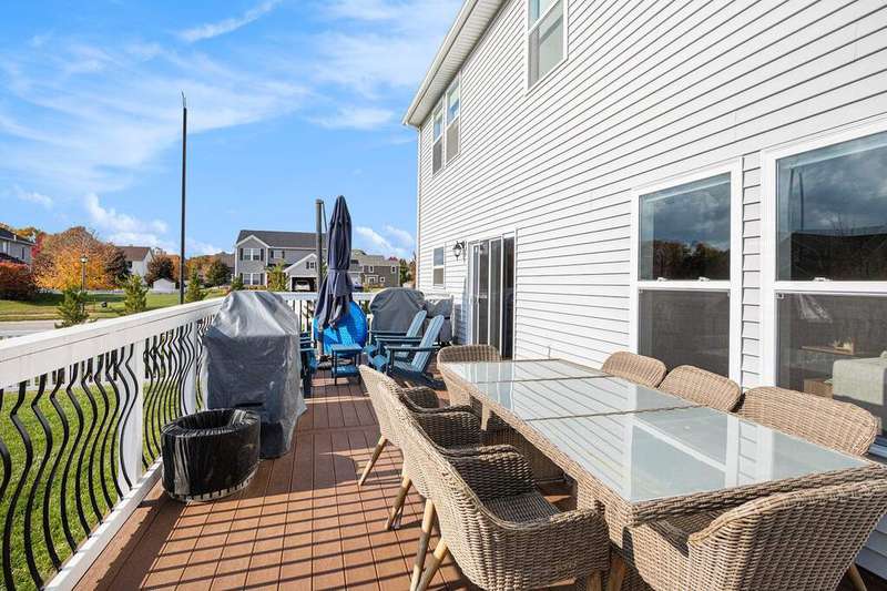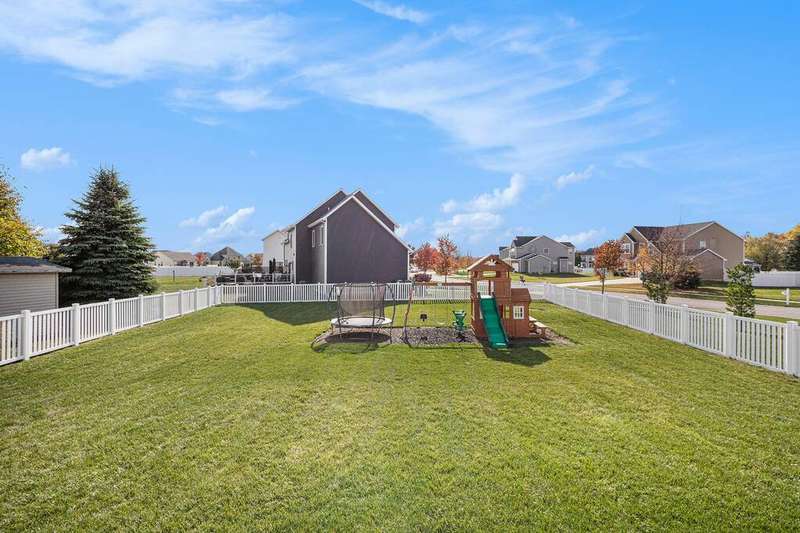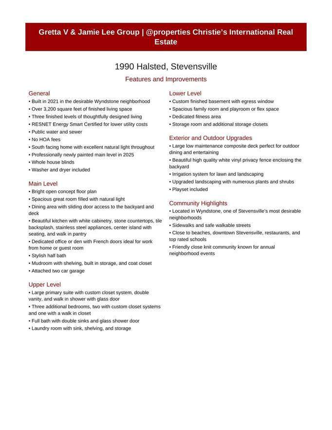 Beautifully updated, energy-efficient home in one of Stevensville's most sought-after neighborhoods. Located in the desirable Wyndstone subdivision, this nearly new home combines comfort, style, and modern convenience. Designed for both everyday living and entertaining, it offers a thoughtful open-concept layout with private, flexible spaces across 3 finished levels and 3,200 sq ft of finished living space. Quality finishes, recent upgrades, and a beautifully fenced backyard make this property truly move-in ready. Step inside to a bright main level filled with natural light. The spacious great room flows seamlessly into the dining area and kitchen, creating an inviting gathering space. The kitchen features white cabinetry, stone countertops, stainless steel appliances, a walk-in pantry, and a large center island with seating. Sliding doors open to a large composite deck and a fully fenced backyard with irrigation system, upgraded landscaping, and a playset that stays. Whether you're grilling, dining outdoors, or relaxing by a firepit, this backyard is made for connection and enjoyment. A dedicated office or den with French doors near the entry provides the perfect work setup or a quiet guest space. A stylish half bath and mudroom with shelving and a closet add to the home's functionality and charm. Upstairs, the primary suite offers a peaceful retreat with a large walk-in closet featuring a custom closet system, a double vanity, and a walk-in shower with glass door. 3 additional bedrooms (2 with upgraded closet systems, including one with a walk-in), share a double-sink full bath with a glass shower door. A convenient laundry room with a sink and shelving completes the second level. The finished basement with egress window adds exceptional living space with a large family room, fitness area, playroom or flex space, and plenty of storage. Additional highlights include: -Newly and professionally painted main level -Custom finished basement with egress window -Whole-house blinds -Washer and dryer included -RESNET Energy Smart Certified for lower utility costs -Public water and sewer and no HOA fees -High-quality white vinyl privacy fence -Upgraded Irrigation system and landscaping with mature plants -South-facing home providing abundant natural light Set within a welcoming, close-knit community, residents here enjoy friendly neighbors, and the peace of mind that comes with safe, walkable streets and sidewalks. Just minutes from Lake Michigan beaches, downtown Stevensville, top-rated schools, and local amenities, this home offers the perfect blend of modern living and small-town charm.