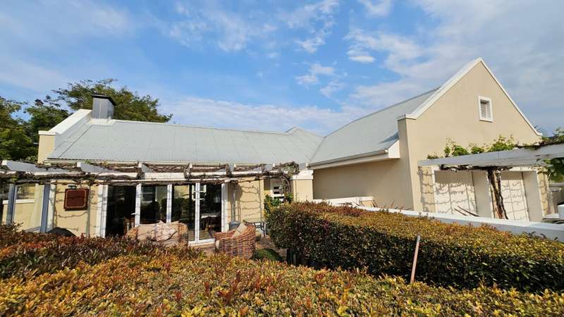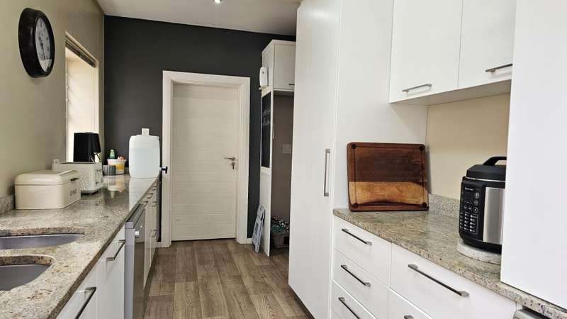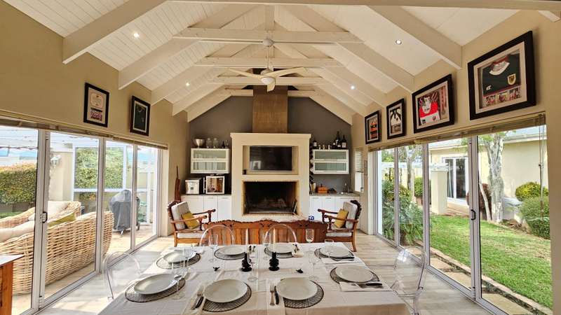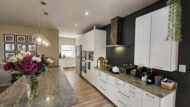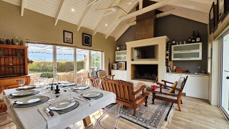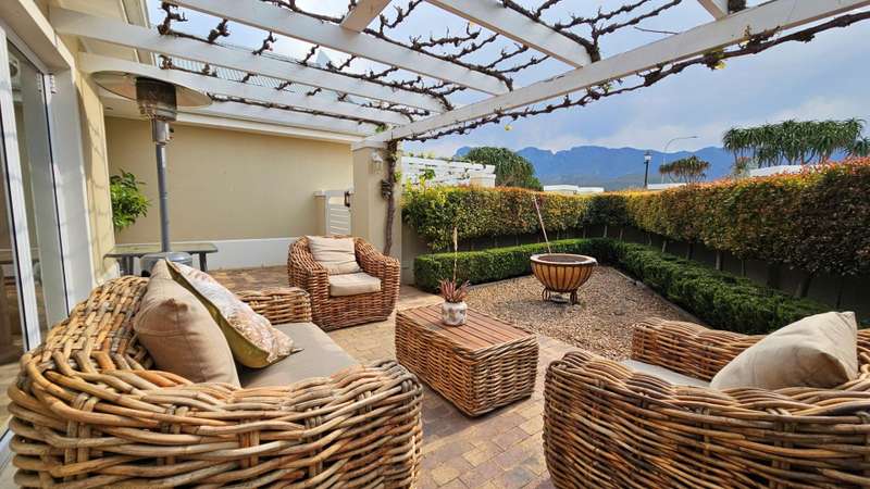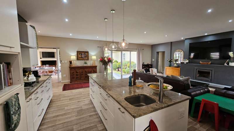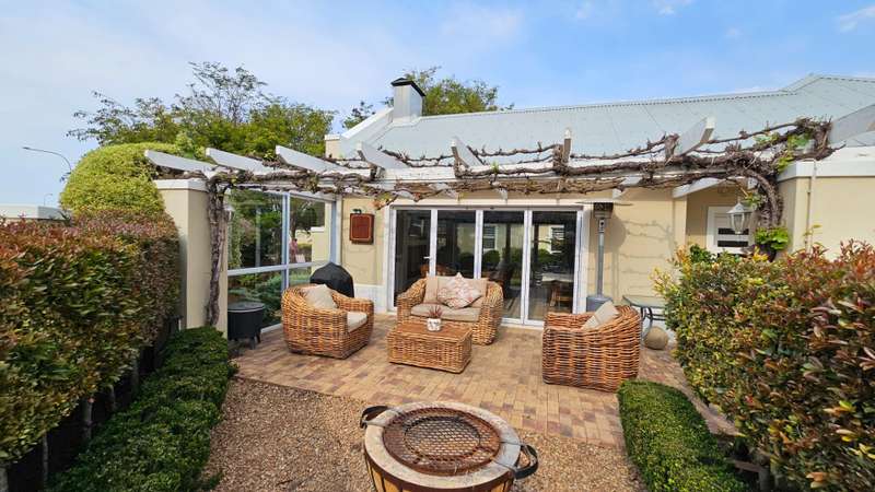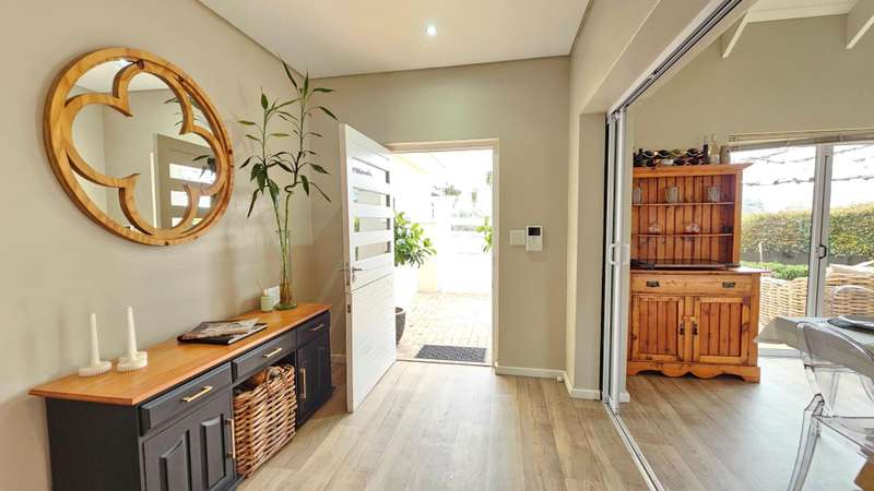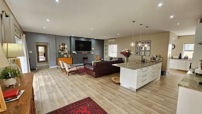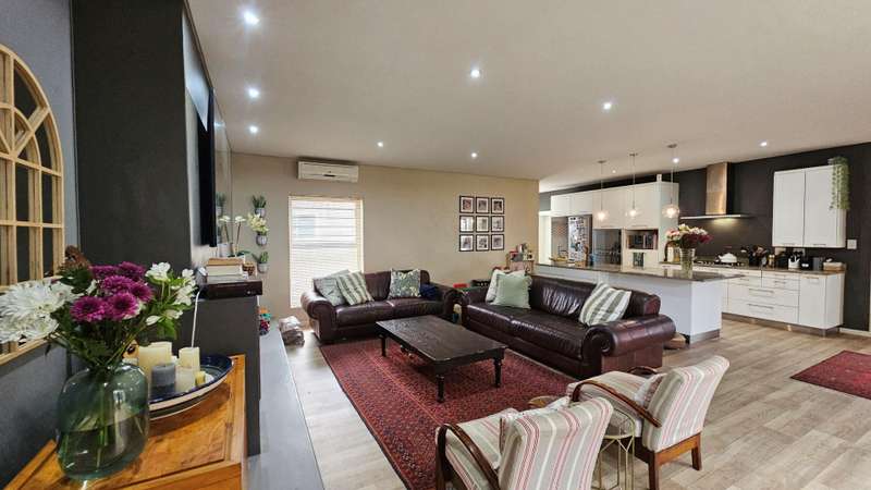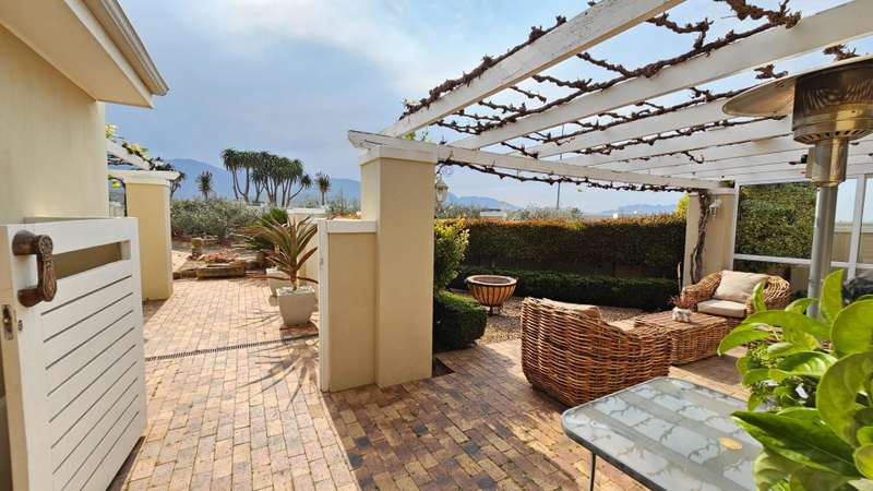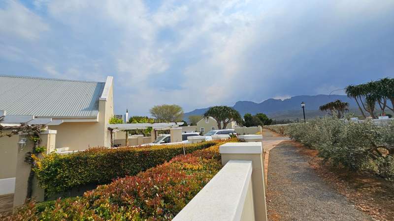 Positioned on a spacious corner stand in the sought-after Roode Villas complex, this immaculate home offers uninterrupted views of the Langeberg Mountains and surrounding olive groves. The air-conditioned open-plan living area features a Saey fireplace and stacker doors that open onto the garden, creating a seamless indoor-outdoor flow. A standout entertainment room with soaring ceilings includes a built-in braai/fireplace, custom cabinetry, and dual stacker doors that open on both sides to frame the mountain backdrop. The stylish kitchen is equipped with a gas/electric hob, double oven, and a separate scullery with ample storage and space for appliances. The luxurious master suite includes a walk-in wardrobe, double shower, double vanity, and a free-standing bath, complemented by two guest bedrooms and a second bathroom. Additional highlights include direct access from automated garages, a linen cupboard, solar geyser, garage storeroom, and garden storage. This beautifully designed property offers premium comfort, privacy, and excellent investment potential.
