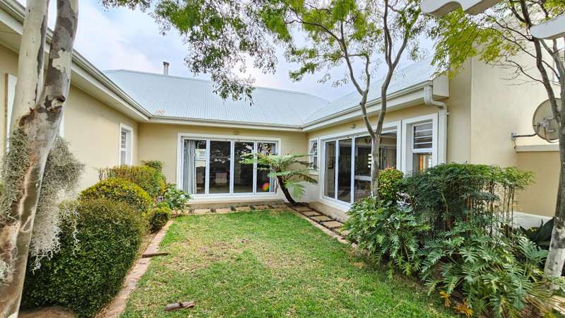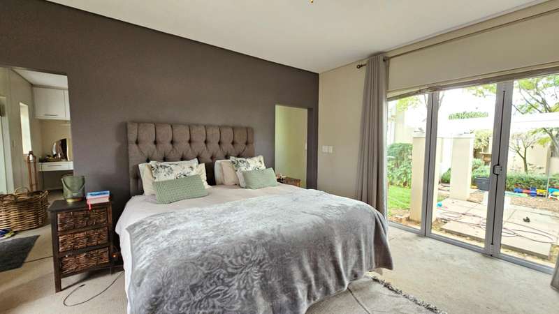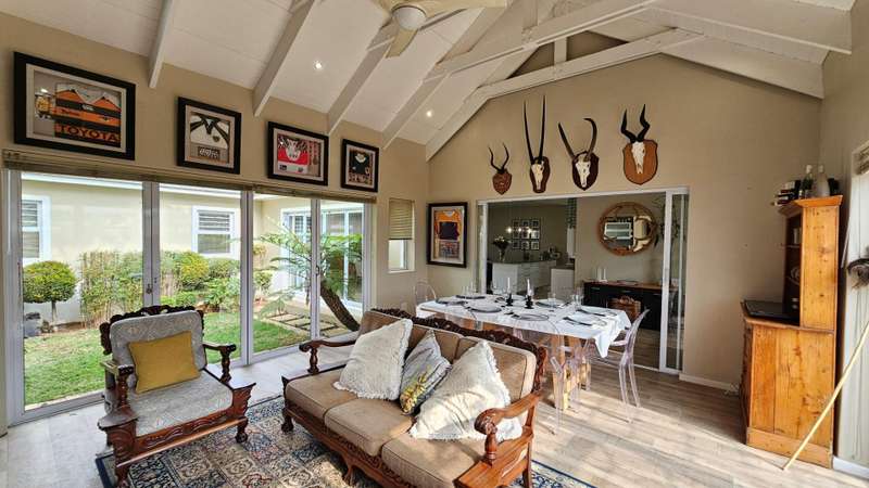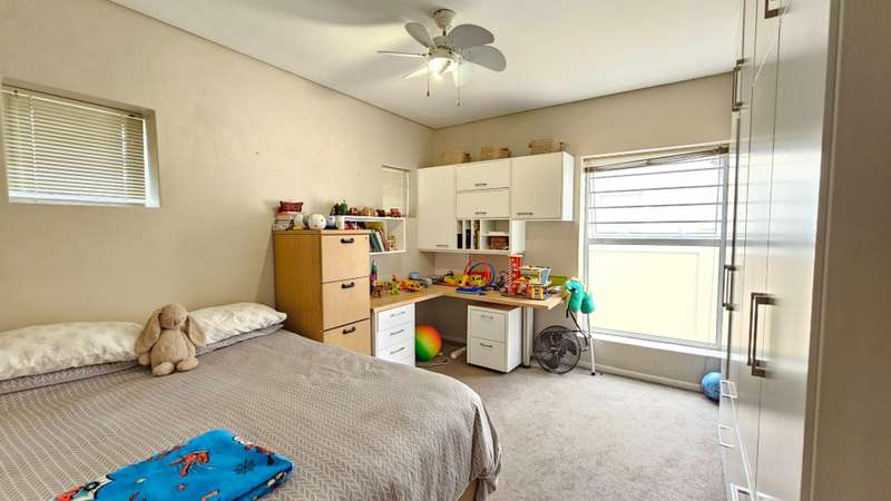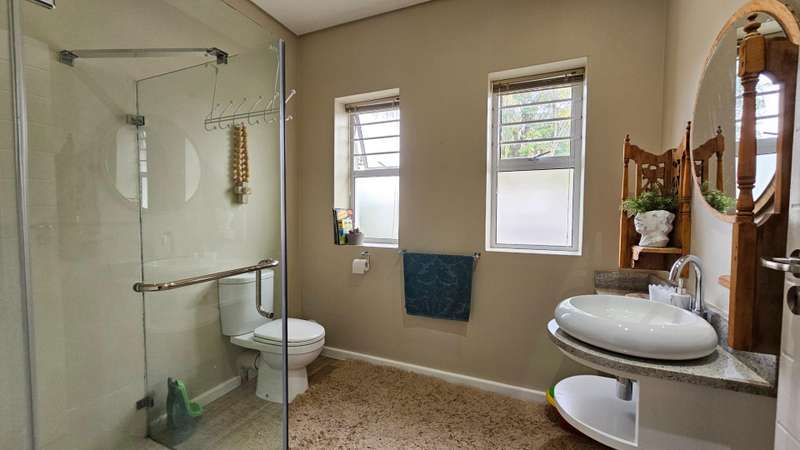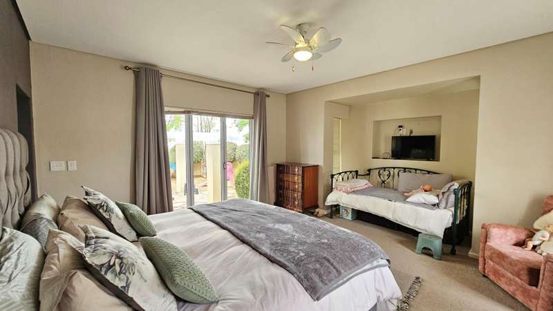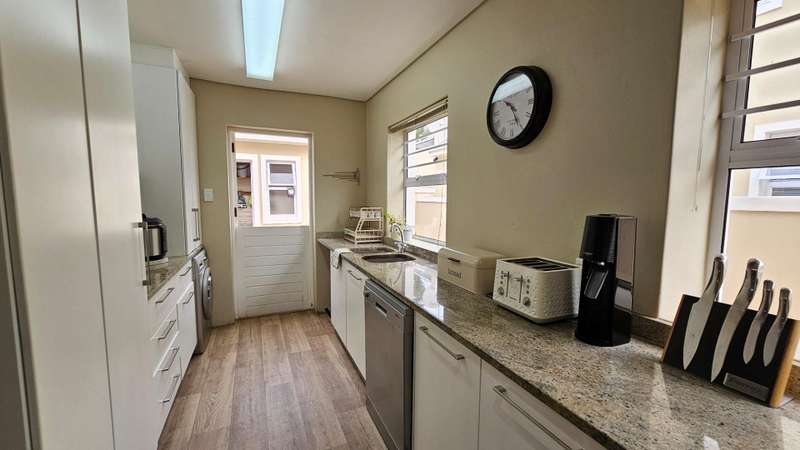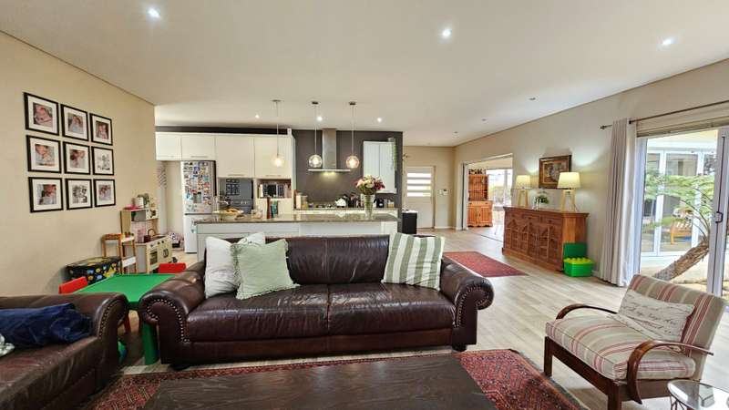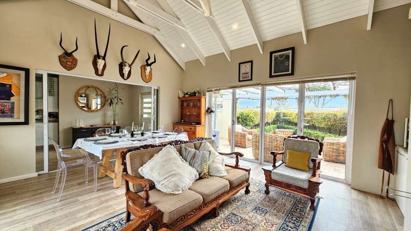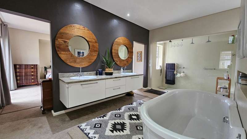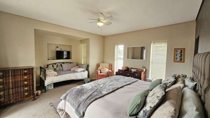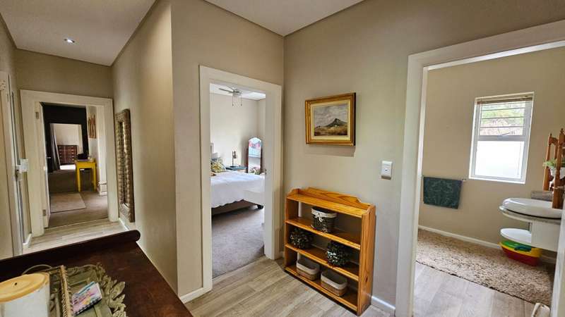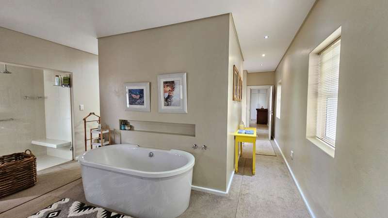 Positioned on a spacious corner stand in the sought-after Roode Villas complex, this immaculate home offers uninterrupted views of the Langeberg Mountains and surrounding olive groves. The air-conditioned open-plan living area features a Saey fireplace and stacker doors that open onto the garden, creating a seamless indoor-outdoor flow. A standout entertainment room with soaring ceilings includes a built-in braai/fireplace, custom cabinetry, and dual stacker doors that open on both sides to frame the mountain backdrop. The stylish kitchen is equipped with a gas/electric hob, double oven, and a separate scullery with ample storage and space for appliances. The luxurious master suite includes a walk-in wardrobe, double shower, double vanity, and a free-standing bath, complemented by two guest bedrooms and a second bathroom. Additional highlights include direct access from automated garages, a linen cupboard, solar geyser, garage storeroom, and garden storage. This beautifully designed property offers premium comfort, privacy, and excellent investment potential.