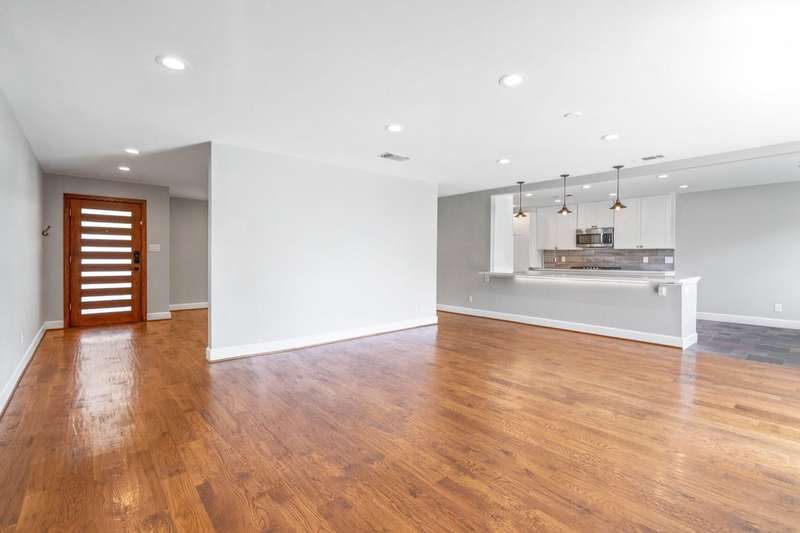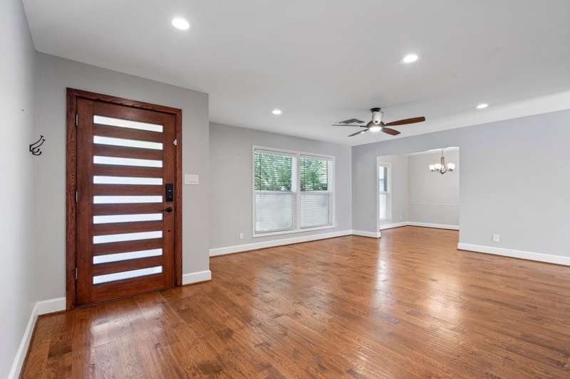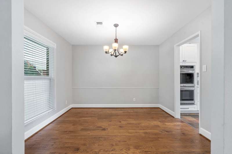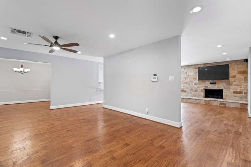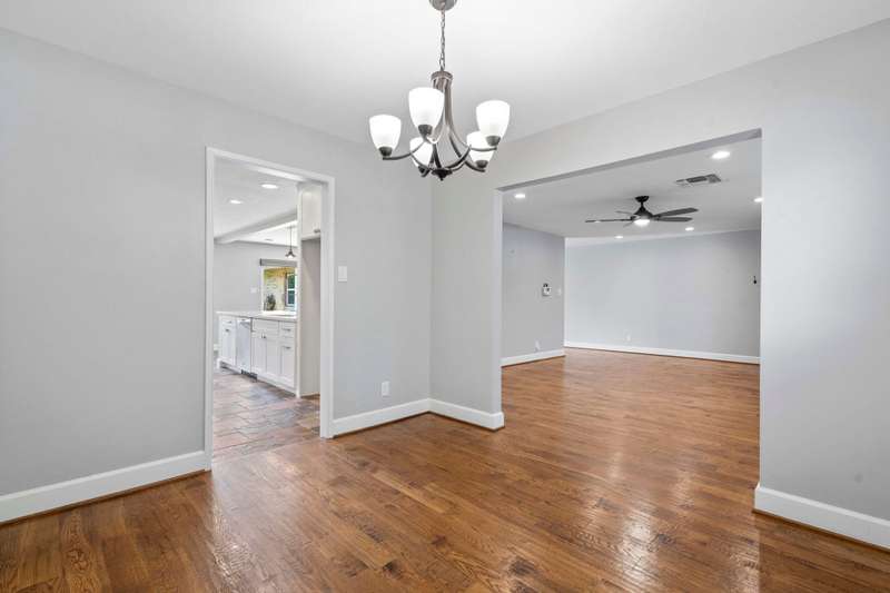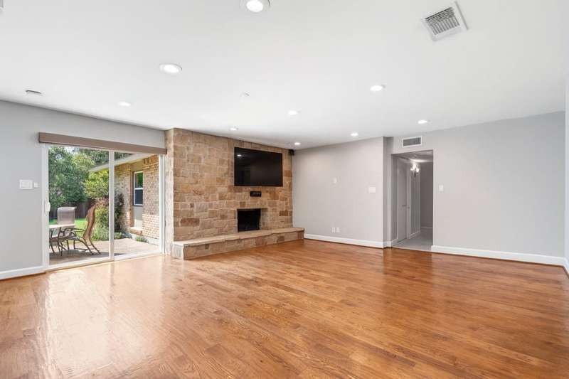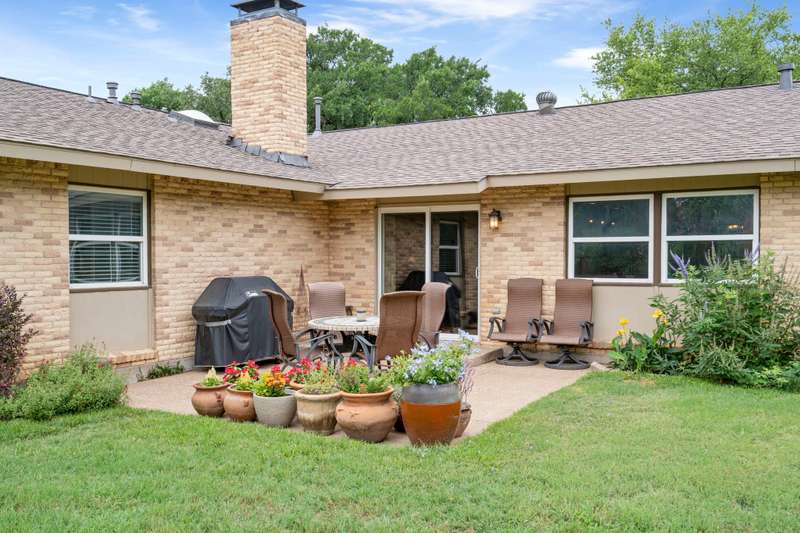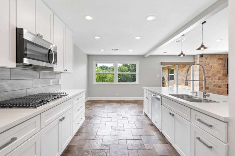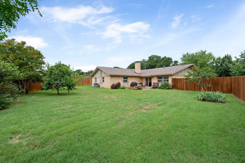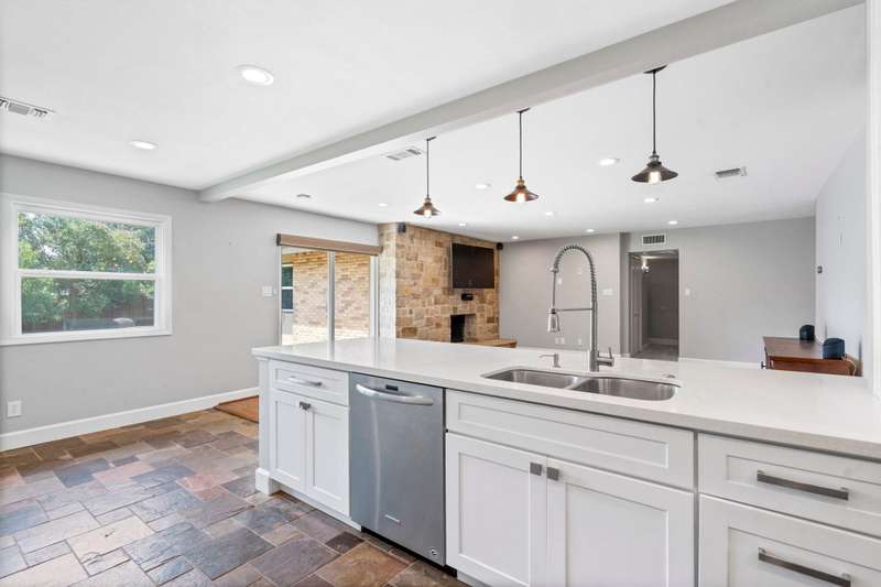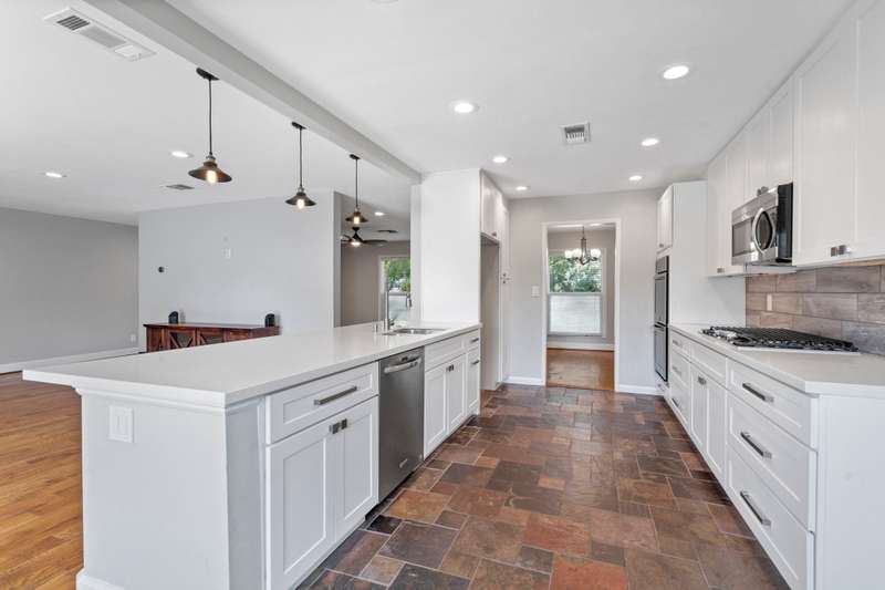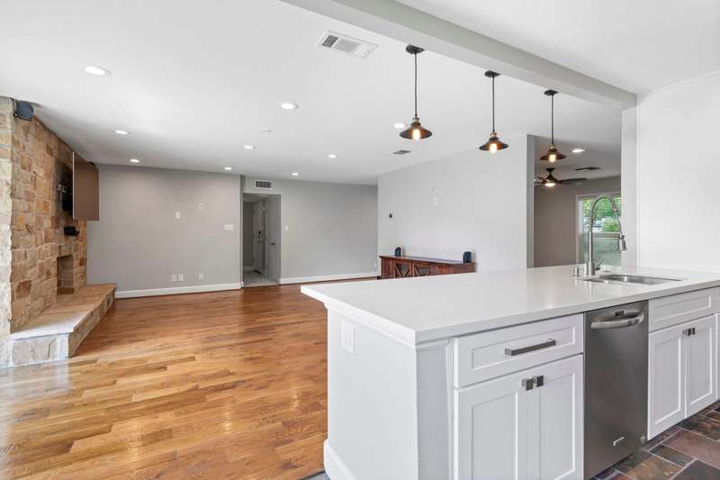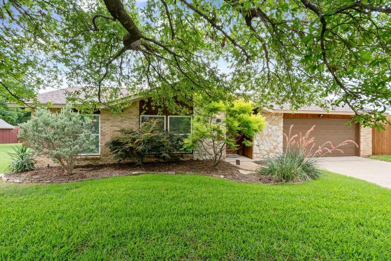 Nestled deep among the trees on a .3-acre cul-de-sac lot sits this meticulously maintained and updated transitional home in highly desirable Glen Meadow Estates. This 4-bedroom, 2-bath home offers 2,211 square feet of thoughtfully designed living space with an open layout great for easy living and entertaining. The open-concept kitchen with extended peninsula allows for counter seating and also features quartz countertops, Shaker-style cabinets & soft-close drawers. Stainless appliances include convection Frigidaire Gallery double ovens, LG microwave, Kitchenaid dishwasher, & 5-burner Whirlpool gas cooktop. Main living spaces, including the dining room, feature handscraped wood floors. Formal dining room is situated perfectly between the formal living space and kitchen. Main living space is open to kitchen with a captivating stone wall that includes a gas log fireplace as well as great views of the backyard. Large primary bedroom features a walk-in closet and ensuite bath w-dark Shaker-style vanity, quartz countertop, and frameless glass shower with multiple shower heads and body sprays. Additional bedrooms are well-sized with access to a hall bath and just recarpeted in August. Extra-large storage closet as well as a thoughtfully designed utility space are both accessible in the hall. The backyard is spacious with lush landscaping including Peach trees, an Oklahoma Redbud, a Chinese Pistache Tree, and more native greenery and plants. There is plenty of room to add a pool or an additional structure-guest house. Ideally located with easy access to the tollway and I-635, this home combines timeless ranch charm with modern updates in a prime location conveniently close to Dallas top private and collegiate prep schools, major highways, shopping, and dining.