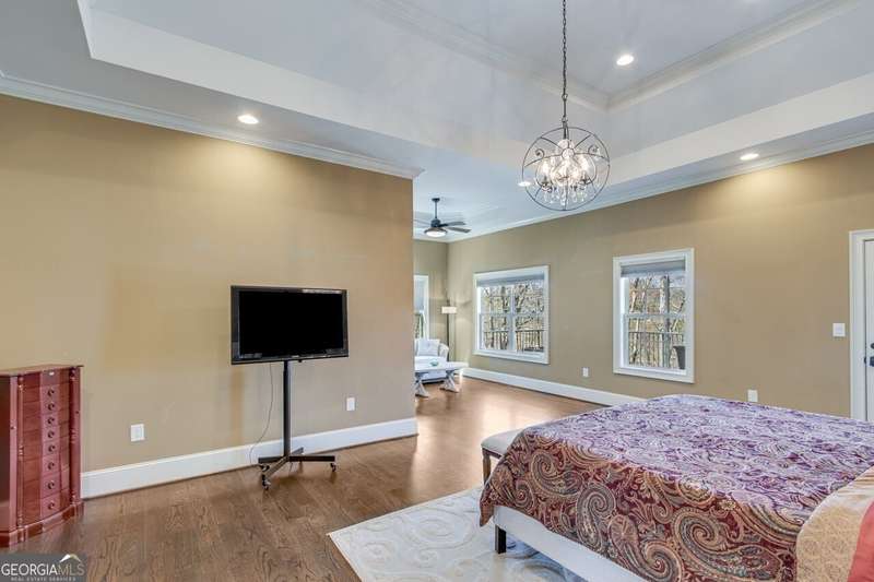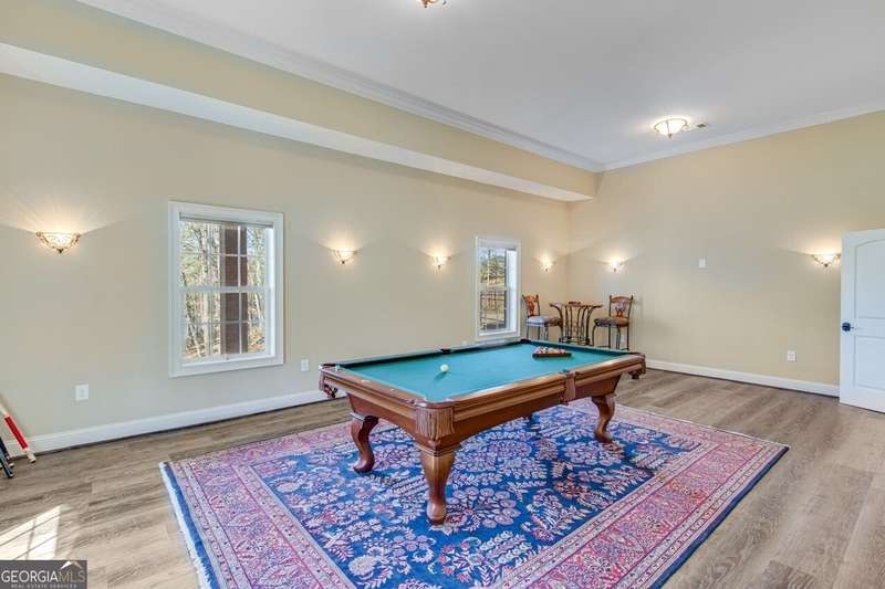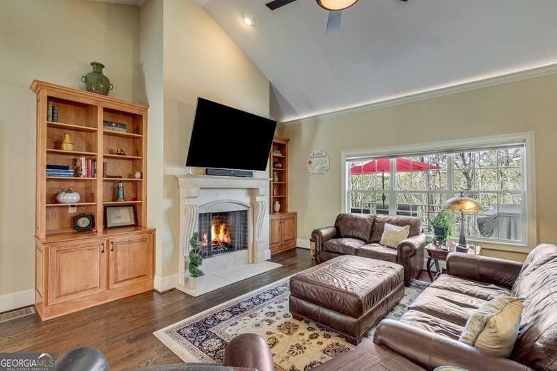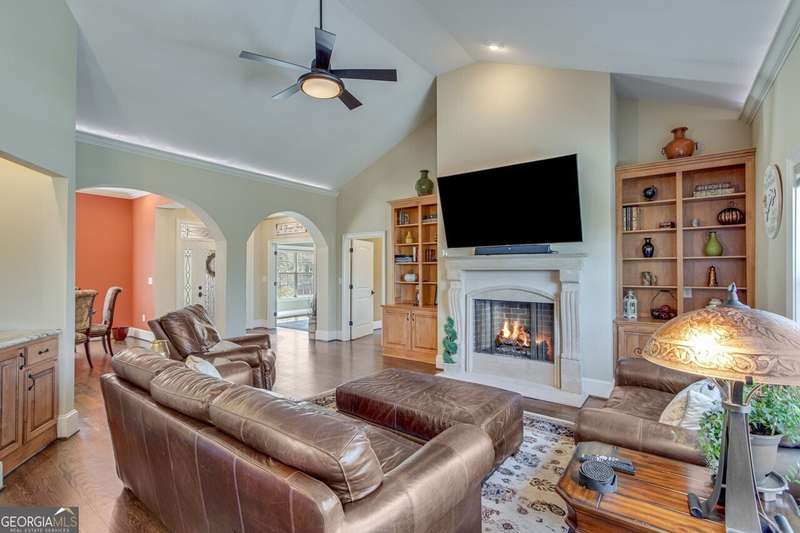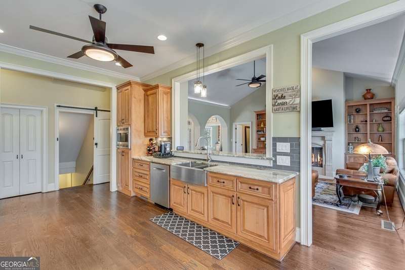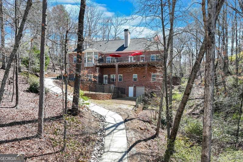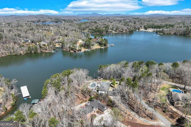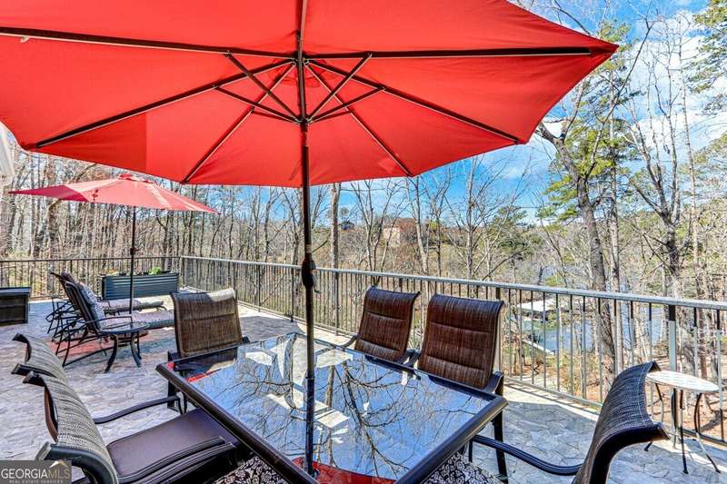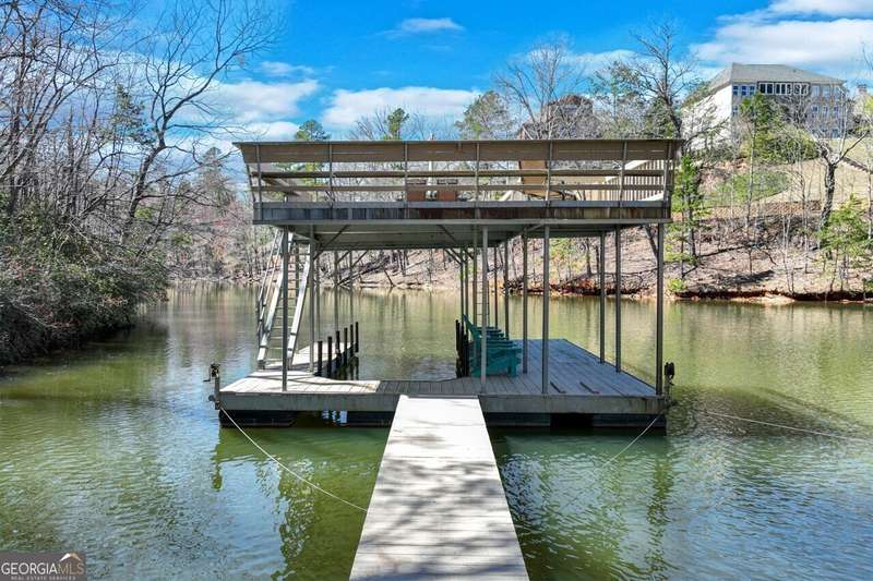 This elegant, traditional Lake Lanier home has everything you need for fine lake living! Conveniently located just 10 minutes from downtown Gainesville, The Rowing Venue, the hospital district, shopping, and restaurants, this home is designed for the ultimate lakefront lifestyle. With stunning lake views from most rooms, it also features a paved path leading to a single-slip party dock in deep, calm, no-wake waters-perfect for lounging and swimming. Situated on a double lot with a low CORPS line, the property offers a circular driveway and abundant parking, along with a drive-around access to the lower-level double garage-ideal for a golf cart, boat toys, a workshop, and extra storage. Inside, the main floor boasts an open layout with all hardwood floors. The great room, featuring a striking stone wood-burning fireplace, flows seamlessly into the kitchen, which includes granite countertops, a double gas range, and high-end Thermador appliances. A dining room and a study/office complete this space. The oversized primary suite is a true retreat, featuring a sitting area, double custom closets (one with a double-stack washer/dryer), heated travertine tile floors, a jacuzzi tub, a spacious shower, and double granite vanities. Additionally, the main level includes a second ensuite bedroom, a powder room, and a large laundry room. Upstairs, you'll find a guest bedroom, a full bath, and a large bonus room over the garage. The beautifully finished terrace level, completed in 2015, offers luxury vinyl flooring, a family room with a second stone wood-burning fireplace, a full kitchen with all appliances, a dining area, a large game room, a full guest bath, and an ensuite with its own private bath-perfect for entertaining or multi-generational living. Every bathroom is equipped with heated travertine tile floors, and the home features only hardwood and luxury vinyl flooring-no carpet. This exceptional Lake Lanier property combines elegance, functionality, and the best in lakeside living!