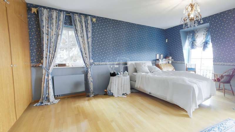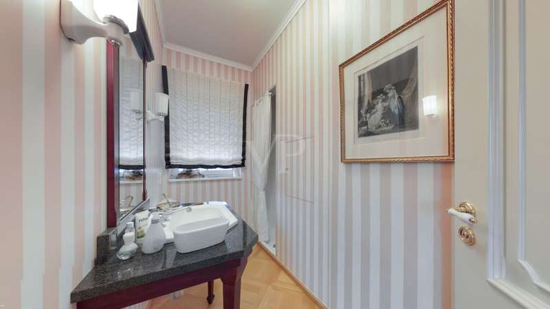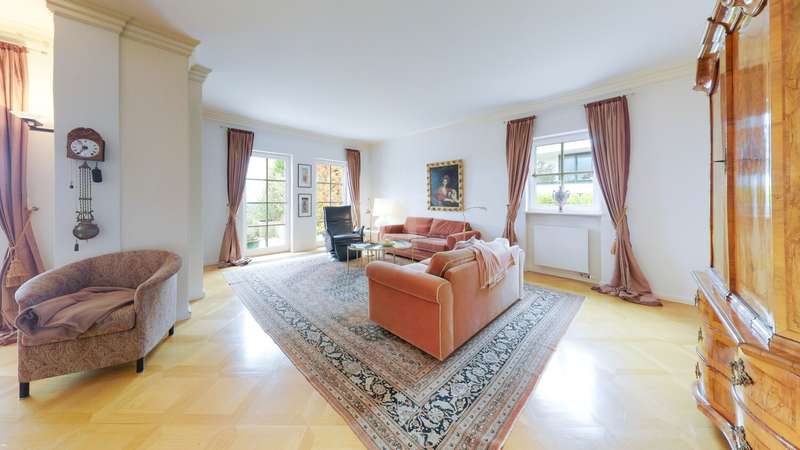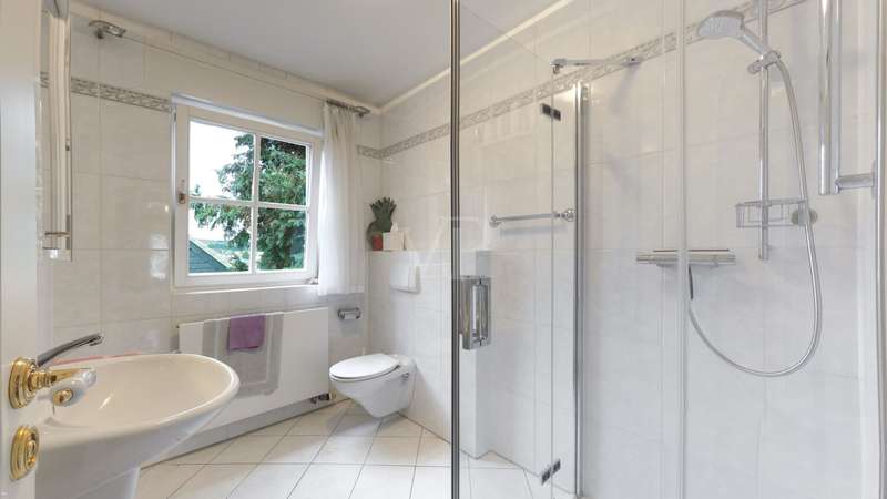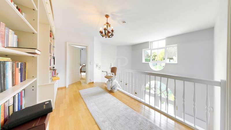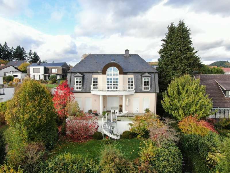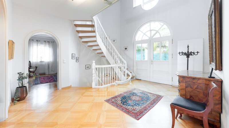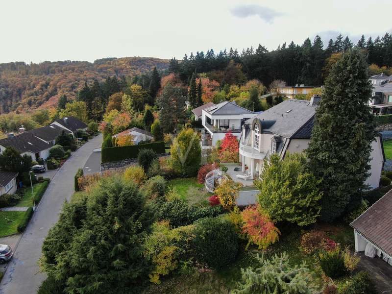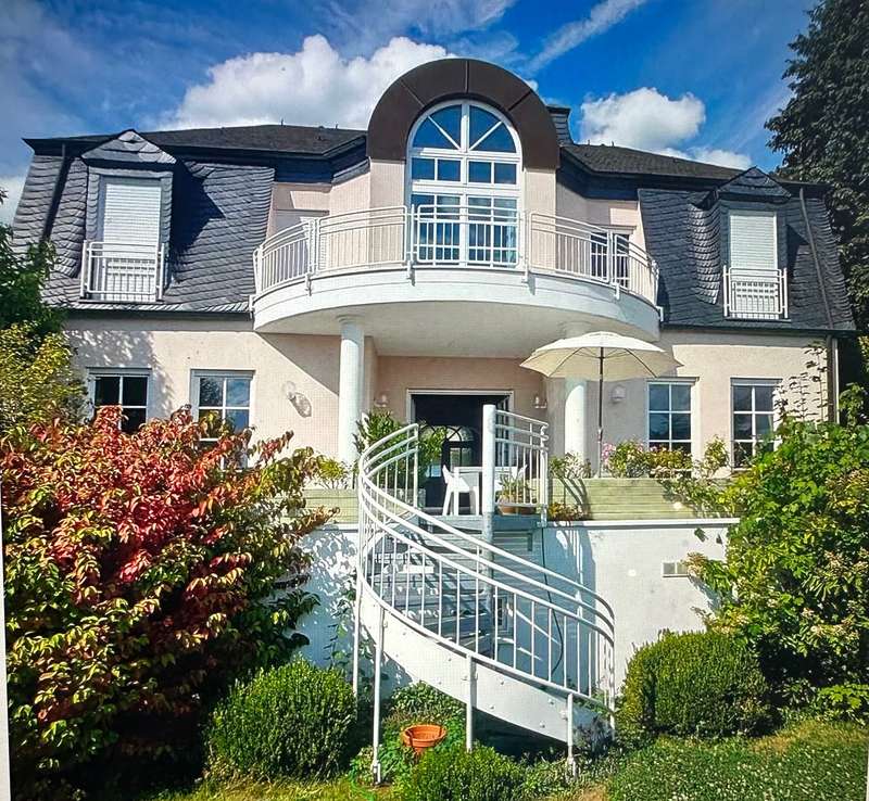 This elegant town villa in classicist style impresses with its timeless architecture, high-quality fittings and its privileged location with unobstructed panoramic views over the Neuwied basin as far as Koblenz. Built in 1993/94 in solid construction, the property offers around 321 m² of living space in a sunny elevated location in Melsbach - ideal for families, multi-generations or living and working under one roof. Spacious, light-flooded rooms with fine real wood parquet flooring, marble floors and lovingly designed details create a stylish living ambience. The spacious living and dining area with Swedish tiled stove and direct access to the terrace forms the heart of the house. Two fully equipped kitchens and three high-quality bathrooms - one of which is en suite - underline the high level of living comfort. The upper floor features bright bedrooms with custom-made fixtures and fittings, while the basement offers a complete granny apartment of 72 m² with separate access - perfect for guests, relatives or a home office. Electric blinds, an alarm system, a stair lift and fiber optic connection up to 250 MBit/s round off the modern features. This villa combines classic elegance with modern living quality and offers space, tranquillity and far-reaching views - a home with character and style.
