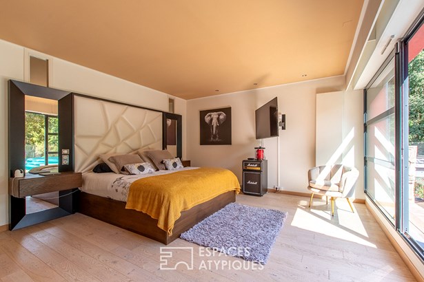 The large living rooms bathed in light, the large bay windows, and the high-end amenities make it an ideal living space for relaxing and entertaining. Access to the interior of the house is through a majestic wooden door, a true museum piece. Once through this door, a vast hall is bathed in light, with a bar to welcome guests in the best conditions. This hall gives access on one side to a first sleeping area and a games room and on the other to the living rooms. Finally, a beautiful and very airy staircase leads to the first floor. As for the living rooms, the ground floor offers an office, a large living room with a contemporary fireplace and a panoramic view of the terrace, the garden and the pond, a library, a reception room for a dozen guests, a small family dining room, and a vast kitchen with very complete and high-end equipment. The other part of the ground floor houses a guest bedroom with its bathroom, a games room with a bar and a video area. Upstairs, a first suite with bedroom, living room, terrace and bathroom allows to offer guests a private and intimate space.
