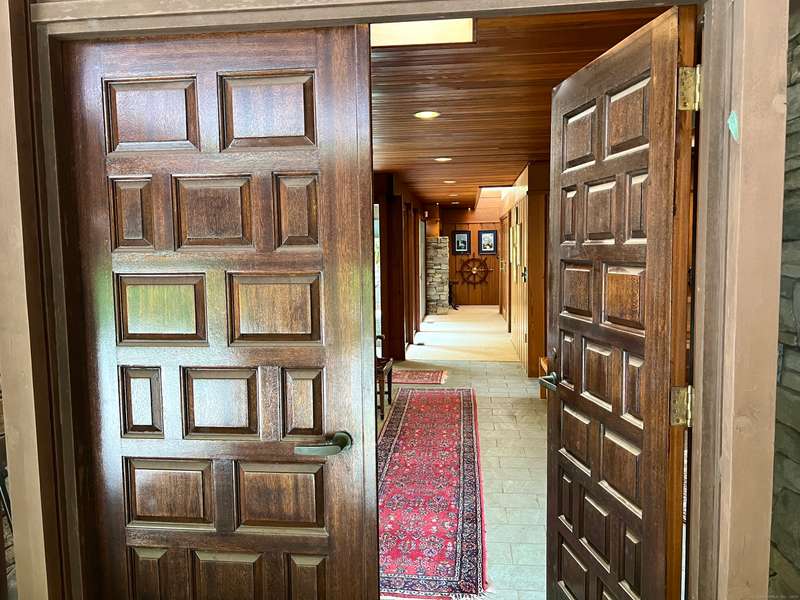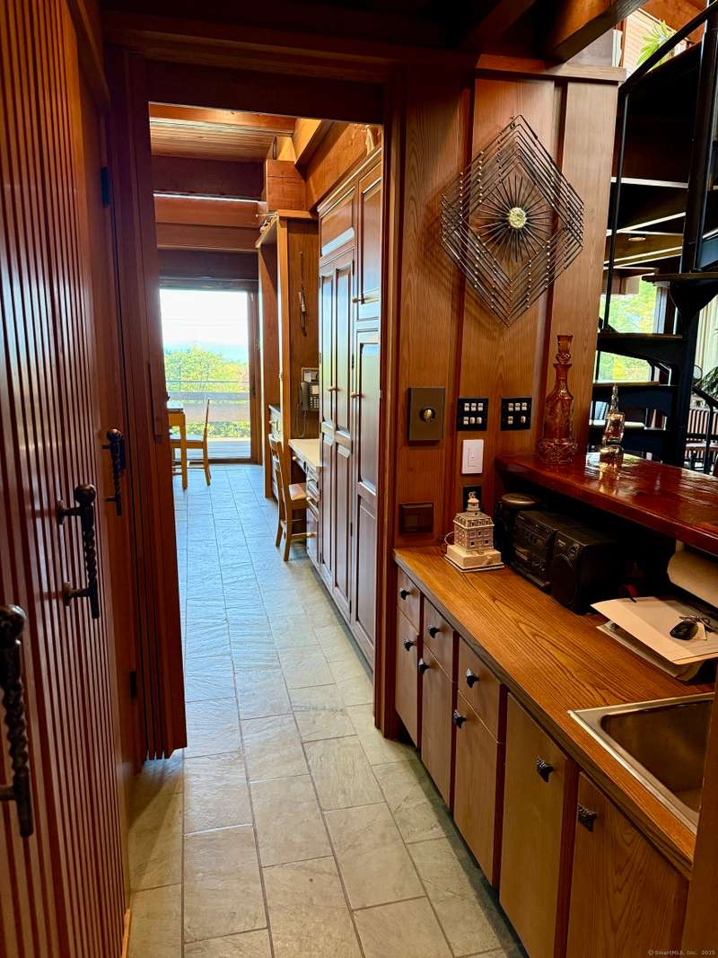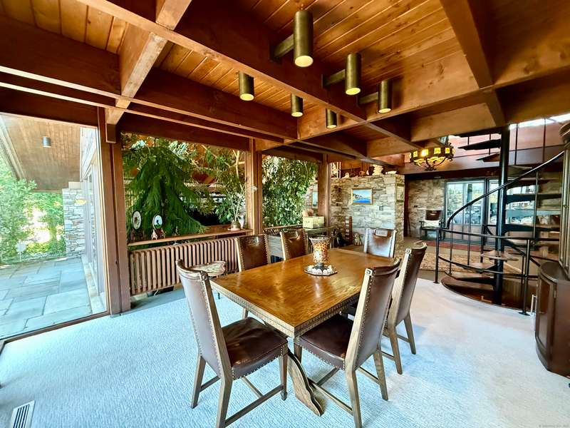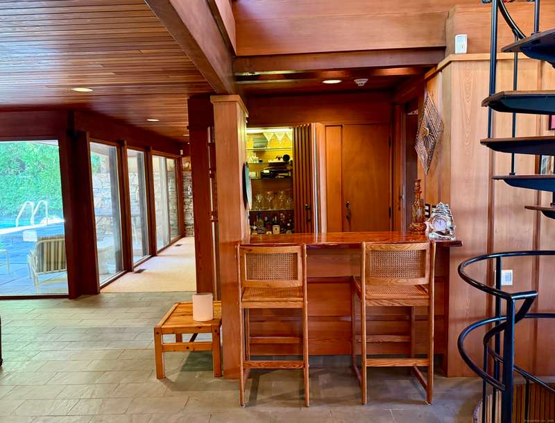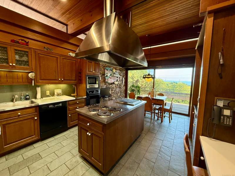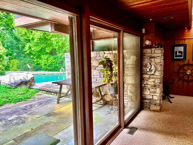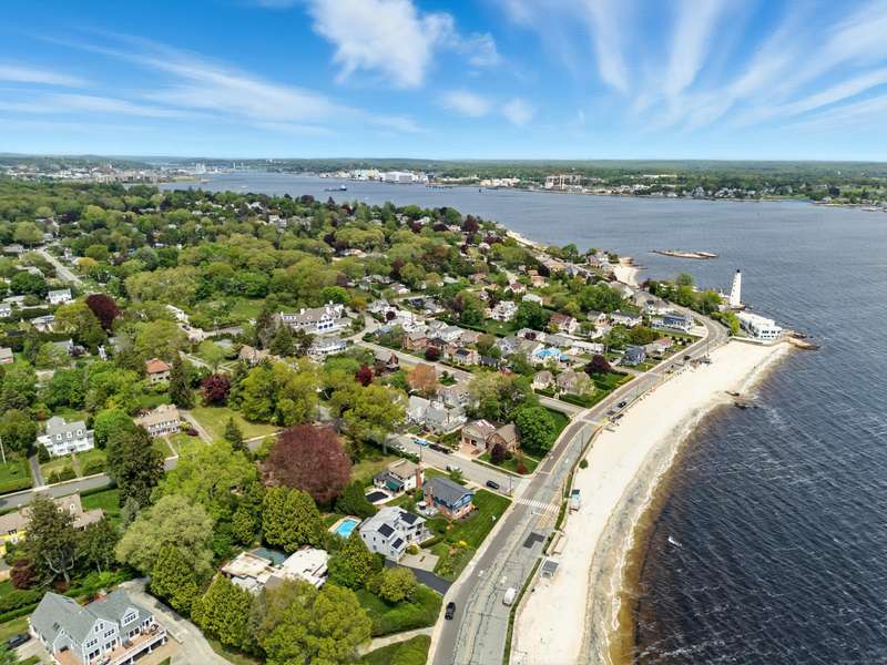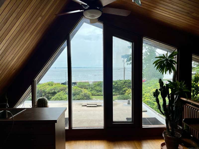 AMAZING WATERFRONT CUSTOM BUILT HOME WITH BEAUTIFUL POOL AND PRIVATE BEACH. This unique mid-century waterfront home designed by renowned architect Vincent Amore is nestled on a peaceful park-like setting that is surrounded by mature trees and adorned with a tranquil in-ground pool. This truly exceptional one-of-a-kind custom built home is in the Prairie style, reminiscent of Frank Lloyd Wright. It offers three en-suite bedrooms, four full bathrooms, a finished walk-out lower level and a wonderful loft with incredible water views. It offers 3435sf on .66 private acres and is beautifully positioned with unobstructed views of New London Ledge Light, Fishers Island and Long Island Sound. Every room has a "water view" with windows facing either the ocean or the pool. The sides facing neighboring properties are illuminated with clerestory windows creating a very private and secluded setting. The interior and exterior merge seamlessly featuring a marriage of glass, stone and shiplap. This pro