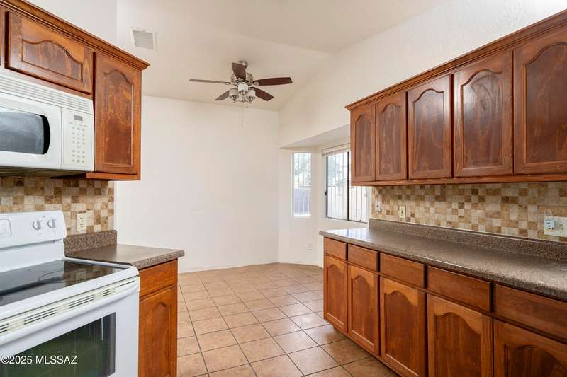 Charming 3-bedroom, 2-bath Tucson home in Midvale Park! This move-in ready property features tile flooring throughout, a bright kitchen with dark wood cabinets, and all appliances included. Enjoy the comfort of newer plumbing, water heater, and central A/C (2021). The spacious primary suite offers generous closet space, and a large bathroom vanity with neutral tiled bathtub. Upgraded shower in guest bathroom. Private and spacious backyard area with a large covered patio. Leased solar panels keep your electric bills low!