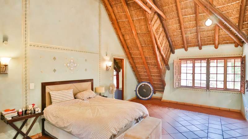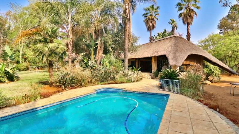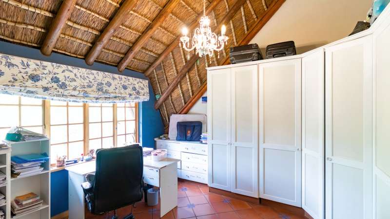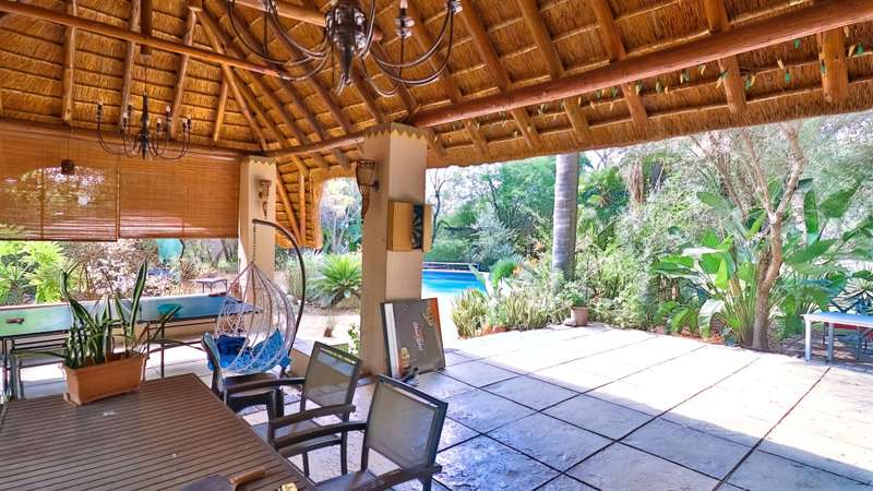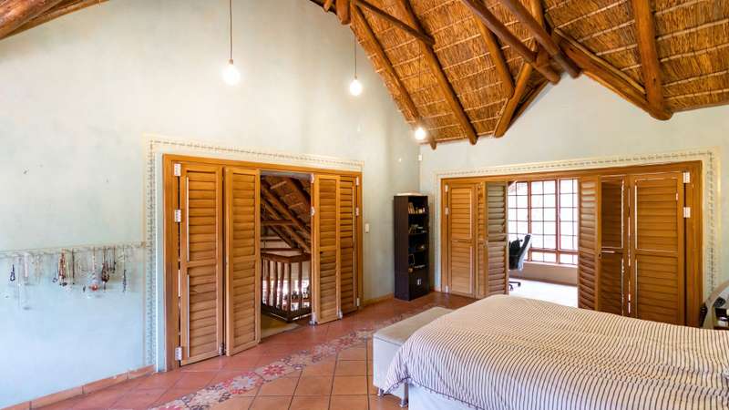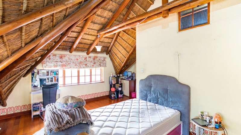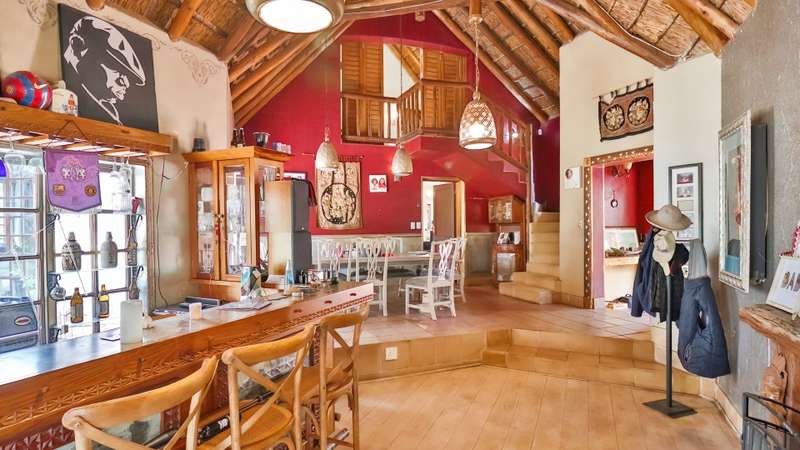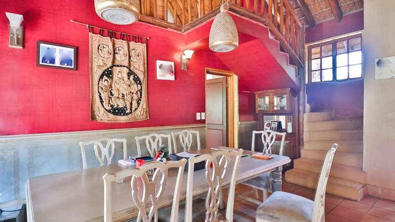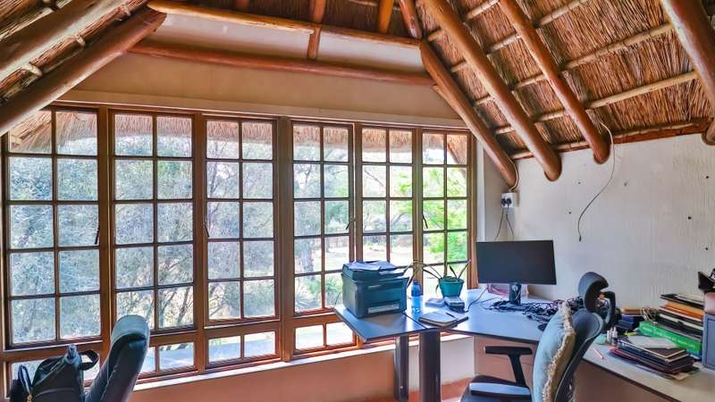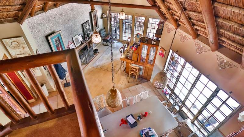 Bank Assisted Sale This lovely characteristic country-style home offers privacy and security and is tucked away down a pan-handle in a peaceful, secluded setting. Beautifully crafted, it offers the perfect blend of rustic farm-style charm and modern convenience. Designed to embrace indoor-outdoor living, the home showcases natural materials and expansive glasswork to create an atmosphere of light and warmth. Step through solid wooden doors with stained-glass detailing into spacious open-plan living areas, thoughtfully designed for both relaxation and entertaining. A dedicated entertainment wing features a built-in bar, wood-burning fireplace, and flows seamlessly onto a large undercover patio looking over the pool and landscaped tropical garden. Perfect for year-round gatherings with friends and family. The lounge area has lovely wooden floors. The sunny living room invites comfort with its bay windows, French stacking doors, and another cozy fireplace and a big skylight. At the heart of the home lies the country-style kitchen, complete with ILVE double oven, big gas stove, stone countertops, a generous scullery with prep sink, and space for three appliances. A generous room off the kitchen can serve as a studio, home office or similar. Upstairs, the expansive main suite includes a luxurious full bathroom with double vanity, a private study area, and a large walk-in closet. An adjoining room provides additional flexibility — ideal as a nursery, dressing room, or second office. A third bedroom with its own entrance and private bathroom (with double basin and walk-in shower) offers excellent potential for a guest suite or independent living. Downstairs, two more well-appointed bedrooms share a unique full bathroom. A separate, spacious cabin with private access provides endless opportunities — whether as an art space, home gym, or guest cottage. Additional Features include: Borehole and water tanks Chlorine swimming pool with heat pump Solar geyser Landscaped garden with computerized irrigation Staff accommodation Three covered carports State-of-the-art security: alarm system, CCTV, electronic beams, security gate, and automated entrance High-speed WiFi available This thatch home is a blend of thoughtful modern living in a setting of complete serenity. If the buyer goes through the assisting bank, the bond registration fees are discounted by 50%. Disclaimer: Every effort has been made to ensure the accuracy of this brochure. We cannot be held liable for any inadvertent errors or omissions.