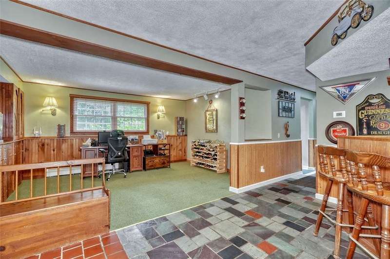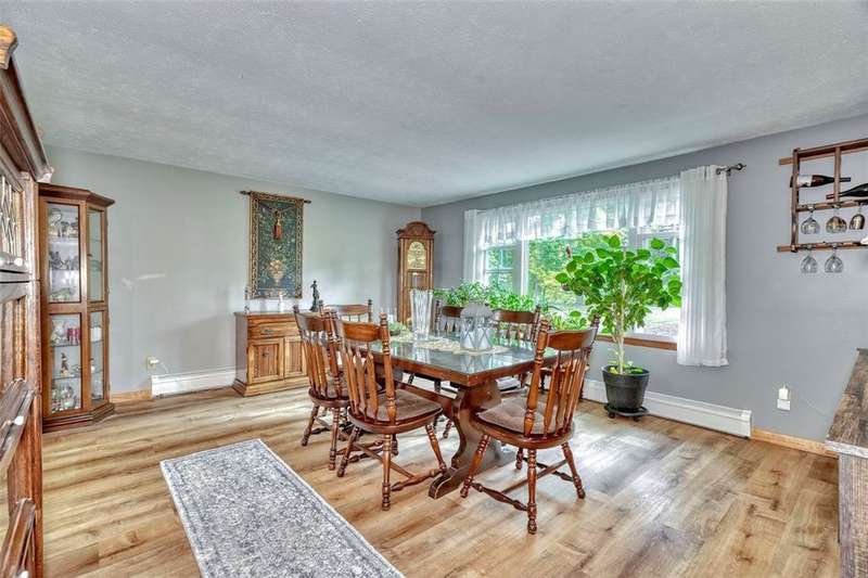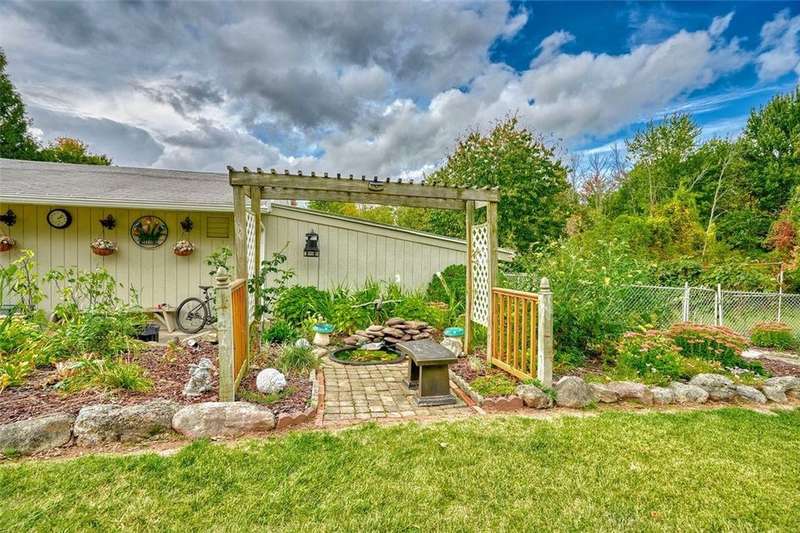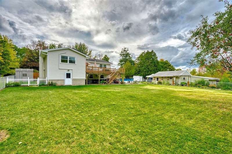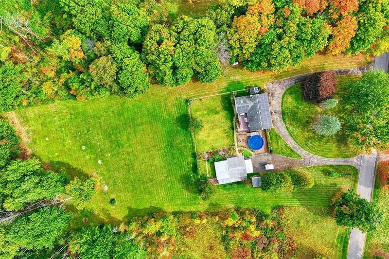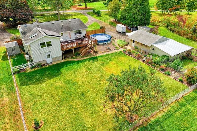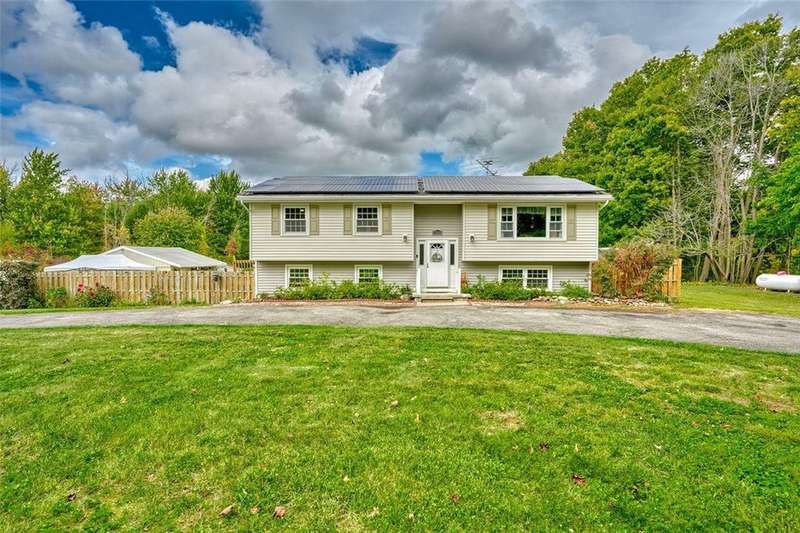 Spacious, beautifully maintained and updated home on 3.5 acres with flexible living options including possible in-law set up! Updates include: Remodeled kitchen with hickory cabinets, pull-outs and soft close doors * Updated baths on both levels * New windows & doors (5 yrs.) * New boiler (2 yrs) with vinyl baseboard covers * Whole house generator (1 yr) * New LVT flooring throughout first floor (completed prior to closing) * On demand hot water tank * Above ground pool (4 yrs) * Solar panels to keep electric bills low * Other highlights include zoned heating, huge family rm / sunroom with cathedral ceiling, skylight & door to large composite deck with patio below, detached garage with 2 workshop/storage rooms & door to chicken coop (garage has it's own electric panel), walk-out lower level with family room featuring a built-in bar with tap, two additional bedrooms, full bath, laundry & 2nd kitchen. Amazing private and serene setting with fenced in play area, gardens, waterfall pond, dog pen & landscaped areas with woods in the rear. Too many features to list - additional notes in attachments ? this is a must see! Delayed negotiations to Wed, 10/1 at 1pm.
