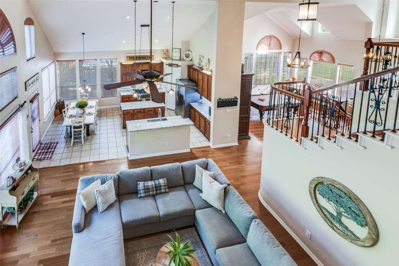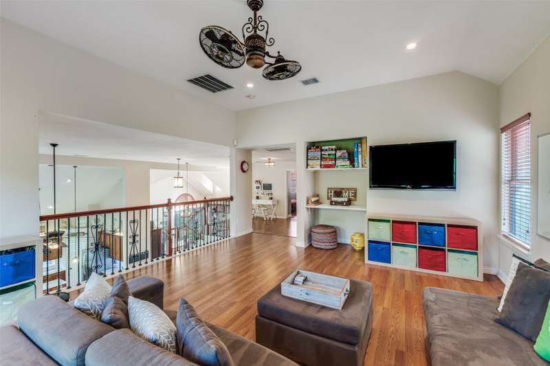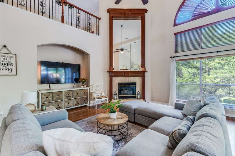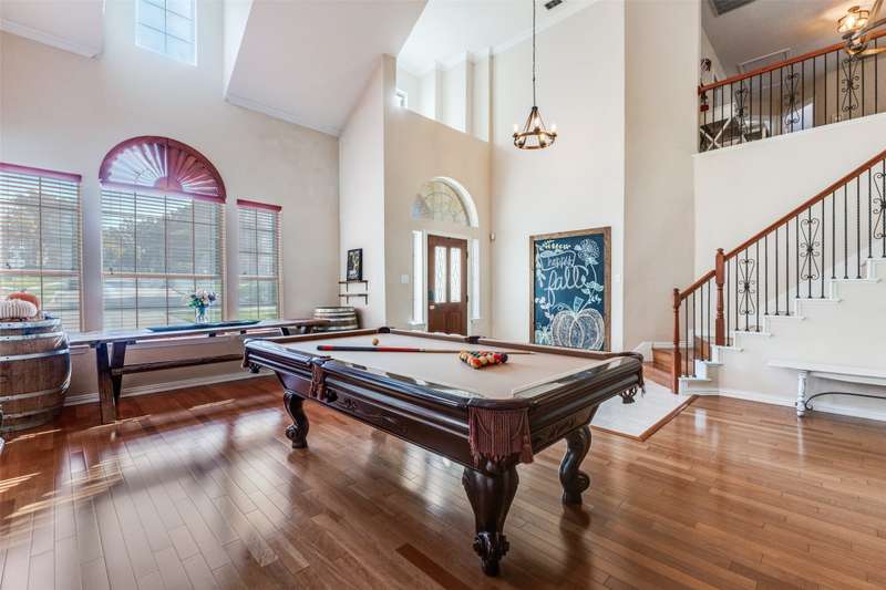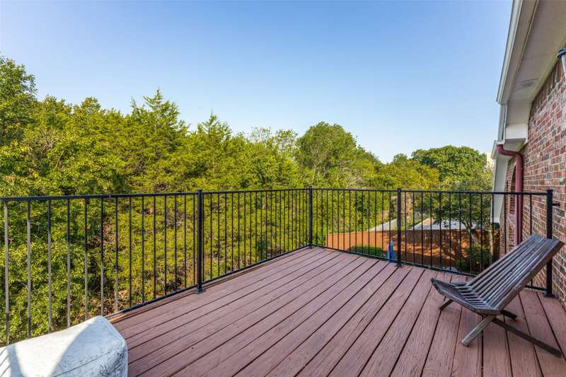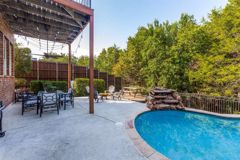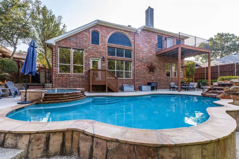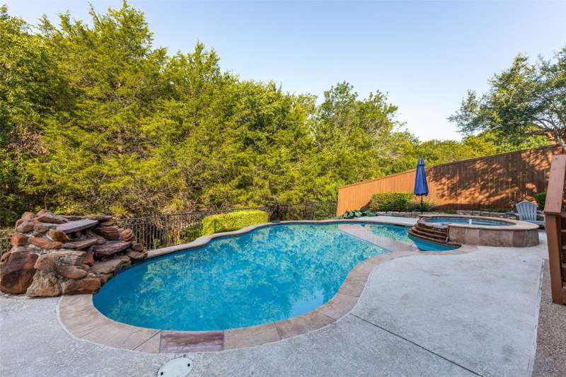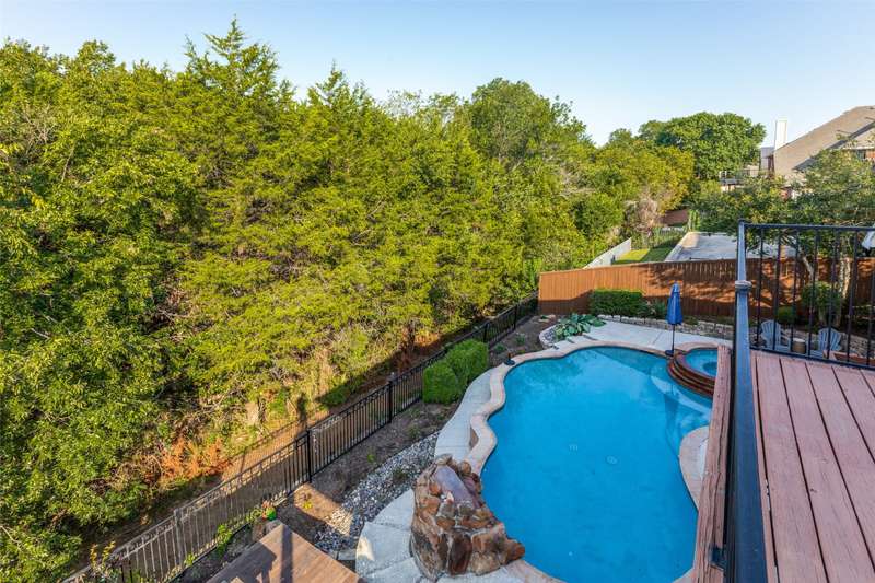 Your haven awaits on this desirable block in a beautiful neighborhood. Discover traditional beauty on the Rowlett Nature Trail, which is great for the entire family. At the end of the trail, you will find partial views of Lake Ray Hubbard. This inviting home is great for family living and entertaining with its open floorplan and many living spaces. An inviting kitchen with a central island and sunny eat-in space that opens right into the family room, makes it easy to cook, connect, and spend time together. The convenient first-floor layout offers a primary suite plus an additional bedroom perfect for guests, in-laws, or a nursery. The primary suite is a true retreat, with a private en-suite bath featuring dual sinks, soaking tub, a walk-in shower, and a generously sized walk-in closet. Upstairs offers three additional bedrooms, two full baths, an open loft, and a large game room ideal for family fun and everyday living. Enjoy exceptional outdoor living with covered and open patios, a balcony overlooking the treetops, and a sparkling pool with spa and cascading waterfall for year-round enjoyment.