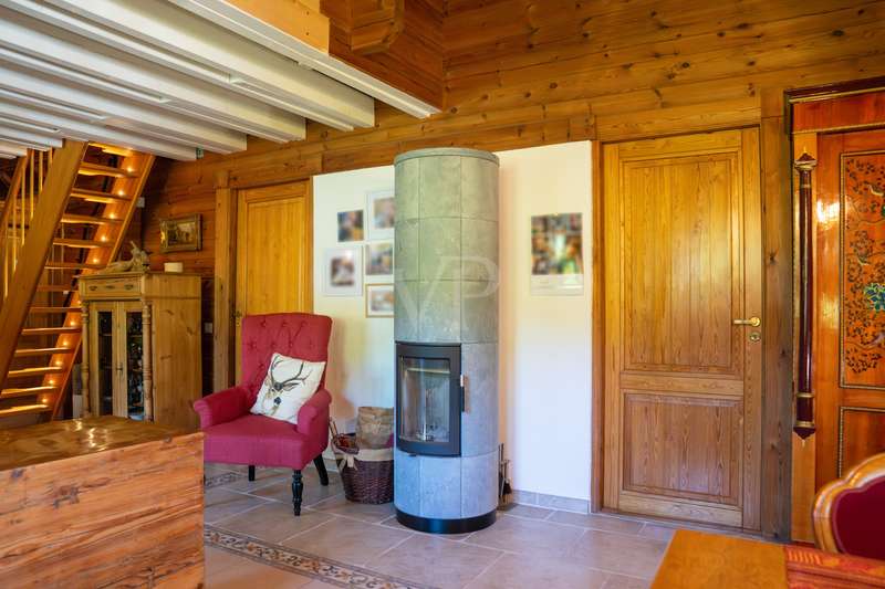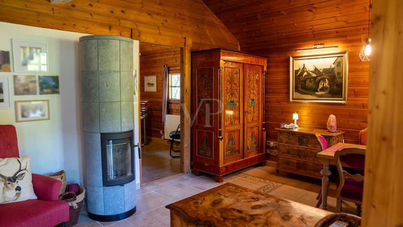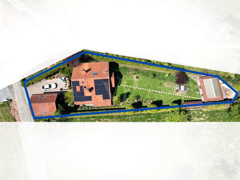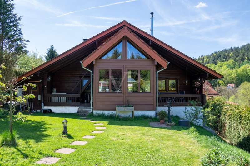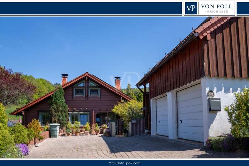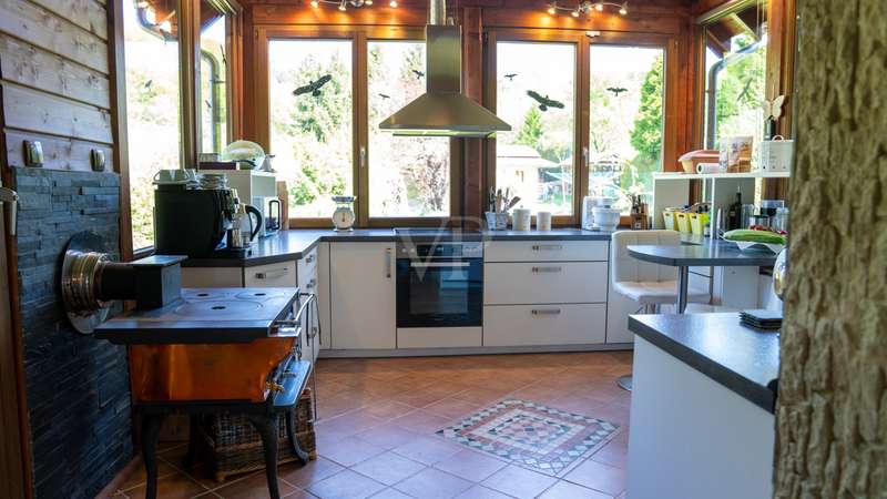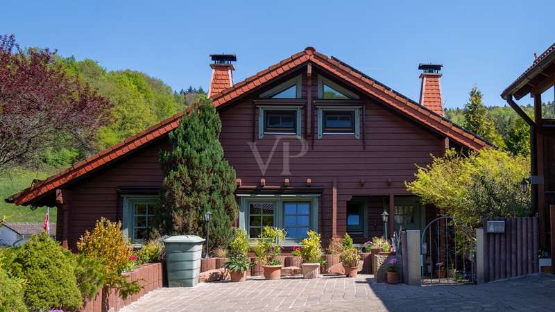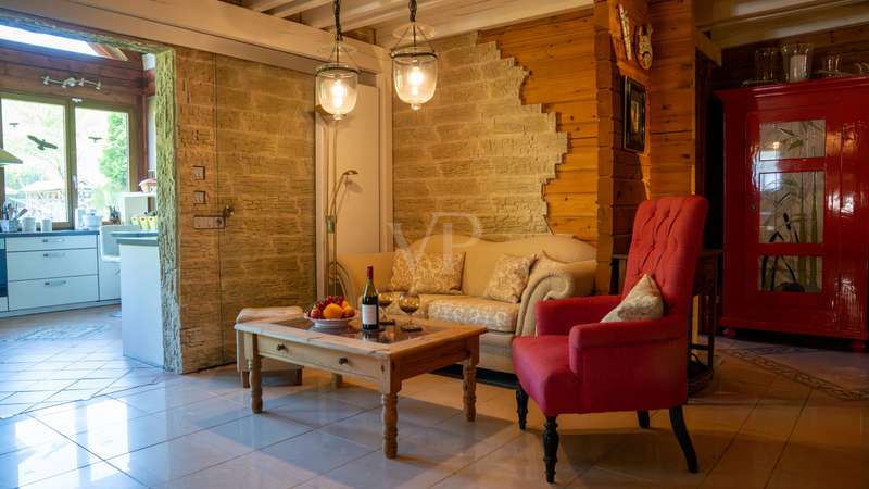 Idyllic, natural property on the edge of a quiet field in Beerfelden/Olfen. The house is at ground level. In the entrance area of the property you will find the WC and the bathroom including a walk-in shower and bathtub. A highlight of this area is the sauna, which invites you to relax and feel good. In this area there is also a further room for free use. The modern open-plan living/dining area conveys a very special charm thanks to the wooden plank construction of the house. This ambience is perfectly complemented by the wood-burning stove in the center of the room. Seamlessly connected to this area are two further rooms that can be used as an office or additional bedroom units. There is also an open kitchen to the rear of the house, which is separated from the other areas by a sliding glass element. The kitchen area is flooded with light thanks to the wide window fronts, and in this area there is a traditional stove as well as a wood-burning stove individually adapted to the conditions, which offers an additional cooking function. Two covered balconies can be accessed seamlessly from the kitchen, with the right-hand balcony providing direct access to the garden. The master bedroom and a room suitable for office use are located on the top floor of the house. The utility room can be reached via the right-hand balcony at the rear of the house. The house is equipped with an approx. 9.9 kWh photovoltaic system. The spacious garden area with outdoor seating and covered pool, as well as wood storage, leaves nothing to be desired. The garden area is also fully fenced. The excellent offer is rounded off wonderfully by a double garage incl. wallbox and the single apartment above the garage.