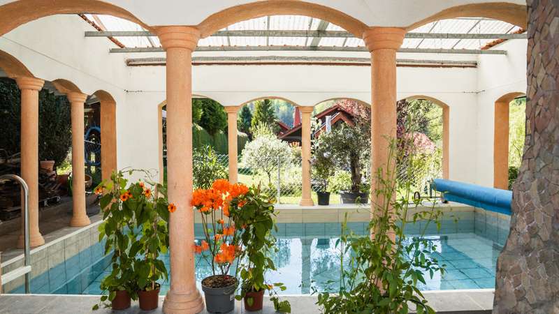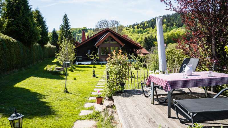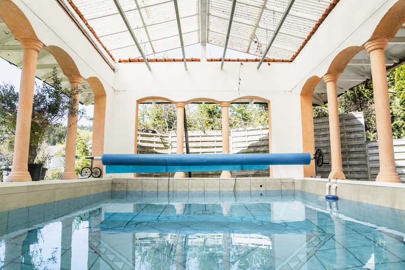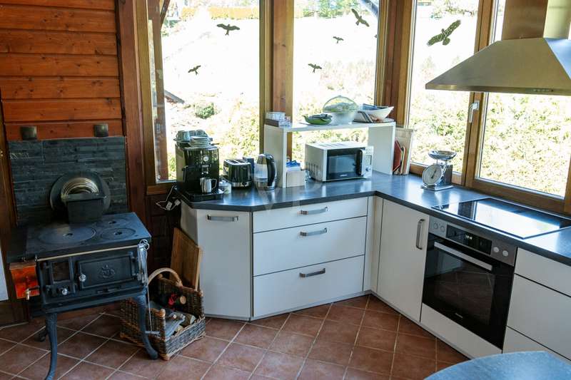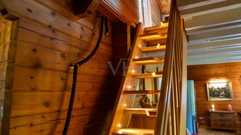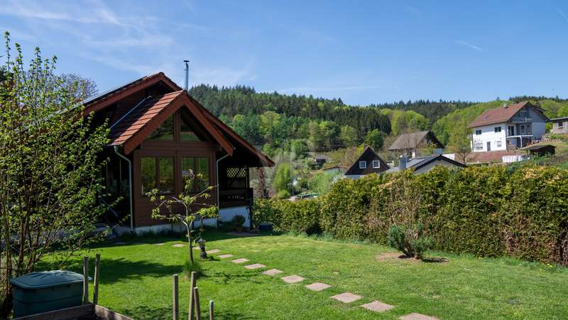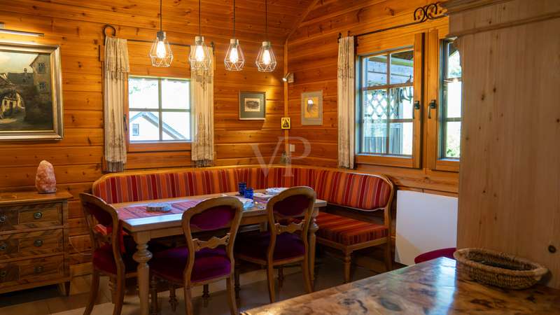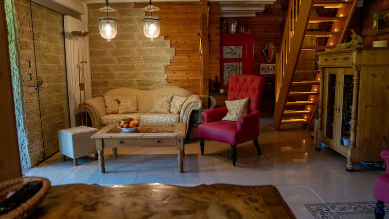 Idyllic, natural property on the edge of a quiet field in Beerfelden/Olfen. The house is at ground level. In the entrance area of the property you will find the WC and the bathroom including a walk-in shower and bathtub. A highlight of this area is the sauna, which invites you to relax and feel good. In this area there is also a further room for free use. The modern open-plan living/dining area conveys a very special charm thanks to the wooden plank construction of the house. This ambience is perfectly complemented by the wood-burning stove in the center of the room. Seamlessly connected to this area are two further rooms that can be used as an office or additional bedroom units. There is also an open kitchen to the rear of the house, which is separated from the other areas by a sliding glass element. The kitchen area is flooded with light thanks to the wide window fronts, and in this area there is a traditional stove as well as a wood-burning stove individually adapted to the conditions, which offers an additional cooking function. Two covered balconies can be accessed seamlessly from the kitchen, with the right-hand balcony providing direct access to the garden. The master bedroom and a room suitable for office use are located on the top floor of the house. The utility room can be reached via the right-hand balcony at the rear of the house. The house is equipped with an approx. 9.9 kWh photovoltaic system. The spacious garden area with outdoor seating and covered pool, as well as wood storage, leaves nothing to be desired. The garden area is also fully fenced. The excellent offer is rounded off wonderfully by a double garage incl. wallbox and the single apartment above the garage.