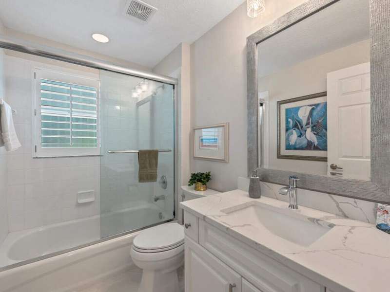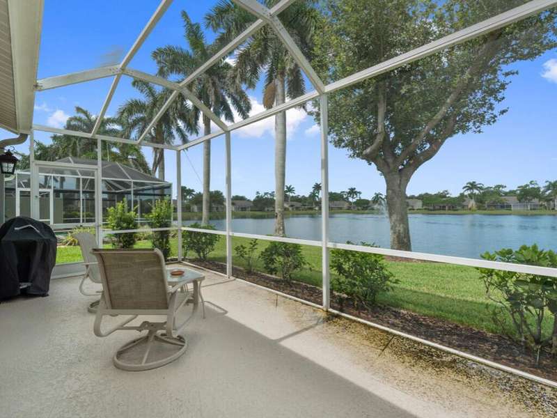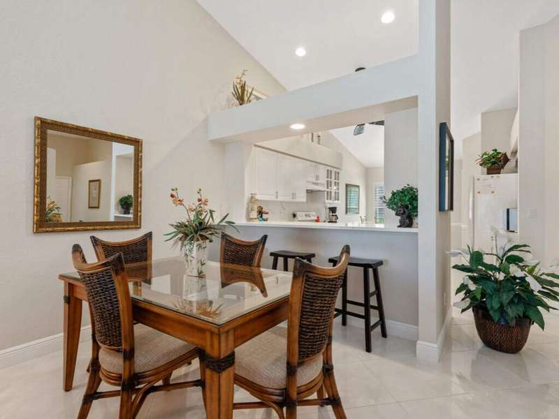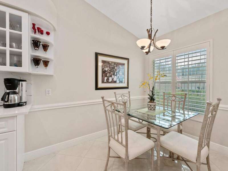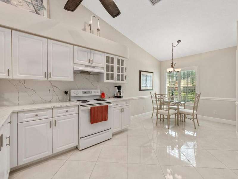 Welcome to The Villas at Greenwood-a serene, gated enclave just under 3 miles from vibrant Downtown Naples and its world-renowned beaches. This beautifully updated 3-bedroom, 2-bath attached villa with a two-car garage offers an ideal blend of comfort, style, and location-all with low HOA fees. Step inside and discover a pristine interior with soaring cathedral ceilings and modern, high-gloss tile flooring throughout the main living areas and primary bedroom. The remodeled kitchen shines with white marble-look countertops and backsplash, ample cabinetry, and a generous eat-in area overlooking the landscaped front yard. A wide passthrough opens to the spacious great room, perfect for casual entertaining with room for multiple bar stools. The primary suite offers peaceful lake views and an en-suite bath featuring double vanities with quartz countertops and sleek new shower doors. The third bedroom, currently used as a den/office, features warm wood flooring, providing flexibility to suit your lifestyle. Enjoy your evenings on the screened lanai, where stunning sunsets reflect off the tranquil lake-a perfect setting for unwinding with your favorite beverage. For peace of mind while you're away, the villa includes electric hurricane shutters on the lanai and high-impact resistant clear shutters on all windows. This home is offered completely turnkey furnished with tasteful, quality furnishings-just bring your suitcase!