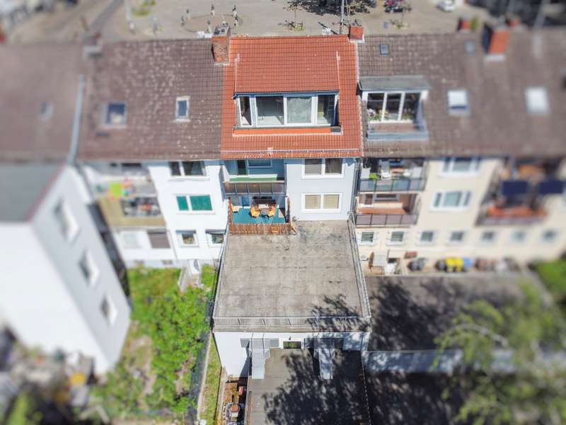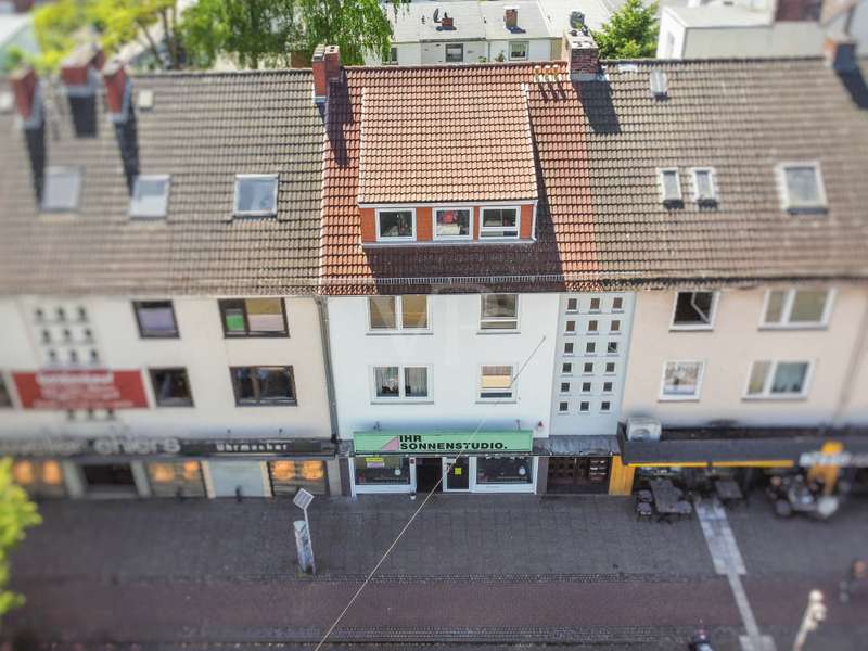 Built in 1956 and extended with a flat-roof extension in 1976, this residential and commercial building is located in Bremen's Westend district, which is characterized by stable demand, urban character and excellent connections. The property combines two well-designed residential units with a spacious commercial space on the first floor, which has been successfully operated as a tanning salon for 30 years now. In addition, there is an enormous amount of usable space with development potential, making this property an interesting investment with development potential. Both apartments each have three rooms, a bathroom, a separate kitchen and a balcony. The apartment on the 1st floor is rented out. The apartment on the 2nd floor was deliberately kept empty for family reasons. The attic, which has not been converted, offers the opportunity to create attractive living space thanks to the existing heating connection, insulation and generous window areas in the dormer and loggia. A separate, heatable room in the basement with its own exit to the courtyard, a clear height of 2.20 m and two windows also opens up potential uses - whether as a 1-room apartment or a commercial unit. The technical equipment is in good overall condition: windows, plumbing and electrics have been successively modernized. The oil-fired central heating dates from 2006. The accessible area above the rear extension with a gross area of approx. 63 m² can be used as a roof terrace once the covering and parapet have been renewed. An assignment to the apartment on the second floor is optionally conceivable - either now with the tenants' consent or in the future when the property is re-let - and offers corresponding potential for rent increases.