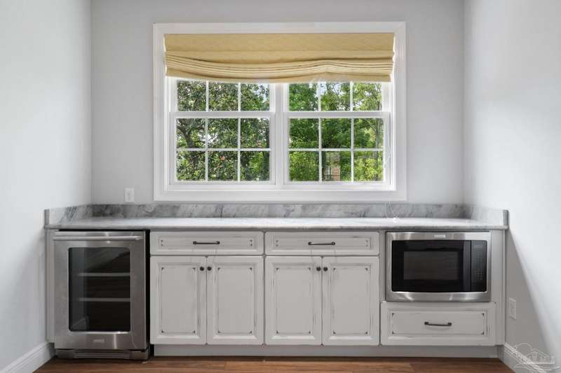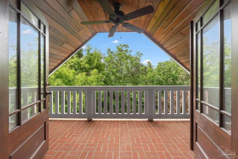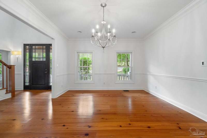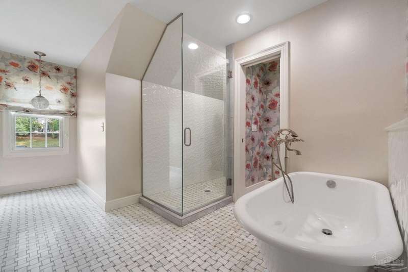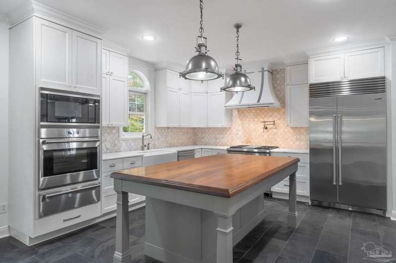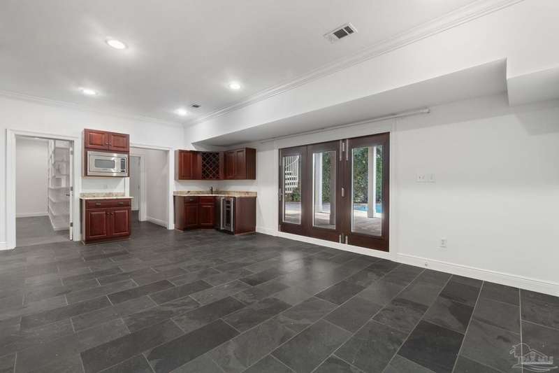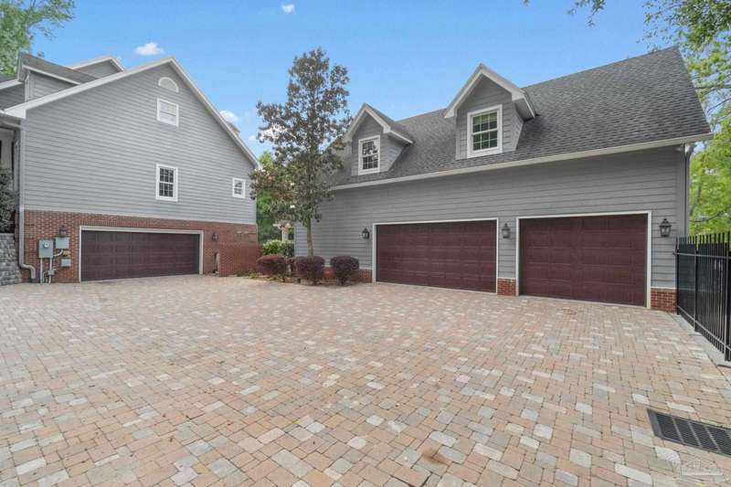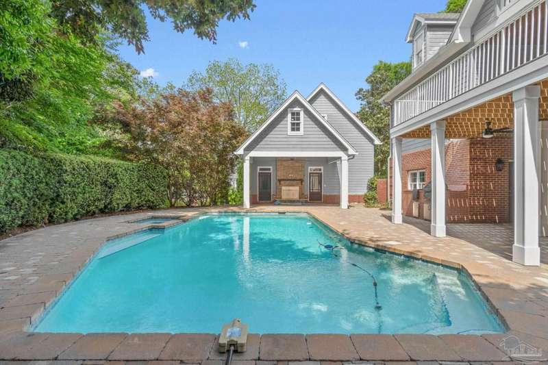 Opportunity awaits in Heritage Oaks with this distinctive pool home on a spacious lot bordered by mature woods, featuring a walkout basement and private studio apartment, offering an estate-like feel just minutes from downtown Pensacola. From the inviting curb appeal to the meticulously maintained grounds, this home blends character, functionality, and timeless design, ideal for multi-generational living. Inside, natural light fills the main living spaces, creating an effortless flow from the entryway to the formal dining room, office, and combined kitchen and den. Reclaimed heart-pine flooring and double doors leading to multiple outdoor living areas enhance the ambiance. The chef's kitchen is a true showstopper, featuring top-of-the-line stainless steel appliances, Marble countertops, ceiling-height white shaker cabinetry, and an elegant Arabesque tile backsplash. The custom oversized island offers generous prep space, while the beverage center includes a built-in wine refrigerator and serving station. An adjacent versatile area serves as an office/homework area, laundry room, and additional storage. The main-floor primary suite features a sophisticated ensuite with an expansive shower, Marble countertops, elegant Espresso cabinetry, and a soaking tub. Upstairs, additional bedrooms and beautifully appointed full baths continue the home's design aesthetic. In addition to the oversized two-car garage, a secondary three-car garage with upper-level living quarters and kitchenette offers endless possibilities-whether as a guest suite, art studio, or workout area. The home's outdoor entertaining space is equally impressive, with multiple areas designed for enjoying the pool. A covered porch with fireplace off the guest apartment offers convenient access to the pool changing area and shower, while a covered patio provides the ideal spot for lounging and escaping the sun. The pool deck and side yard with fire pit, make this home the ultimate year-round hosting space.