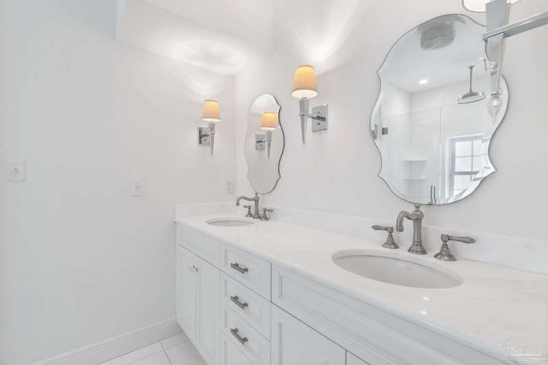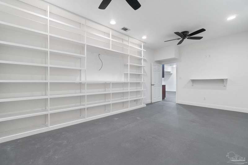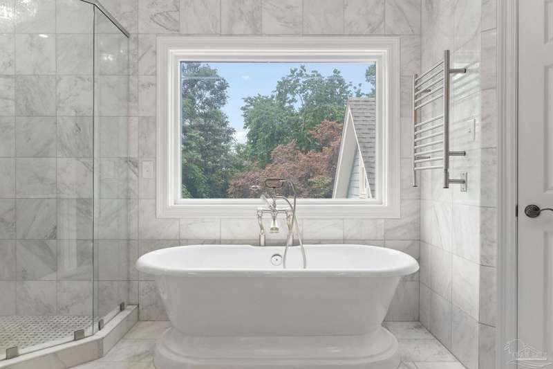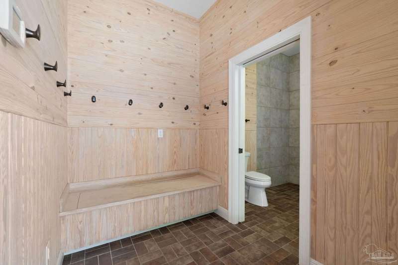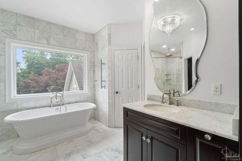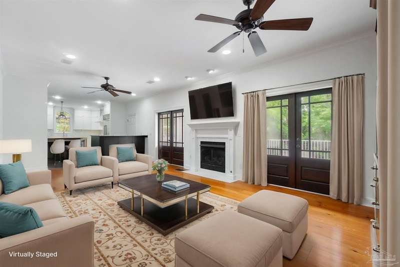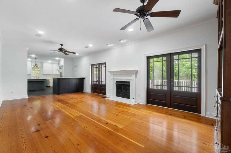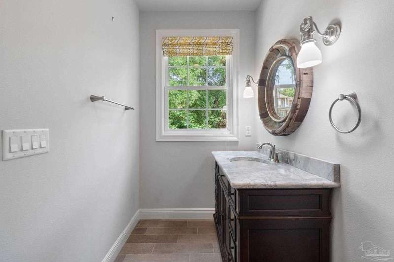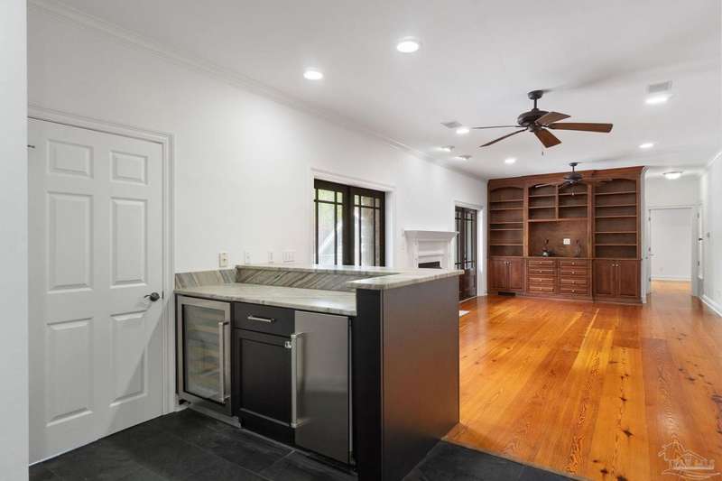 Opportunity awaits in Heritage Oaks with this distinctive pool home on a spacious lot bordered by mature woods, featuring a walkout basement and private studio apartment, offering an estate-like feel just minutes from downtown Pensacola. From the inviting curb appeal to the meticulously maintained grounds, this home blends character, functionality, and timeless design, ideal for multi-generational living. Inside, natural light fills the main living spaces, creating an effortless flow from the entryway to the formal dining room, office, and combined kitchen and den. Reclaimed heart-pine flooring and double doors leading to multiple outdoor living areas enhance the ambiance. The chef's kitchen is a true showstopper, featuring top-of-the-line stainless steel appliances, Marble countertops, ceiling-height white shaker cabinetry, and an elegant Arabesque tile backsplash. The custom oversized island offers generous prep space, while the beverage center includes a built-in wine refrigerator and serving station. An adjacent versatile area serves as an office/homework area, laundry room, and additional storage. The main-floor primary suite features a sophisticated ensuite with an expansive shower, Marble countertops, elegant Espresso cabinetry, and a soaking tub. Upstairs, additional bedrooms and beautifully appointed full baths continue the home's design aesthetic. In addition to the oversized two-car garage, a secondary three-car garage with upper-level living quarters and kitchenette offers endless possibilities-whether as a guest suite, art studio, or workout area. The home's outdoor entertaining space is equally impressive, with multiple areas designed for enjoying the pool. A covered porch with fireplace off the guest apartment offers convenient access to the pool changing area and shower, while a covered patio provides the ideal spot for lounging and escaping the sun. The pool deck and side yard with fire pit, make this home the ultimate year-round hosting space.
