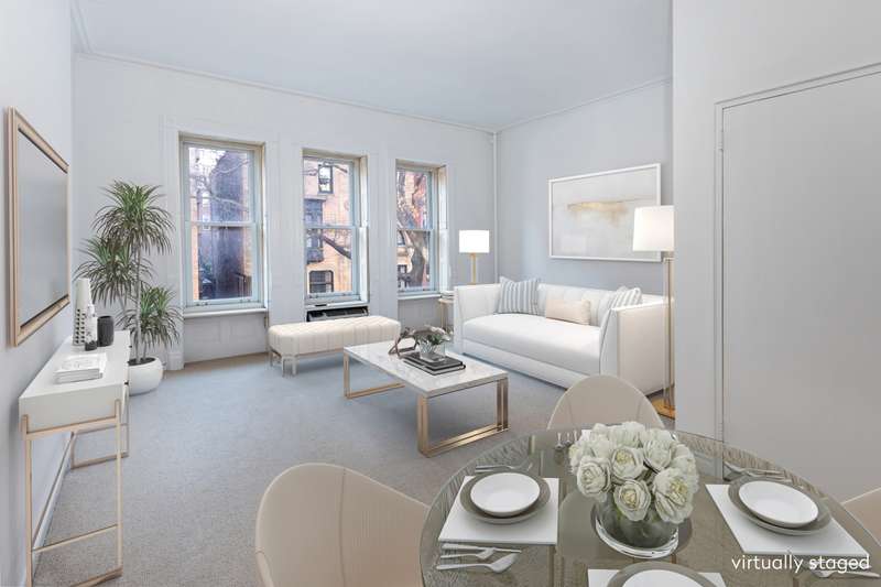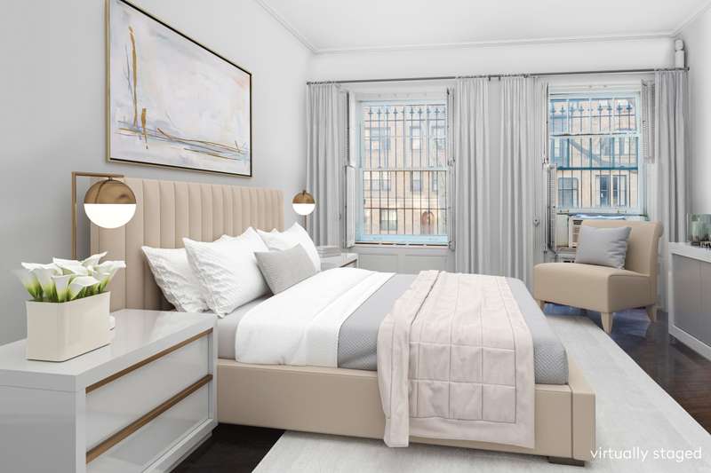 The interior staircase takes you to the upper floor of the owner's duplex which includes a north bedroom overlooking the garden with a walk in closet. The south facing sunny primary bedroom with a walk in closet overlooks 95th Street. Both bedrooms have full baths, additional closets and very high ceilings, just under eleven-feet.