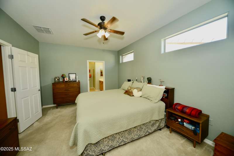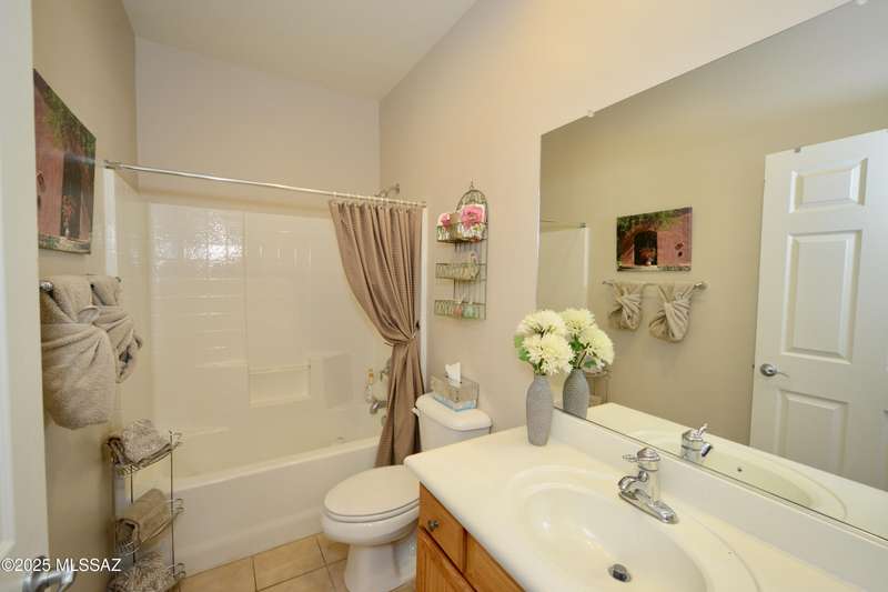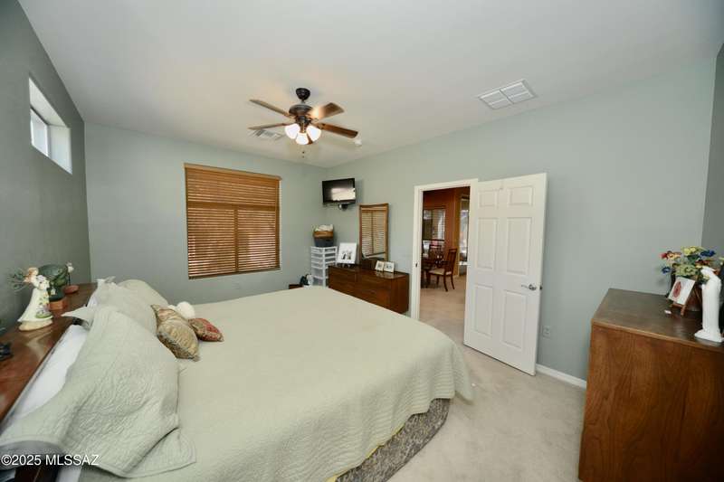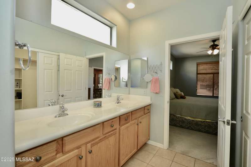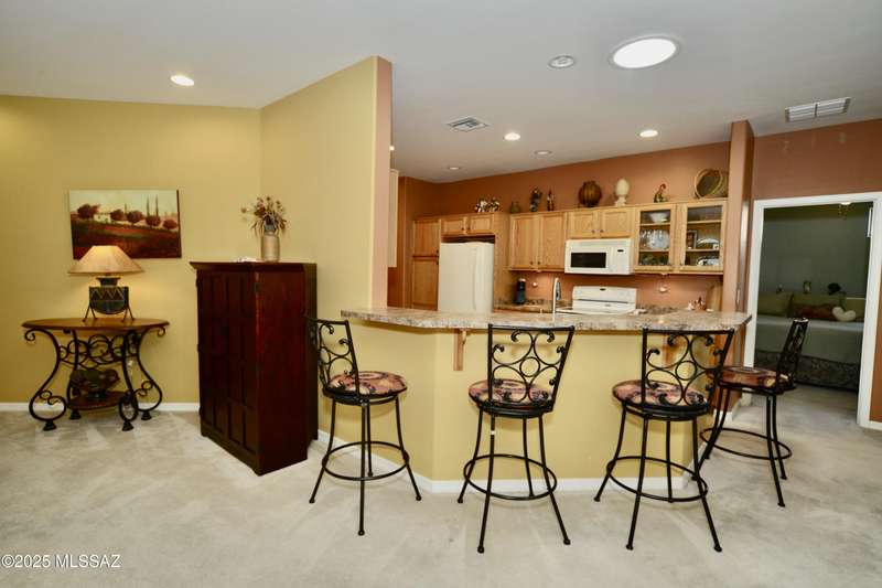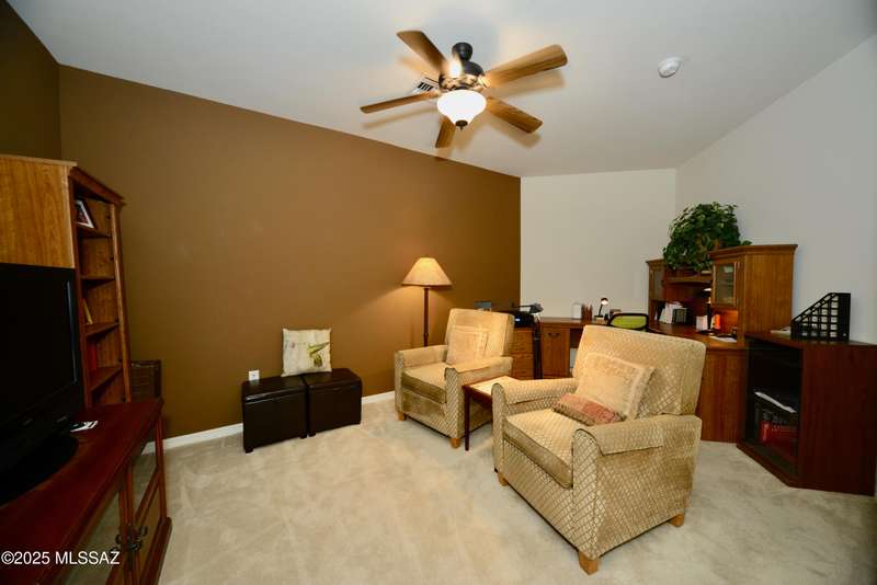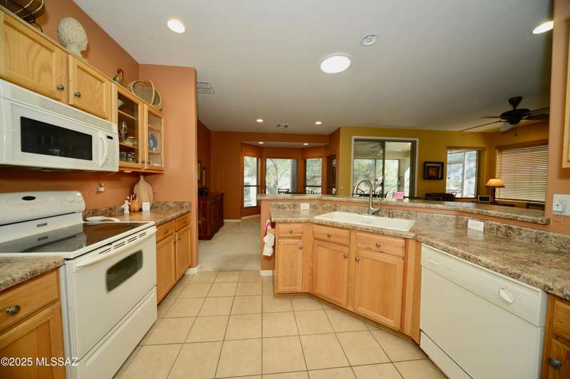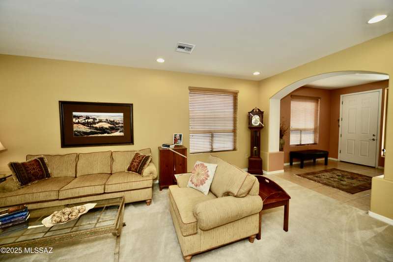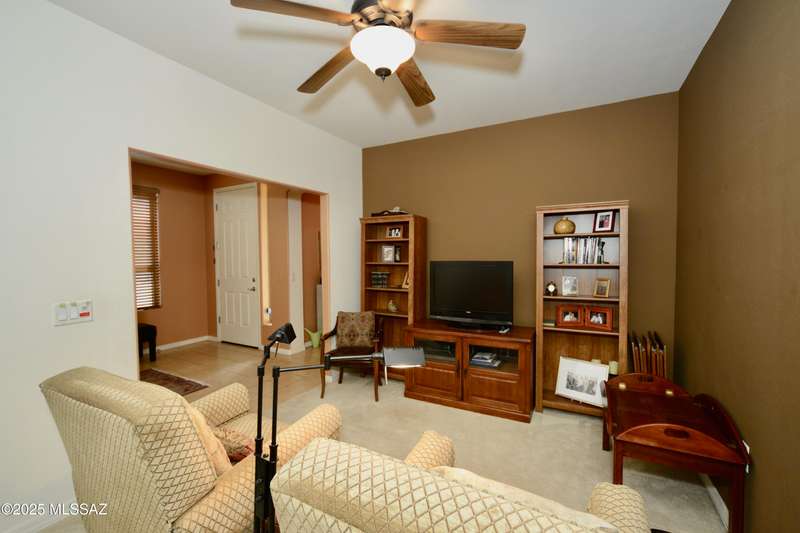 Stand-alone corner home in gated Las Campanas Village offers 1,757 sq ft of easy living with a 2-bed split floor plan plus a versatile den. Designed for comfort and privacy, this well-maintained home features open living spaces, ample kitchen counters and cupboards, an inviting screened-in patio, and an oversized 2-car garage with extra storage. Meandering community walking paths lead to a tranquil central park, ideal for outdoor enjoyment. Perfect for full-time or seasonal living in one of Green Valley's most desirable neighborhoods. Enjoy the carefree lifestyle--the HOA maintains the exterior, landscaping, and roof, allowing you to focus on what matters most. Most furniture available on a separate bill of sale.