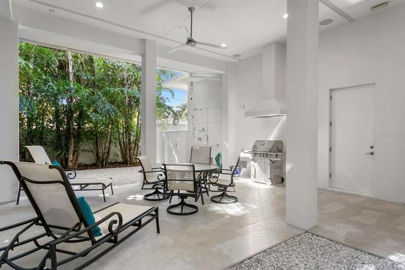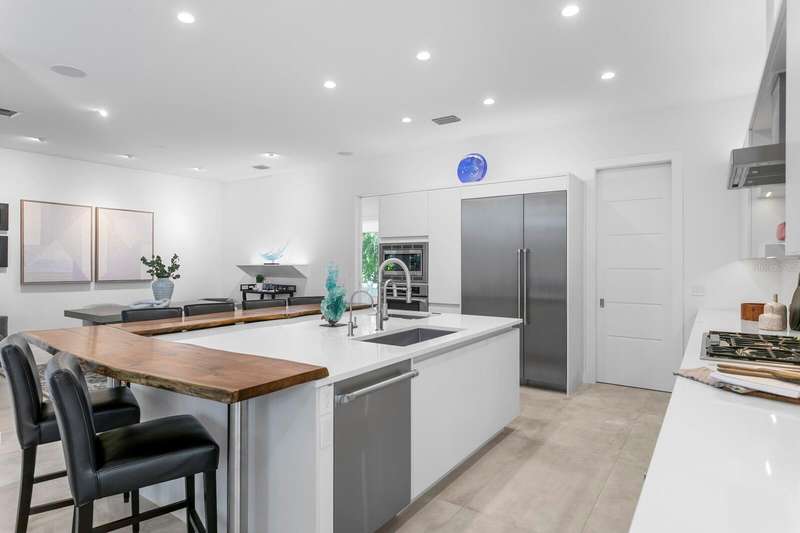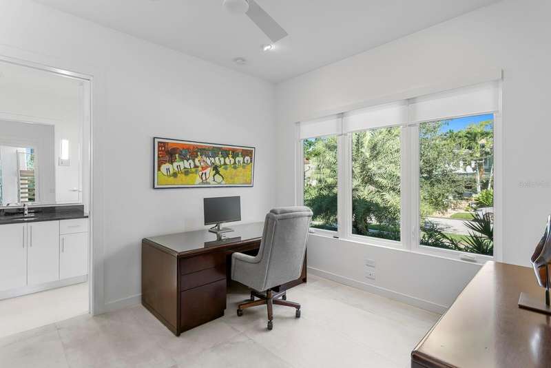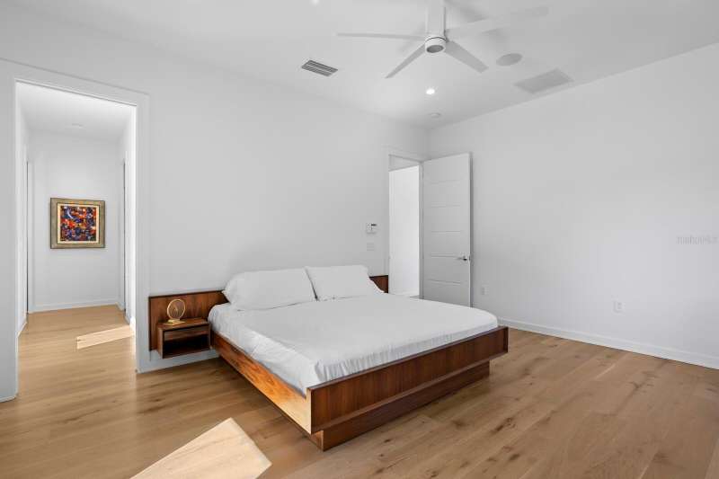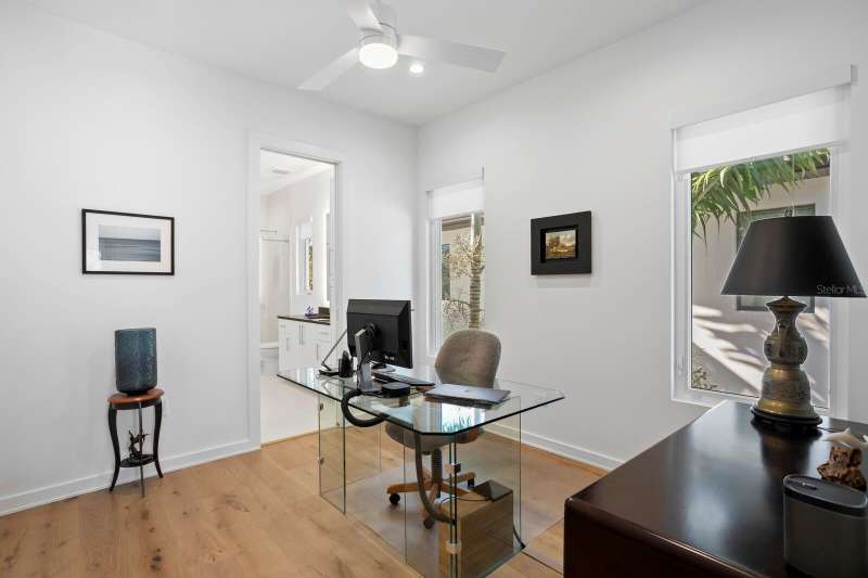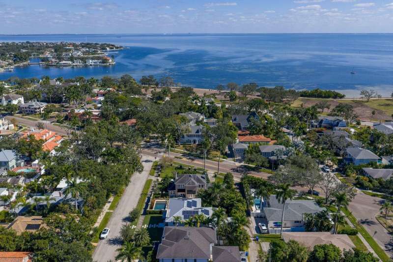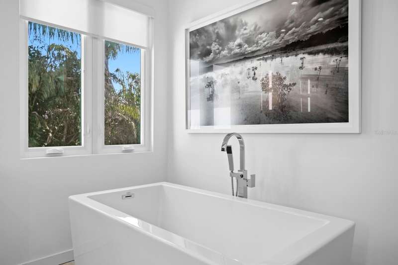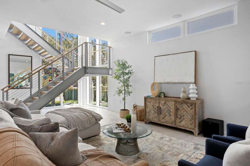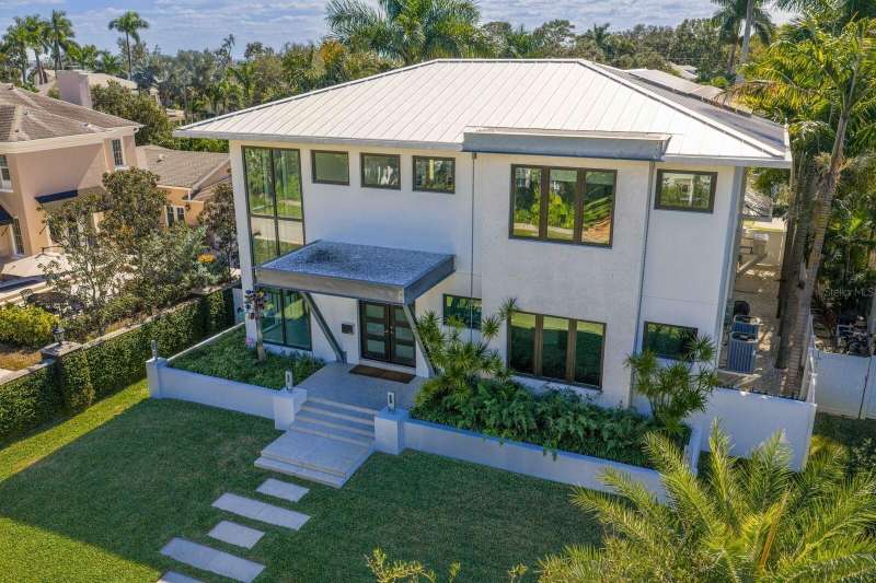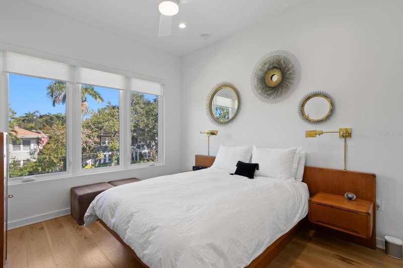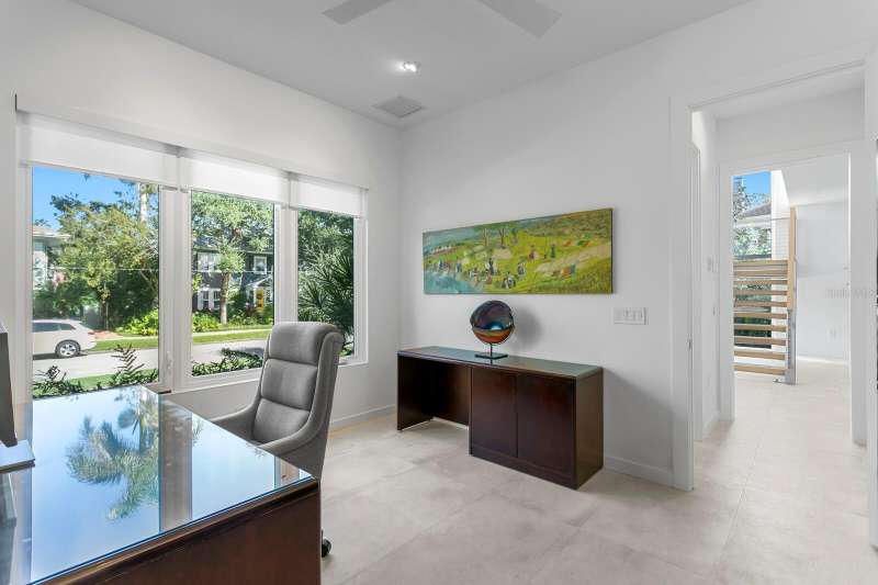 What if you could have modern construction in the hottest historic neighborhood in town? Tree canopies and hex block sidewalks, and holiday spirit beyond imagination? Blocks from the 3rd longest waterfront park system in North America, minutes from vibrant downtown, this “front porch neighborhood” is one of St. Petersburg’s most popular. Step into refined elegance in this custom-built Devonshire home, blending contemporary sophistication with cutting-edge efficiency. Soaring 10-foot ceilings, vast windows, and a striking floating staircase set the tone for the home’s upscale ambiance. The open-concept great room with porcelain tile flooring connects living, dining, and a sleek kitchen that features Thermador appliances, a natural gas cooktop, quartz countertops, a beverage refrigerator, and reverse osmosis water filtration, in addition to a large walk-in pantry. A dramatic live-edge wood dining counter adds warmth and character to the central island. There are four en suite bedrooms, including one on the main level (currently used as an office) that would be ideal for a guest suite. The upstairs primary suite features a luxurious bath with dual vanities, a soaking tub and separate large dual-head shower. There are two large walk-in closets and a Juliet balcony. Two additional bedroom suites are located on this upper level, along with a very functional laundry room. Engineered hardwood flooring on the upper level lends charm to the minimalist style. Step outside to a large covered lanai with a tranquil water fountain, wired and plumbed for an outdoor kitchen. Florida-friendly landscaping and privacy-enhancing masonry walls and vinyl fencing make this a wonderful space in which to relax. Plans for a pool are available, and the oversized 600 sq ft alley-access garage provides ample storage. A spacious mudroom offers even more storage and convenience. Built to current hurricane standards, this home features filled-block construction, Icynene spray foam insulation, a standing seam metal roof, and hurricane-rated windows and doors. Smart home systems include Sonos speakers (indoor and lanai), smart thermostats, Cat-6 wiring, LED lighting, and a dedicated technology closet. A Generac whole-home generator, owned solar panels, and two tankless natural gas water heaters ensure energy efficiency and peace of mind. Located in a neighborhood known for its charm and community spirit—with a voluntary HOA – this is more than a place to live; it’s a place to thrive. Come experience why St. Petersburg makes international headlines as a destination for arts, culture, dining, outdoor recreation and much more.
