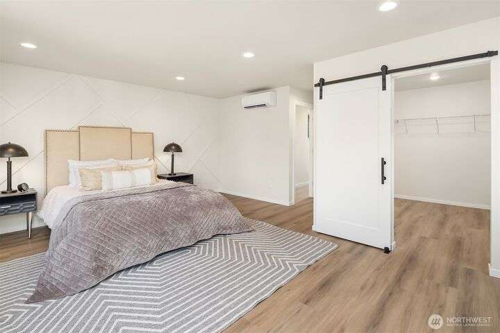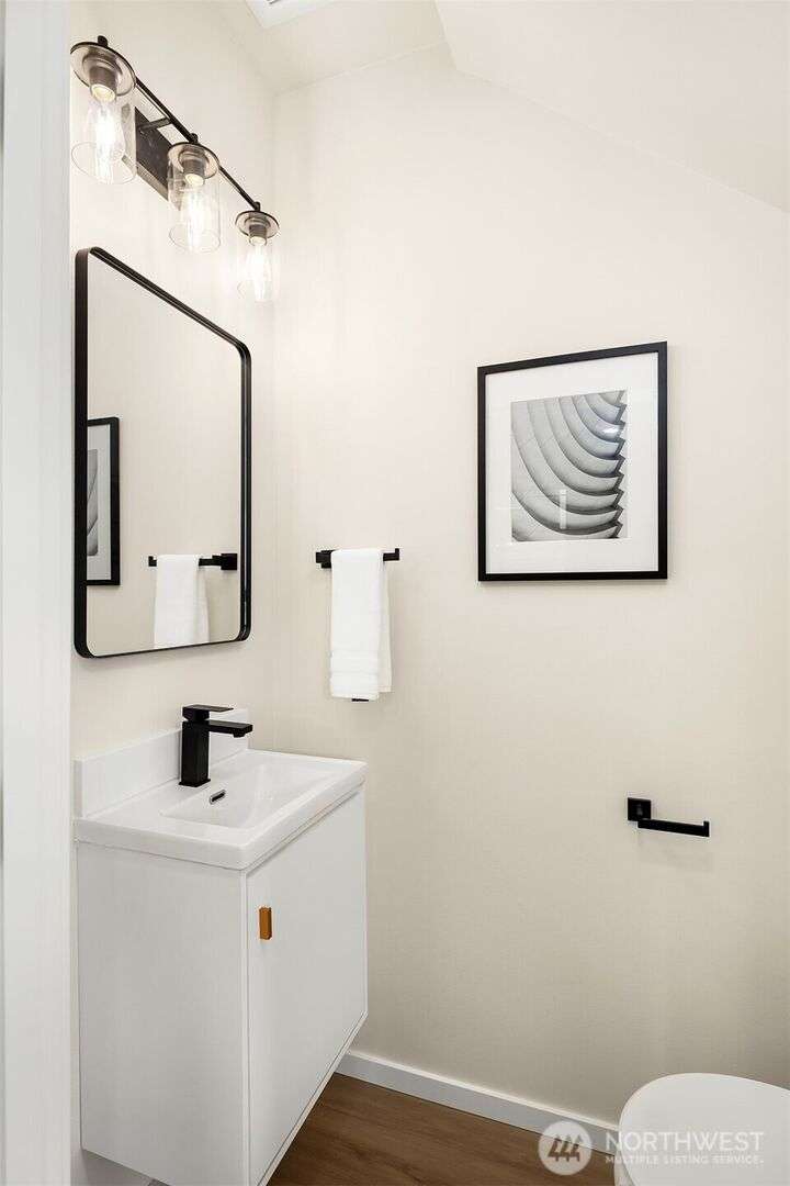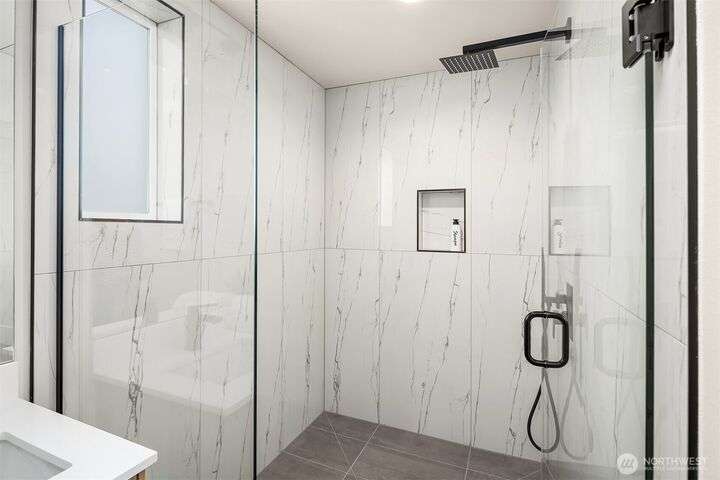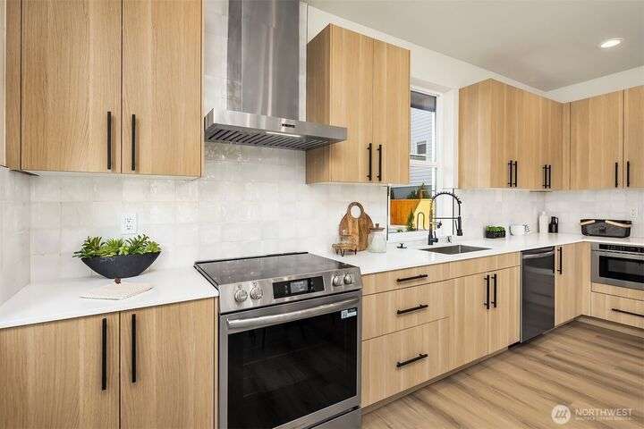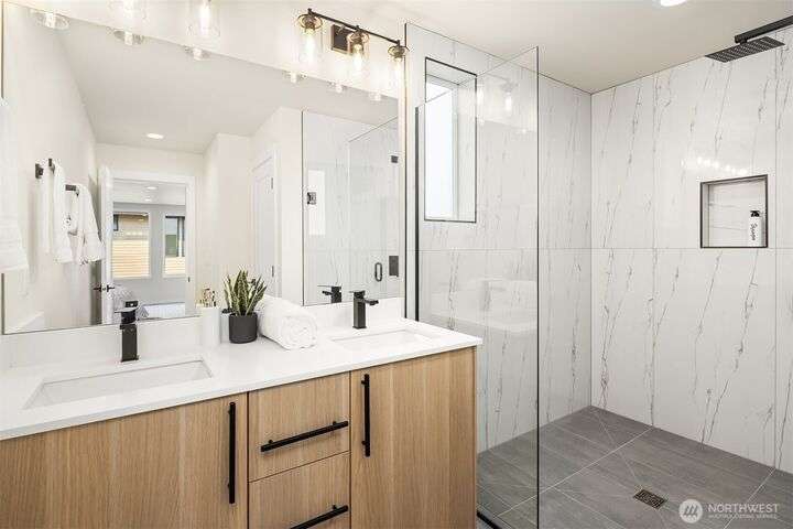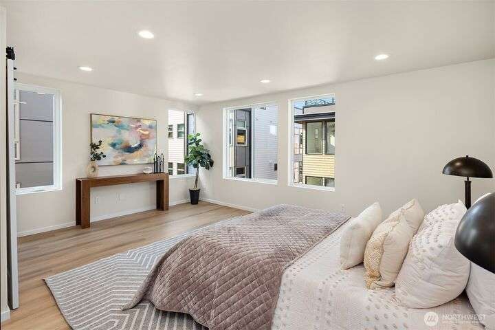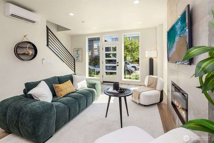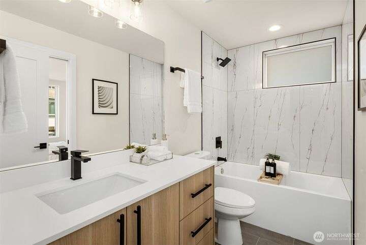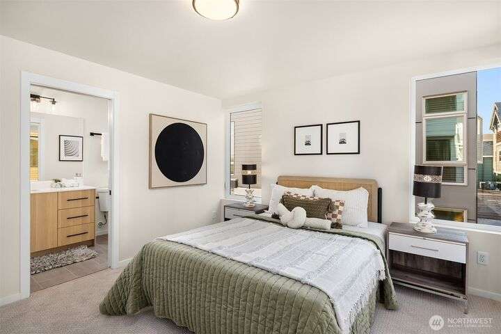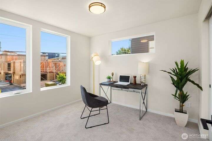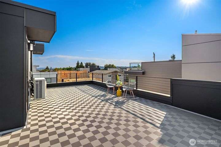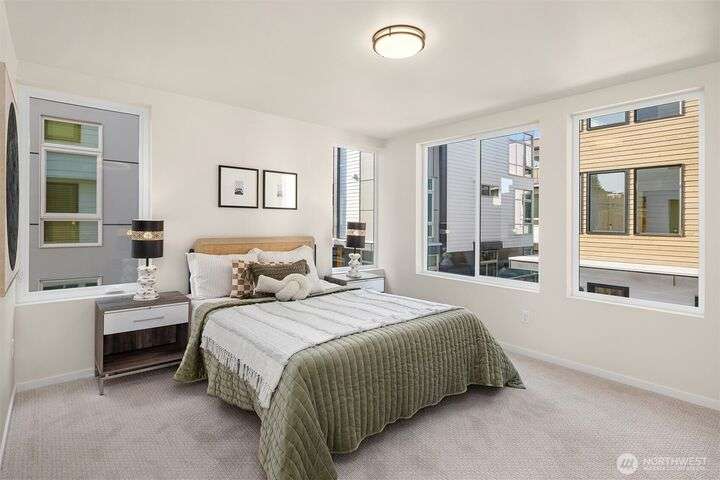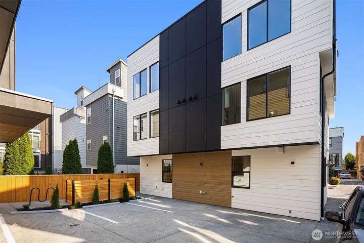 From Modern Homes, a new Ballard townhome community. Flooded with natural light, this end home boasts contemporary finishes & thoughtful design elements. Functional open concept living space, plus convenient powder room for guests. Second level offers flexibility with two bedrooms & full bath. Primary suite enjoys total privacy, occupying entire top floor. Expansive rooftop deck is a serene oasis perfect for a low maintenance outdoor escape. Situated moments from the heart of downtown Ballard: immerse yourself in the vibrant culture of local breweries, the Ballard Farmer's Market & the Shilshole waterfront. Convenience meets luxury with assigned off-street parking and nearby transit stops, ensuring effortless commuting.