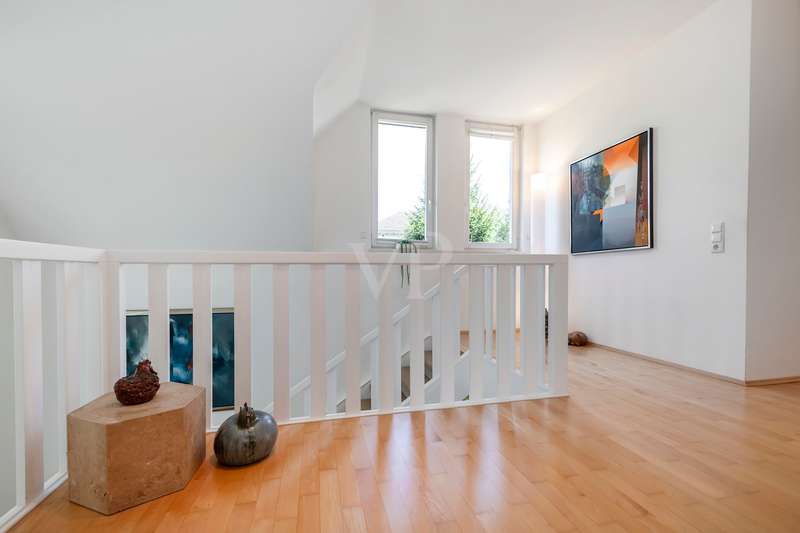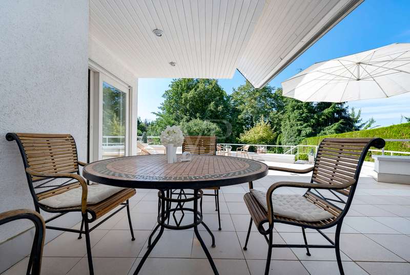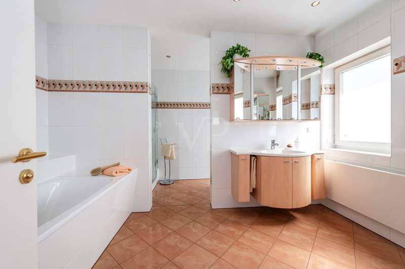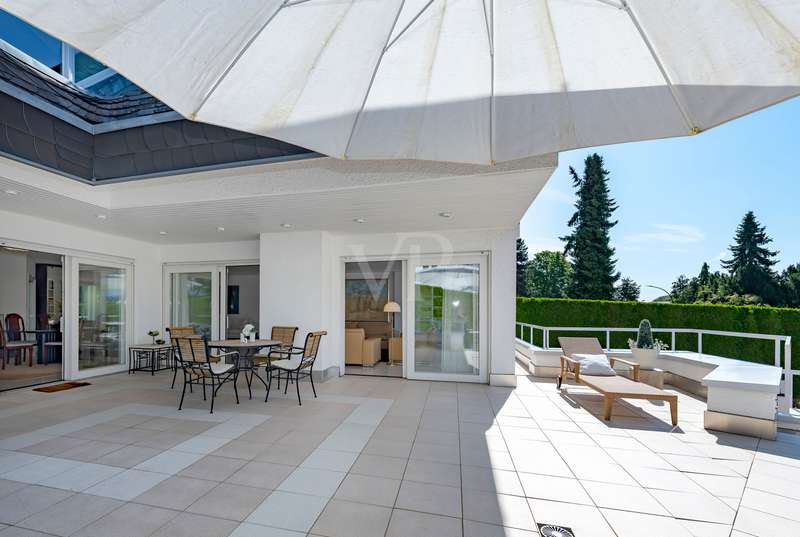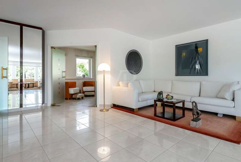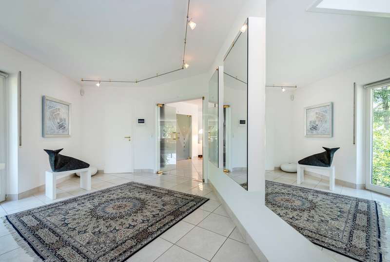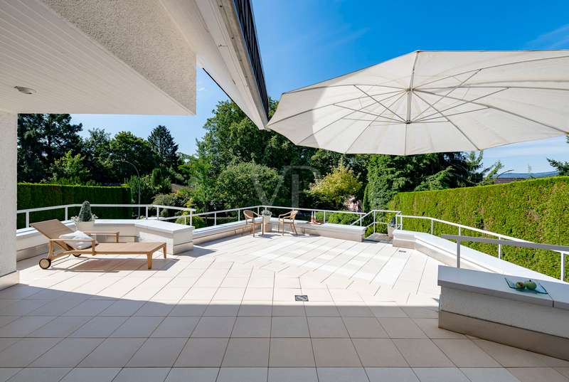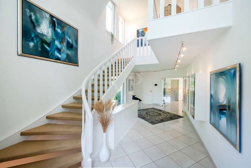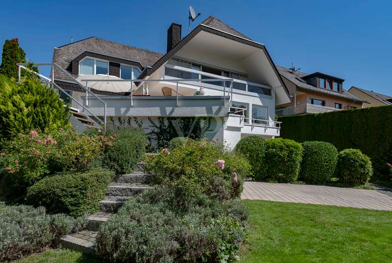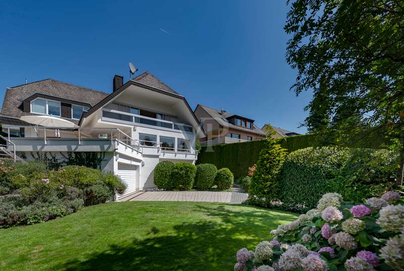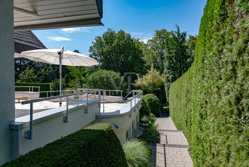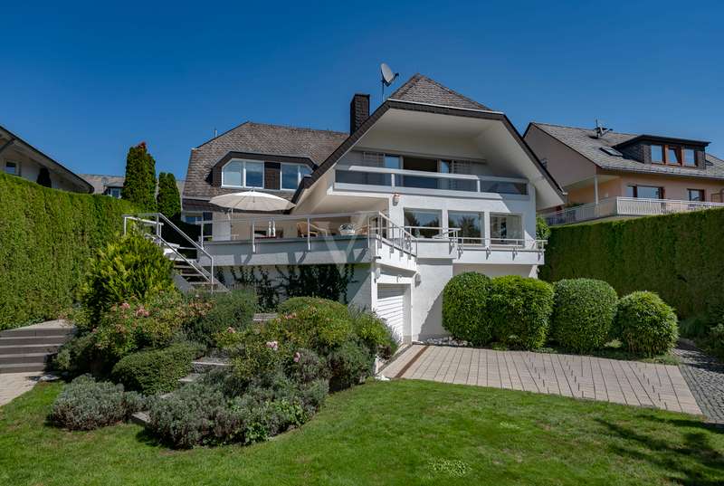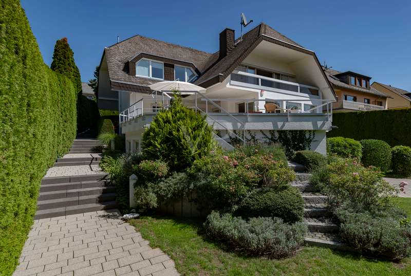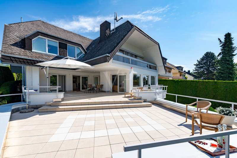 Where character meets space and tranquillity... in this prestigious, timeless entrepreneur's villa you will find not only imposing elegance but also sufficient privacy, both in the house and on the tastefully landscaped grounds! Are you looking for an individual retreat in a quiet location? Then you will find your time-out from everyday life with your large family here in Georgenborn. In addition to generously proportioned rooms and fascinating views and light axes, this home offers you plenty of space for family members, a home office, guest or leisure area.... You will be impressed by the timeless, functionally sophisticated room layout, high-quality materials and the beautifully landscaped plot around the two terrace levels! The entrance floor with its representative character impresses with its spacious, open living area with its unobstructed views of the lush garden. From here you can access the two split-level terraces of almost 100m² - the ideal starting point for summer celebrations... The functional kitchen can be extended at any time and, in addition to the practical study or TV room, you will of course also find a guest WC on this level. On the upper floor, the family has their private retreat, master bedroom with master bathroom, dressing room and 2 further rooms for the children as well as a smaller shower room. On the garden level, which can also be accessed through the double garage, there is a spacious granny apartment with its own terrace, kitchen solution, shower room, bedroom and living area with its own access. The highlight of course is the private spa area with a wonderful indoor pool and sauna area - here you can relax from everyday life all year round! Of course, there are also various cellar rooms and a double garage! You enter the property through the electric gate. Please understand that we may request a credit report from you before viewing and look forward to receiving your inquiries!