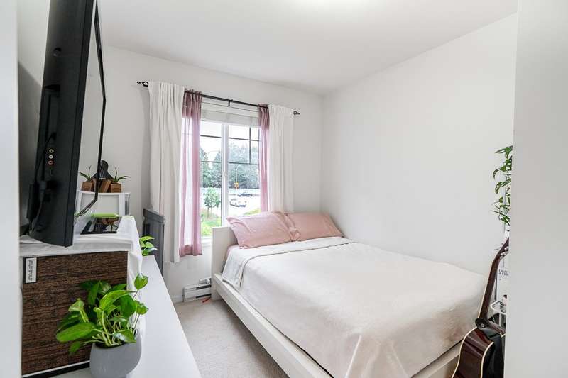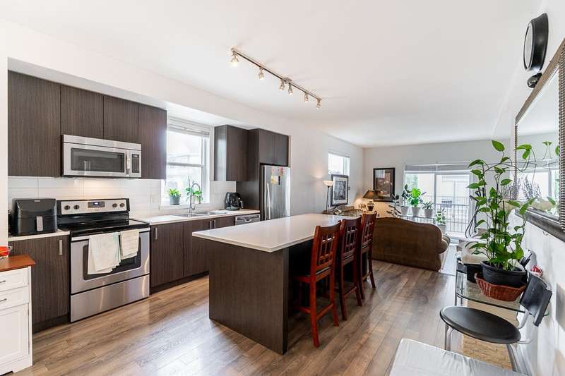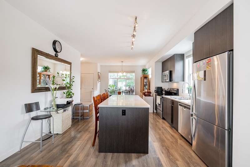 Location & Convenience of KINGS LANDING II built by Dawson & Sawyer hosts this END UNIT 4 Bedroom / 3 Bathroom / 1600 sq ft townhome with FRONT DOOR ENTRY on MAIN LEVEL. Modern finishes including quality laminate flooring; open concept kitchen with lots of cabinetry, oversized quartz island & SS appliances; step down living room to walk out spacious balcony on main. Family floorplan with Primary bed/ensuite and additional two bedrms with laundry upper level plus handy one bedroom (or rec room) with full bathroom on the lower level with a double side by side garage! Bring your two furry pets and rentals allowed. Just outside complex is transit stop that is minutes away from the main KG Skytrain station- Close by to Bear Creek Elementary, shopping, Bear Creek Park, etc etc!!