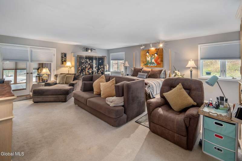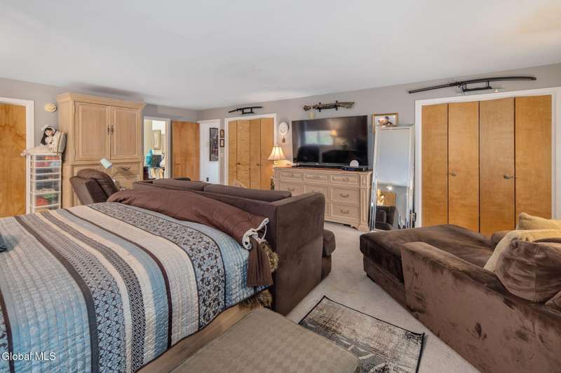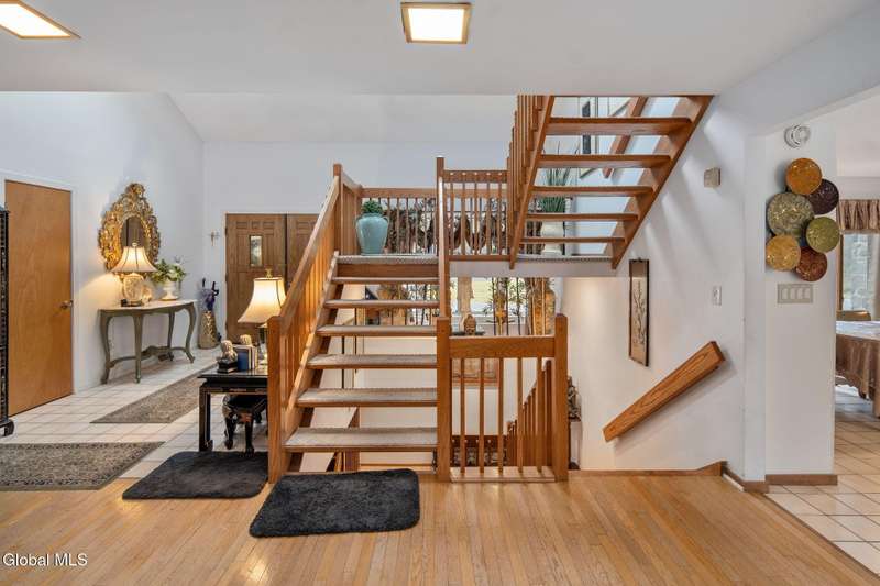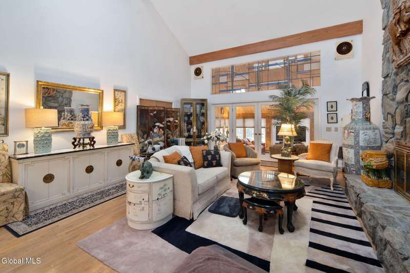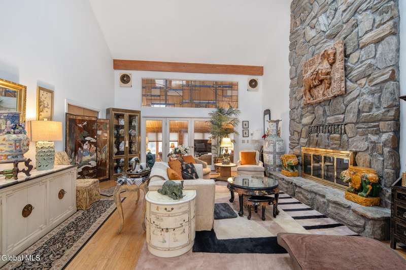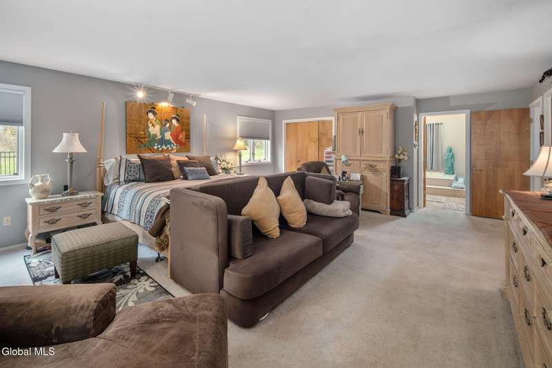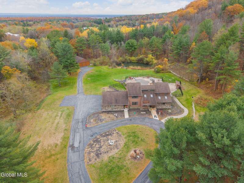 Experience the Perfect blend of luxury, comfort, & privacy in this stunning contemporary estate set on 28.17 acres. This spacious 4,333 sq. ft home features 5 BR, 4 1/2 baths, including a main-level primary suite w/generous closets, & beautifully appointed bathroom. The open Kitchen is ideal for entertaining. The great room with an entertainment center, wet bar, & pool table- perfect for gatherings and relaxation. Step outside through French doors to enjoy the inviting inground saltwater pool. Car Enthusiasts and hobbyist will appreciate both the attached 3 car garage, & 3 car detached garage that holds 6 cars, while the greenhouse offers exciting potential for gardening. Energy efficiency is a highlight, with OWNED Solar panels and a propane tank providing independence and savings. (Attached garage solar are rented) Recent updates include blue stone front retaining wall, newer sidewalks, foundational work, fresh exterior paint (2023), a newer awning, 2 new garage doors (attached) and accessible ramp to the front entrance. This Property is a rare opportunity for those seeking unique amenities, expansive grounds, private retreat.