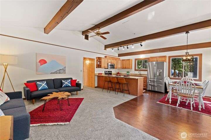 This charming 2-bedroom, 2-bathroom cabin in the Ponderosa Community has motivated sellers. The cabin has an open living room, kitchen, and dining room space perfect for entertaining. The property offers a detached garage, an outbuilding, and a flat lot with an RV parking structure. Residents enjoy access to community amenities such as a pool, playground, clubhouse, and riverfront access. The property is conveniently located in the Plain community and is near local attractions like wine tasting, gift shops, restaurants, a hardware store, and outdoor activities. It's ideally situated about 30 minutes from Stevens Pass Ski Resort and downtown Leavenworth.