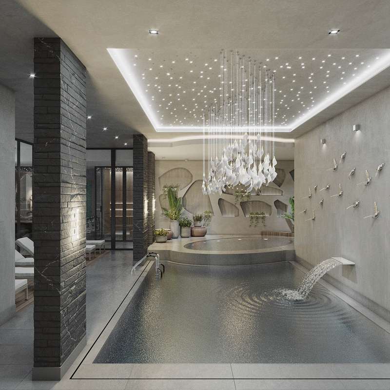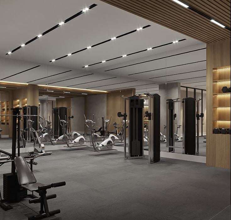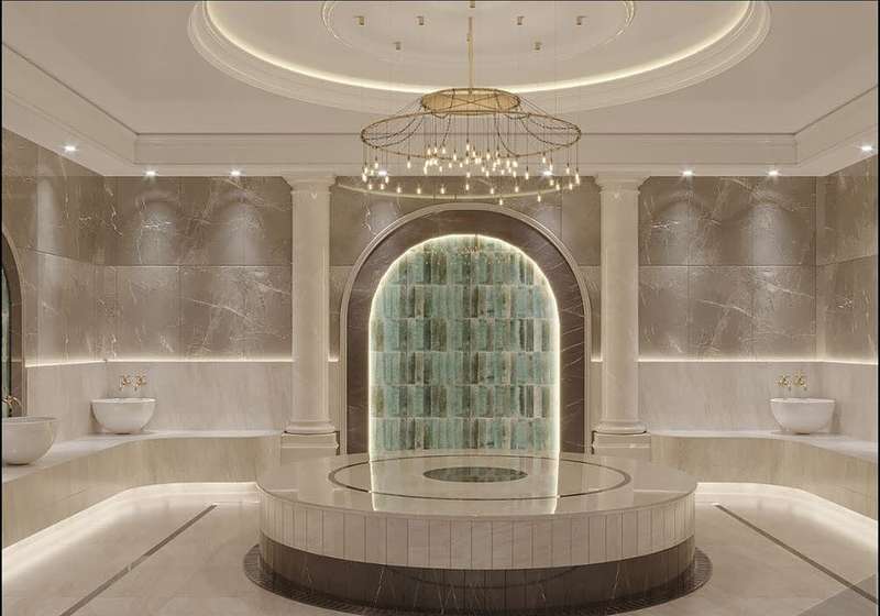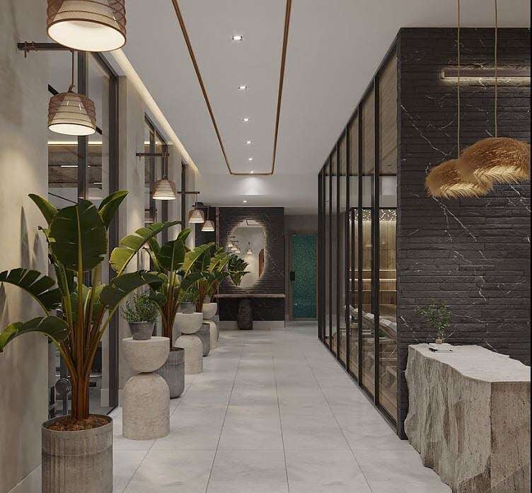 The single-block complex spans an area of 2553 m² and features an array of amenities, including indoor and outdoor swimming pools, a jacuzzi, gym, sauna, massage rooms, Turkish bath, steam room, entertainment room, outdoor parking, BBQ area, communal garden, janitor services, and 24/7 security.