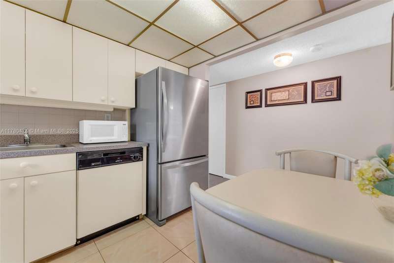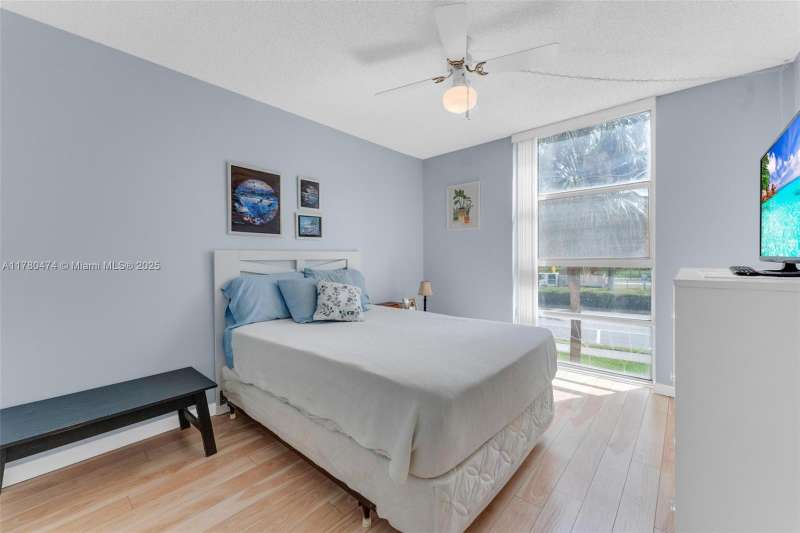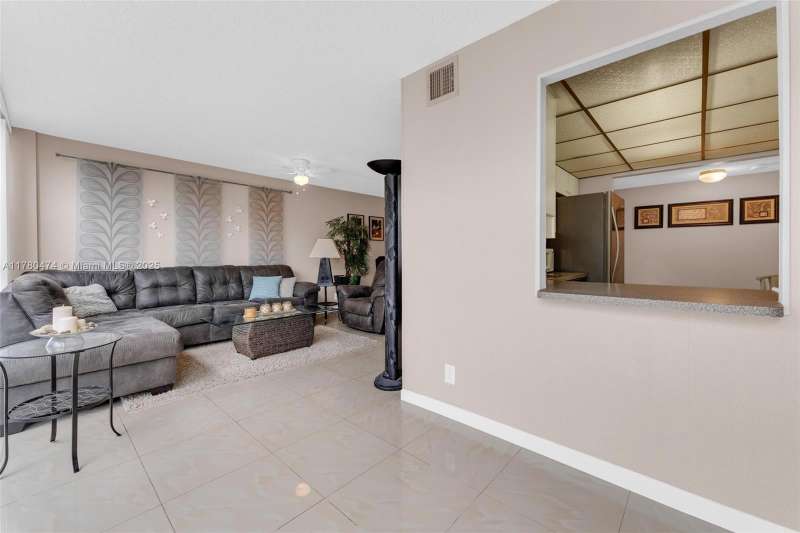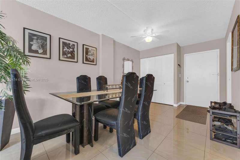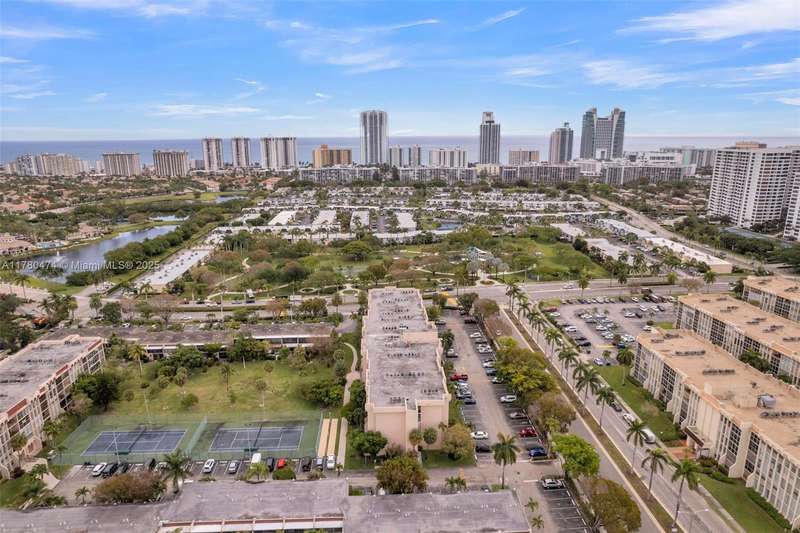 This corner unit features two bedrooms, one full bathroom, and a half bathroom, spanning 1,200 square feet of living space. The floor-to-ceiling windows provide ample natural light, while the tile floors and screened-in balcony add to the modern aesthetic. Cable TV and internet are included in the maintenance fee. Residents can enjoy the heated pool, tennis courts, sauna, and clubhouse/social room. Conveniently located near Joseph Scavo Park, shopping, and Hallandale Beach, this property offers a perfect blend of comfort and convenience.